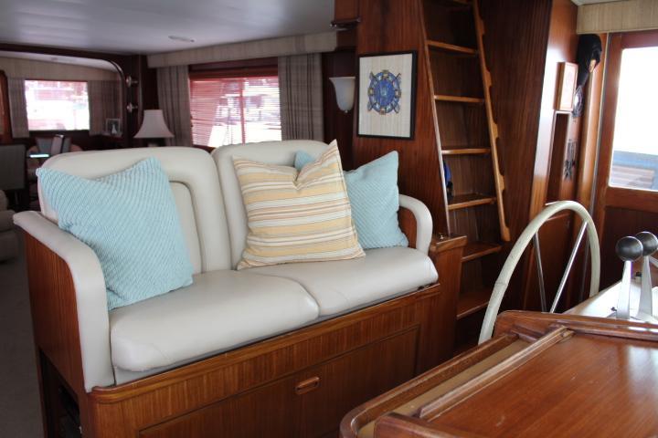 PilothouseThe spacious Pilothouse is a great spot to drive the boat from in foul weather or when in tight quarters. It is great for Cruising or Docking the boat. Visibility thru the large side and aft area windows make docking from the lower station easy. There is no separation wall between the pilothouse and the Salon making it very open. Additionally, the pilot house doors serve as an easy viewing point when backing into your slip. The pilot house wood has been varnished with a satin finish to give it a richer luster. The pilot house helm seating has been freshly recovered. There is a 6-inch Danforth compass with full chrome cover and Naiad roll control system.