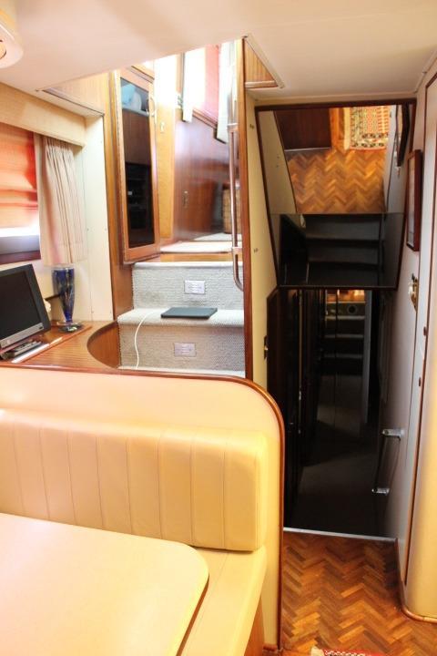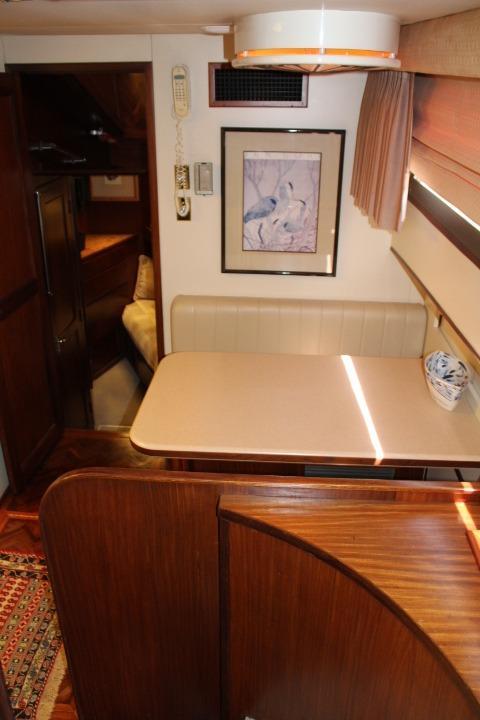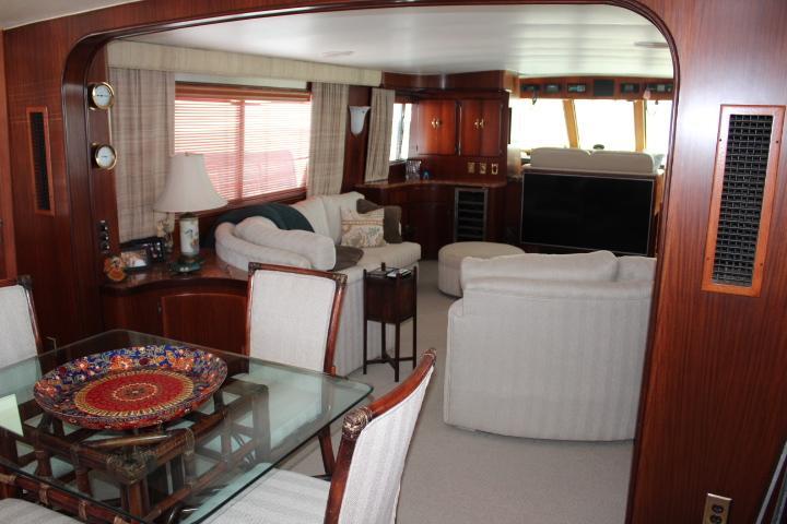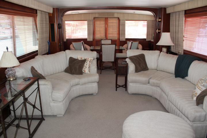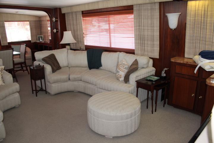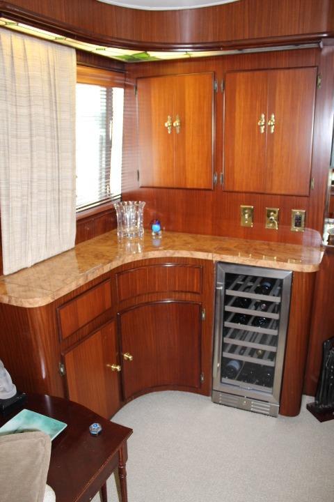 Main SalonThe main salon has wooden blinds with soft padded valences for all the large windows. All the Salon wood has also been varnished with a Satin varnish. It has tan carpeting. A 60-inch tv is mounted on the back of the helm seat area. To port is a circular cabinet which houses wet bar with sink, and bottle holders. There are storage cabinets above the bar for glasses and storage below the bar for bottles. There is a overhead stained glass light fixture over the bar. There is also a wine cooler to the right of the bar. The Salon has two Very Comfortable, semicircular couches, with a separation between them which leads to the aft salon area. There are Weems and Plath Clock and Barometer on the port wall.