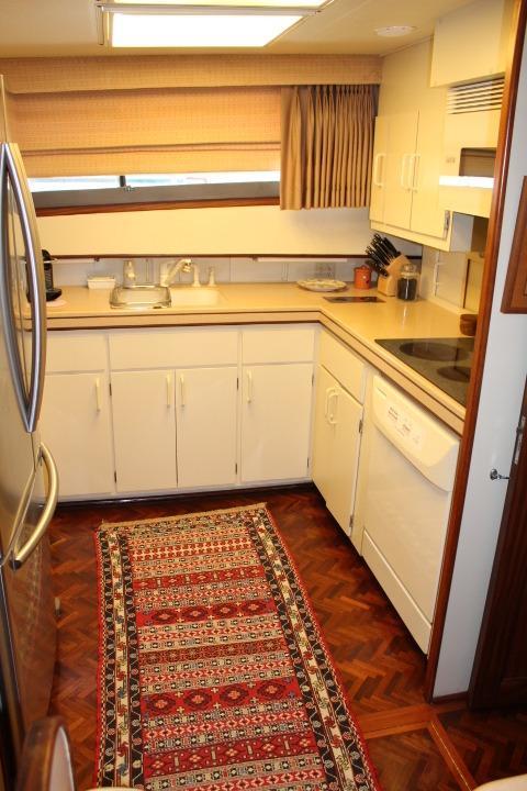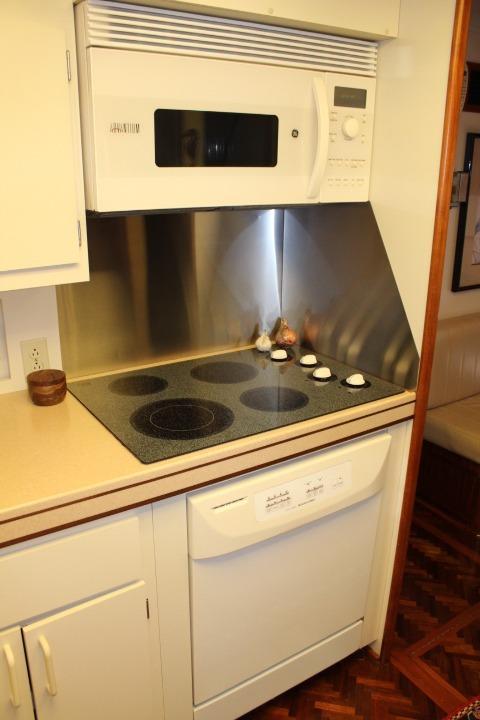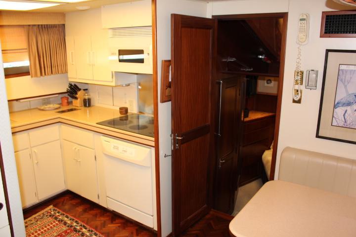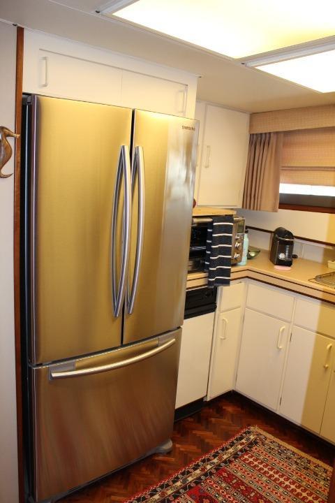 GalleySteps from the pilot house lead down to the spacious galley which features a dinette seating area to starboard. The dinette area will seat four. The dinette table has been upgraded to Corian and there is a Stain glass covered overhead light above the dinette table. There is also a small tv in the galley as well. The countertops have all also been upgraded to Corian with a Corian backsplash and an undermounted sink. There is a Newer Stainless-steel Samsung French door refrigerator, a Advantium microwave oven, Newer four burner cooktop with stainless steel back splash area. There is ample storage in the galley cabinets and drawers. There are windows to port and starboard which slide open. The flooring is wood.