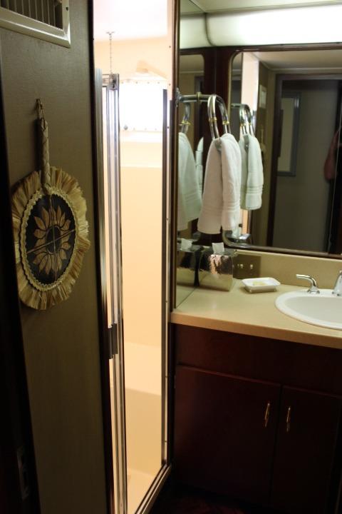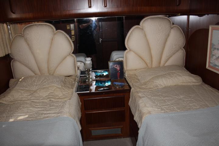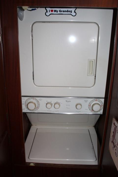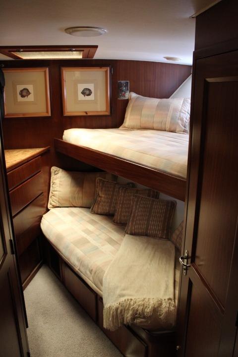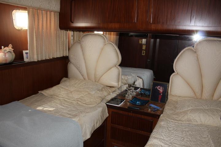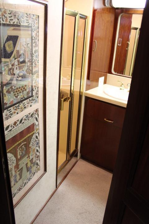 Mid StateroomAft of the galley is a hallway leading to the other staterooms. In the hall to port is the Whirlpool washer and dryer and a large linen closet. The mid stateroom has two beds with headboards and a large, mirrored wall forward. This stateroom has a large closet and storage drawers below both beds. There is also storage forward overhead of the mirror. A flat screen tv is mounted to the closet wall. The Mid stateroom head has a large walk-in shower with bifold doors. An updated Raritan head with freshwater flush, Corian countertop and back splash. There are two large mirrors on the two-sided sliding medicine cabinet. There is also a mirror on the starboard wall. The wallpaper is hand painted.