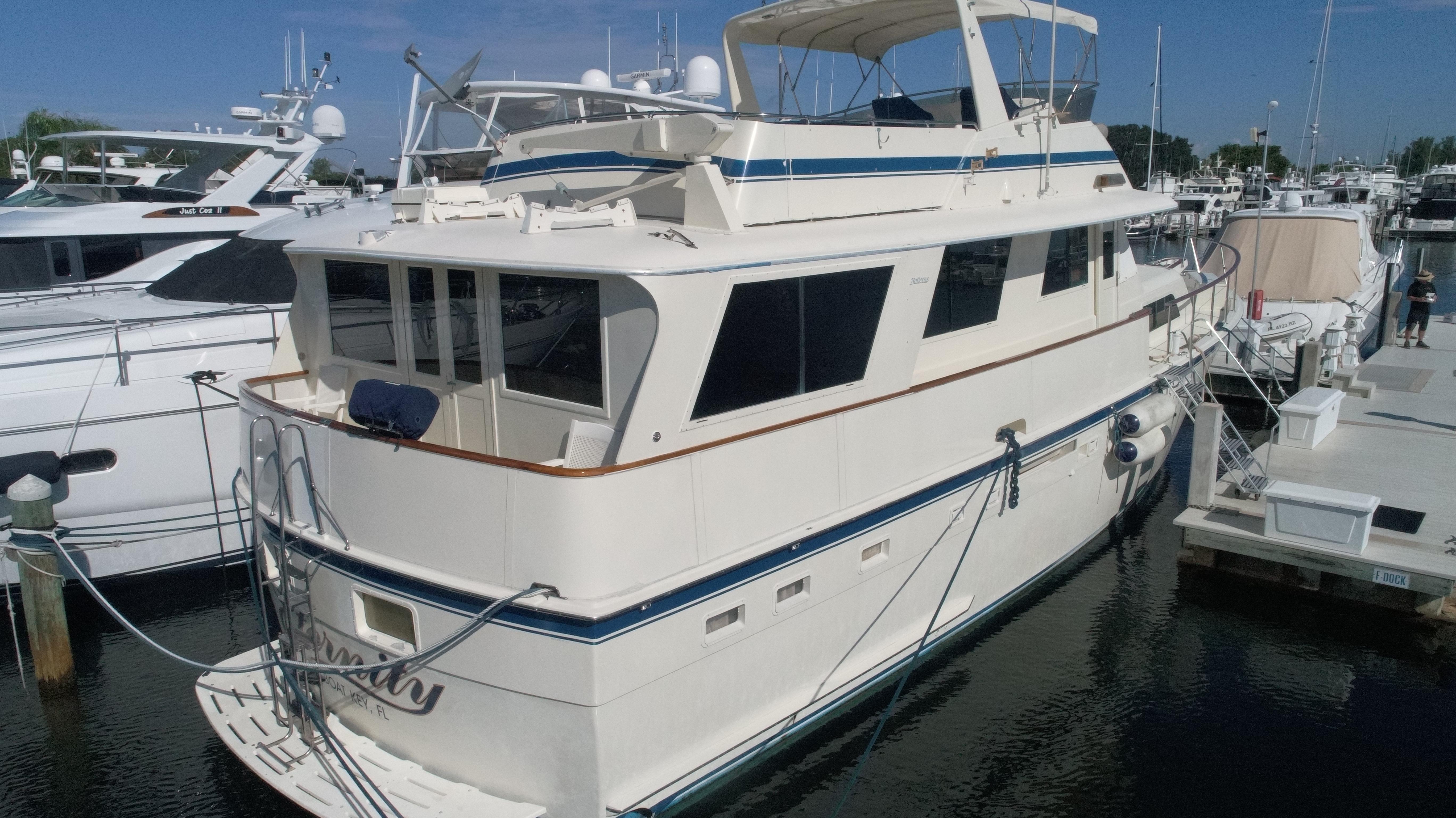 Aft SalonThe Aft Salon of this yacht has been completely enclosed making the usable interior space much greater than most other boats of this size. The fit and finish of the aft deck interior was done in such a way which makes the enclosure look like it was done at the factory. It has been beautifully done in all original Hatteras teak wood. The doors and wall between the main salon and aft deck were removed. The floor in the aft deck was built up so the level from the main salon to the aft salon is all the same level so one flows into the other. The ladder going to the bridge was removed from the aft area and put in the pilothouse area. All the walls have been finished in beautiful satin varnish giving it a rich look with much less grain than a standard Hatteras. To port and starboard are built in buffet cabinets with four glass doors on both cabinets. There is a glass dining table with four chairs in the aft deck and two-barrel chairs. There are sliding windows to port and starboard and blinds for all side and aft windows. There are also doors to port and starboard which lead to the wide walk around side decks. Two doors at the stern lead to the exterior aft area which has a grill and two chairs. An additional independent air conditioner has been added for the aft deck area.