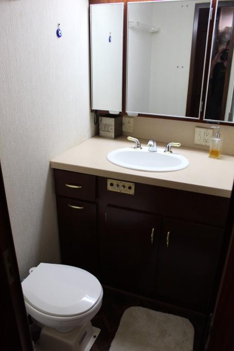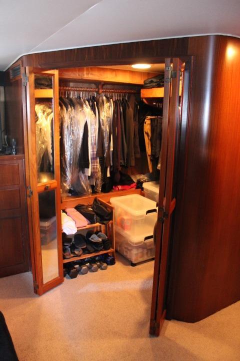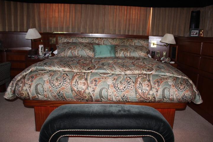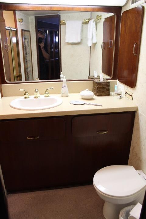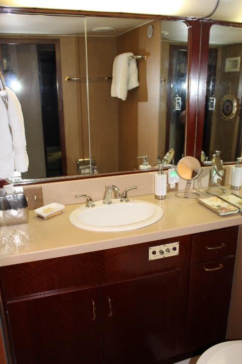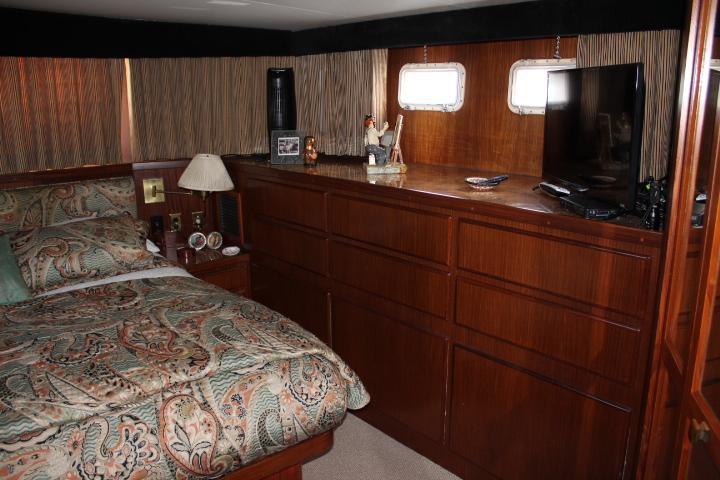Master StateroomGoing aft from the Mid Stateroom is the Master Stateroom. This full width stateroom has several great features, one of which is a full King bed with nightstands to port and starboard. There are also four large drawers under the master bed. Additionally, this stateroom has an extremely large walk-in closet with lots of hanging room and storage. To starboard and forward is another closet to house even more clothes or shoes. There are six storage drawers to the port side of the bed and there are two large drawers on both the starboard and port side of the bed. Aft to starboard is a custom make up table with a lighted mirror. The counter to port has a new 32-inch tv. There are reading lights on both port and starboard sides of the bed. There is a mirror on the starboard wall and a large mirror on the back of the entry door. The Master bathroom has a stand-up shower with a seat and bifold doors. The counters are Corian with a Corian backsplash. There are sliding mirrored doors which have a medicine cabinet behind them. The head has been upgraded to a Raritan head with a freshwater flush. This head also has hand painted wallpaper and carpeted flooring. The cabinets have been updated with wood panels.