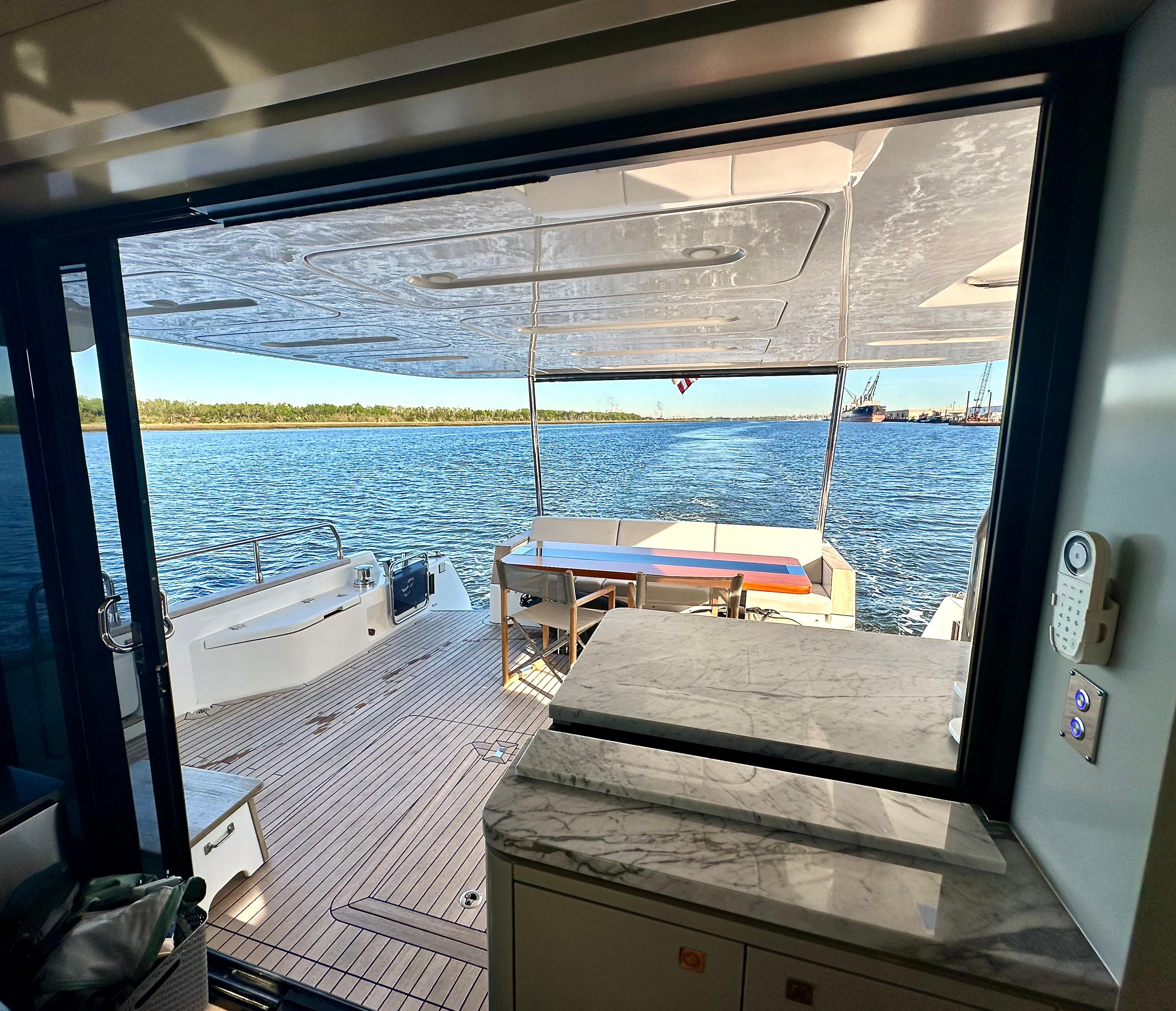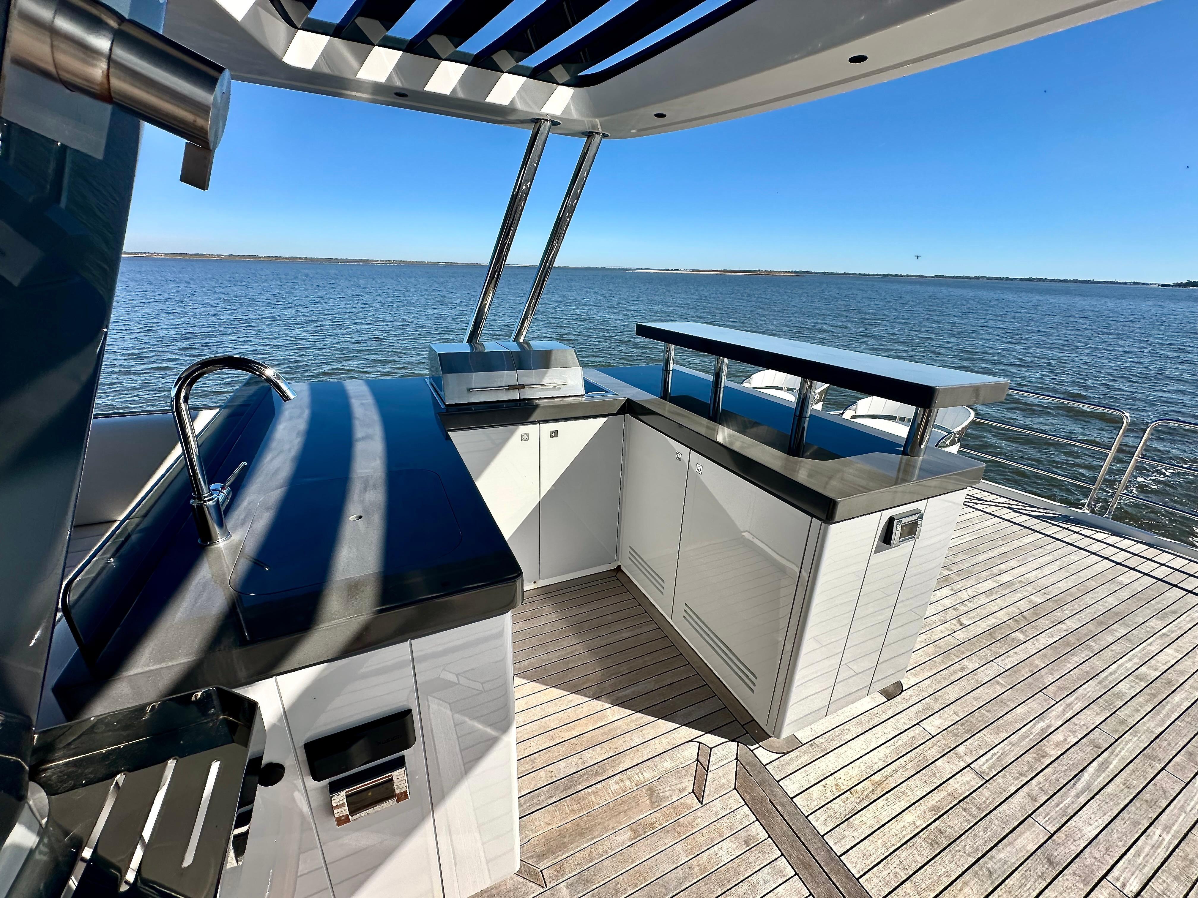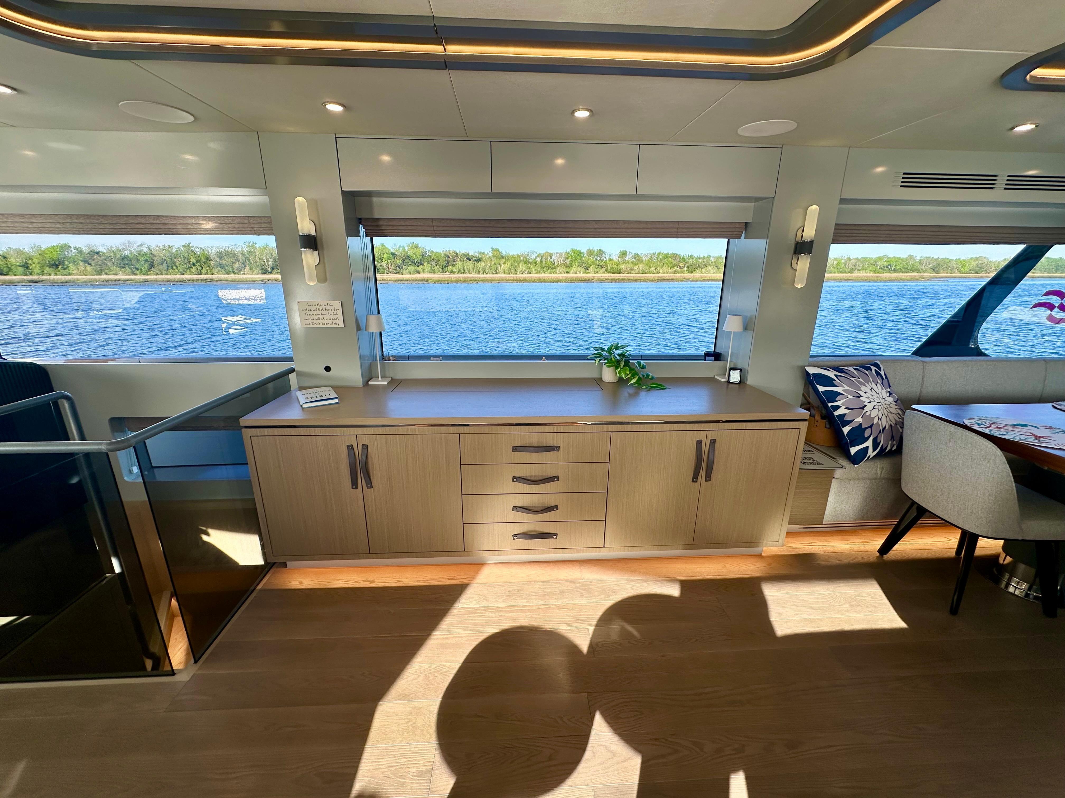 - Galley bar countertop extension to cockpit with electric hi-lo window and storage cabinet
