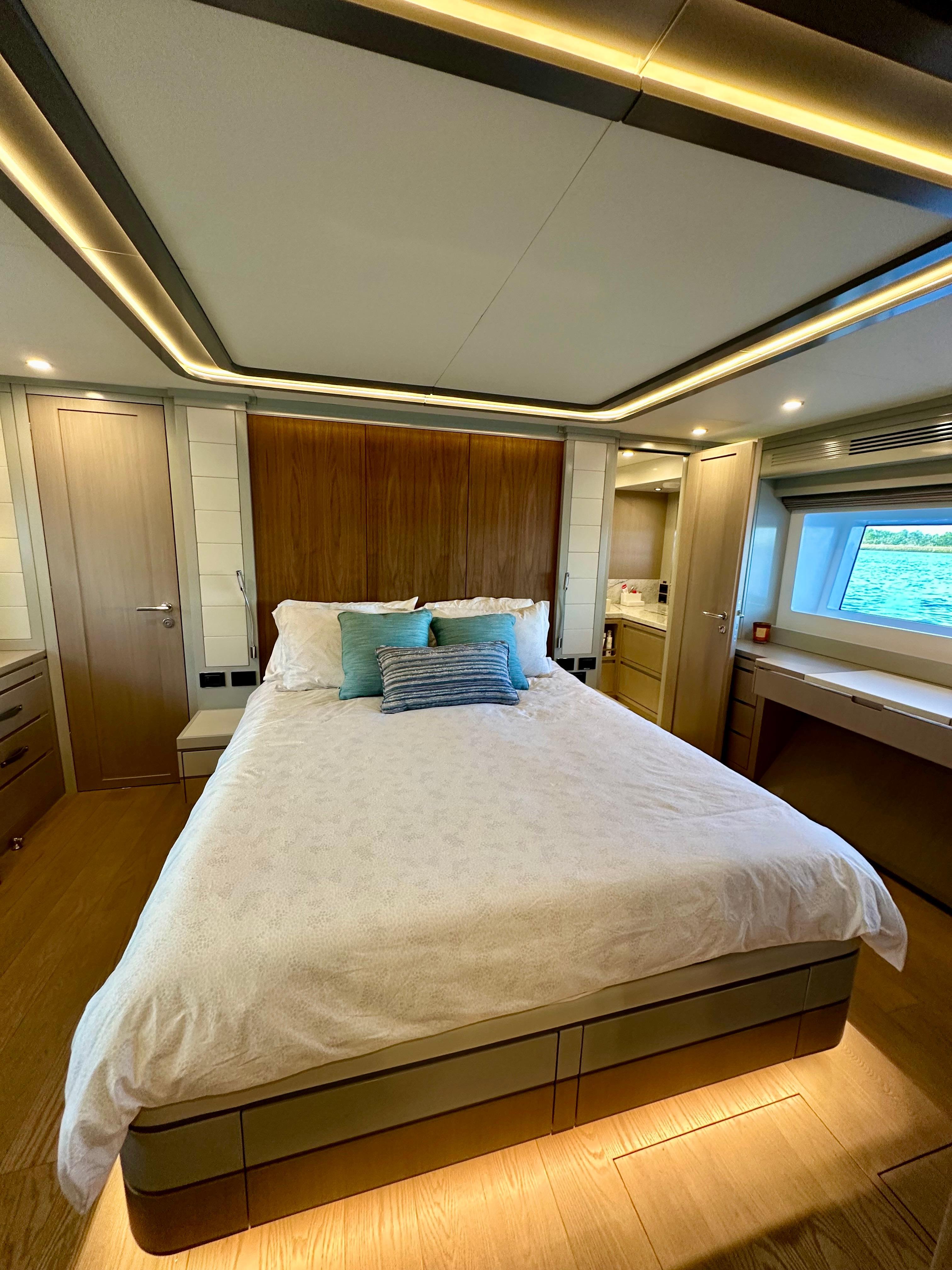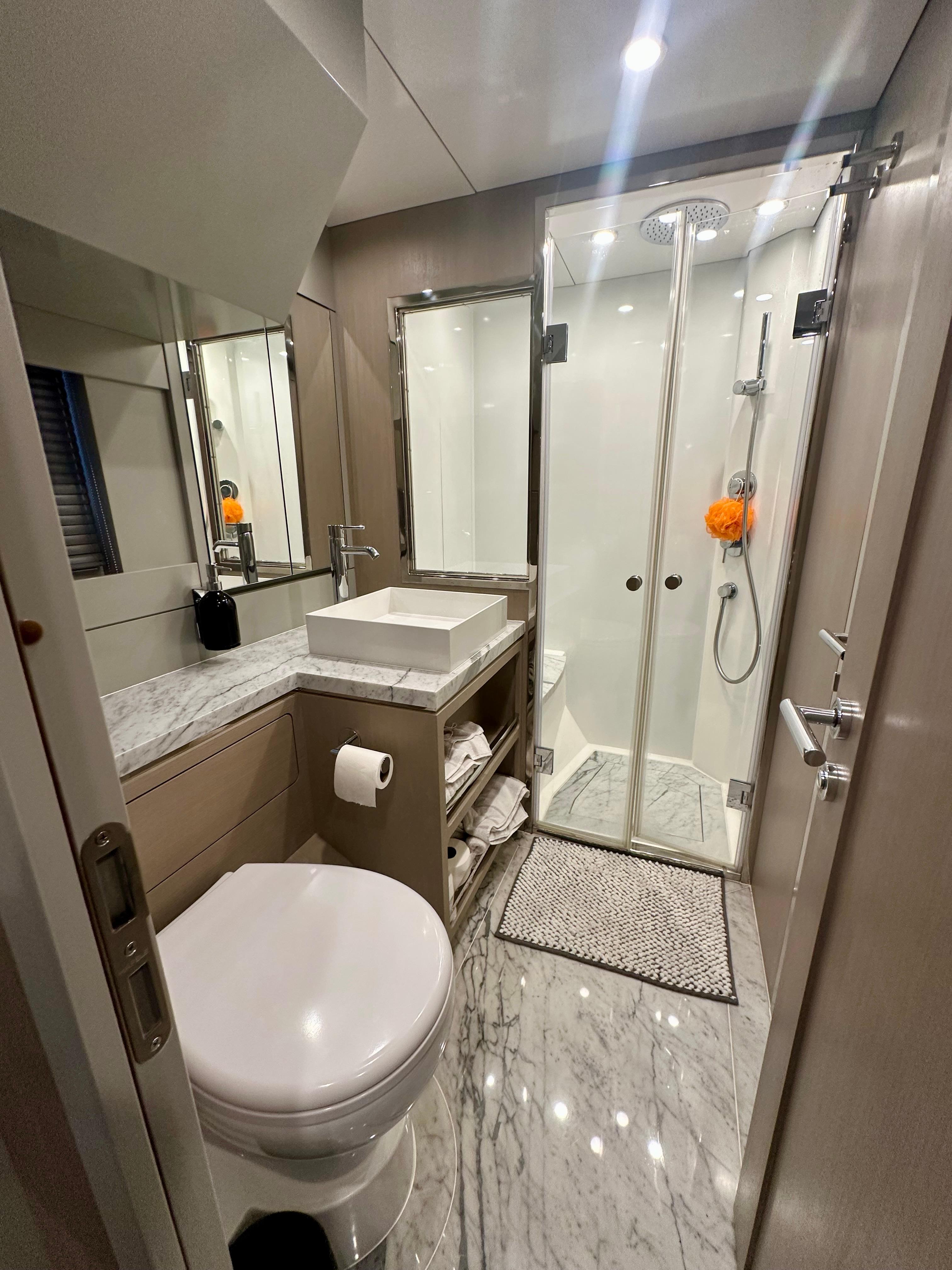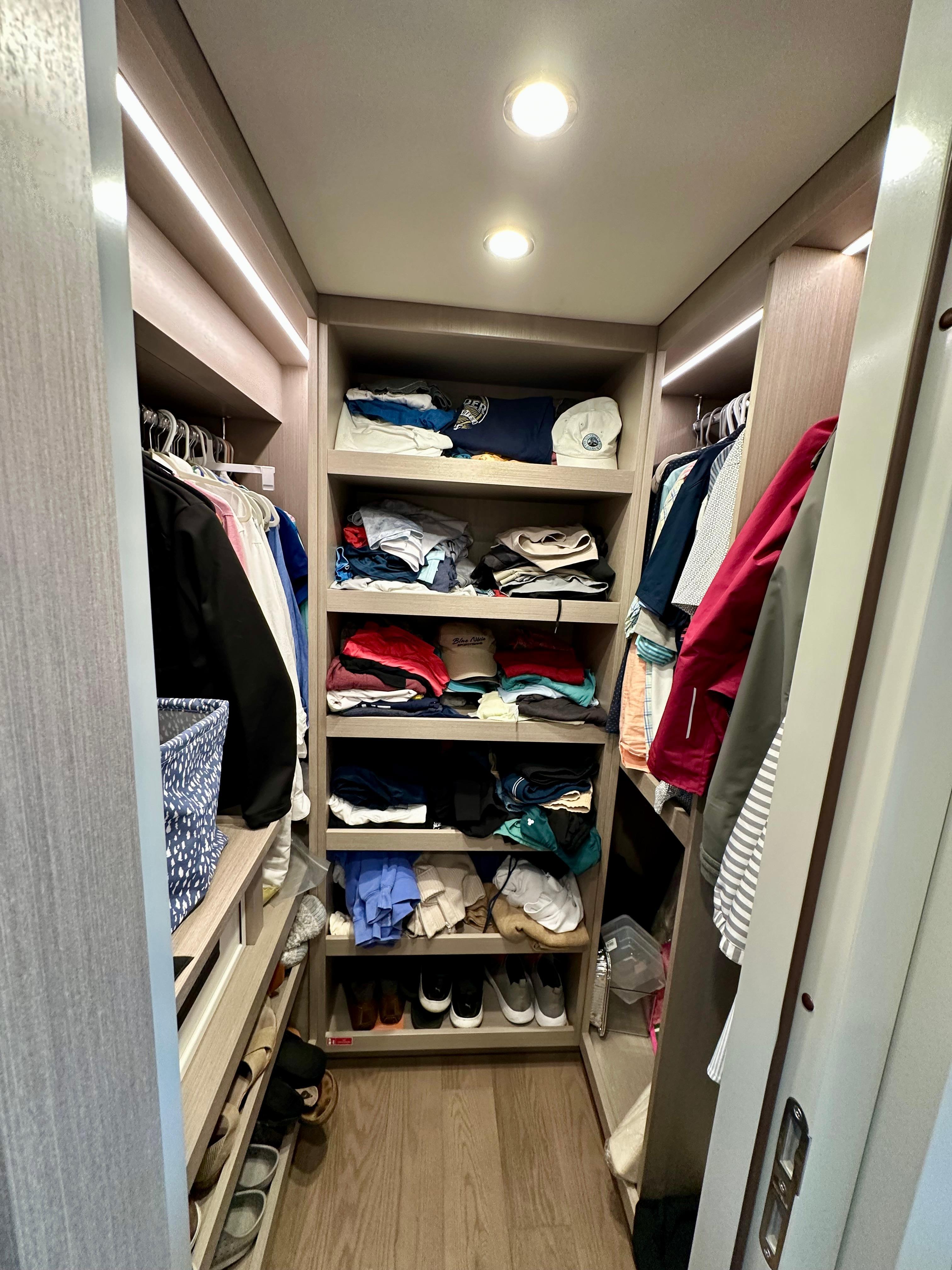 - Master cabinHis and hers bathrooms and one shower. Wardrobes on each side of the cabin