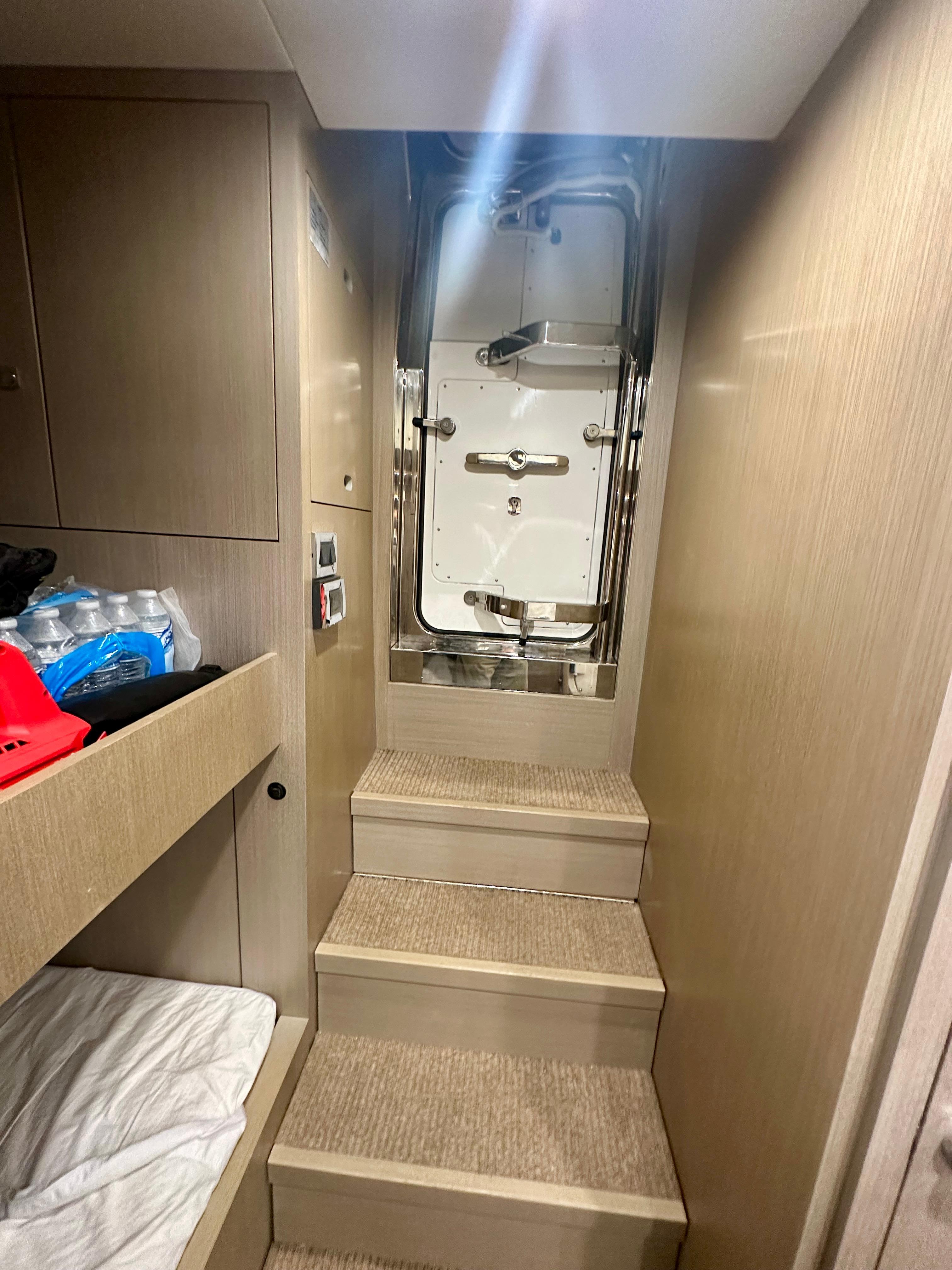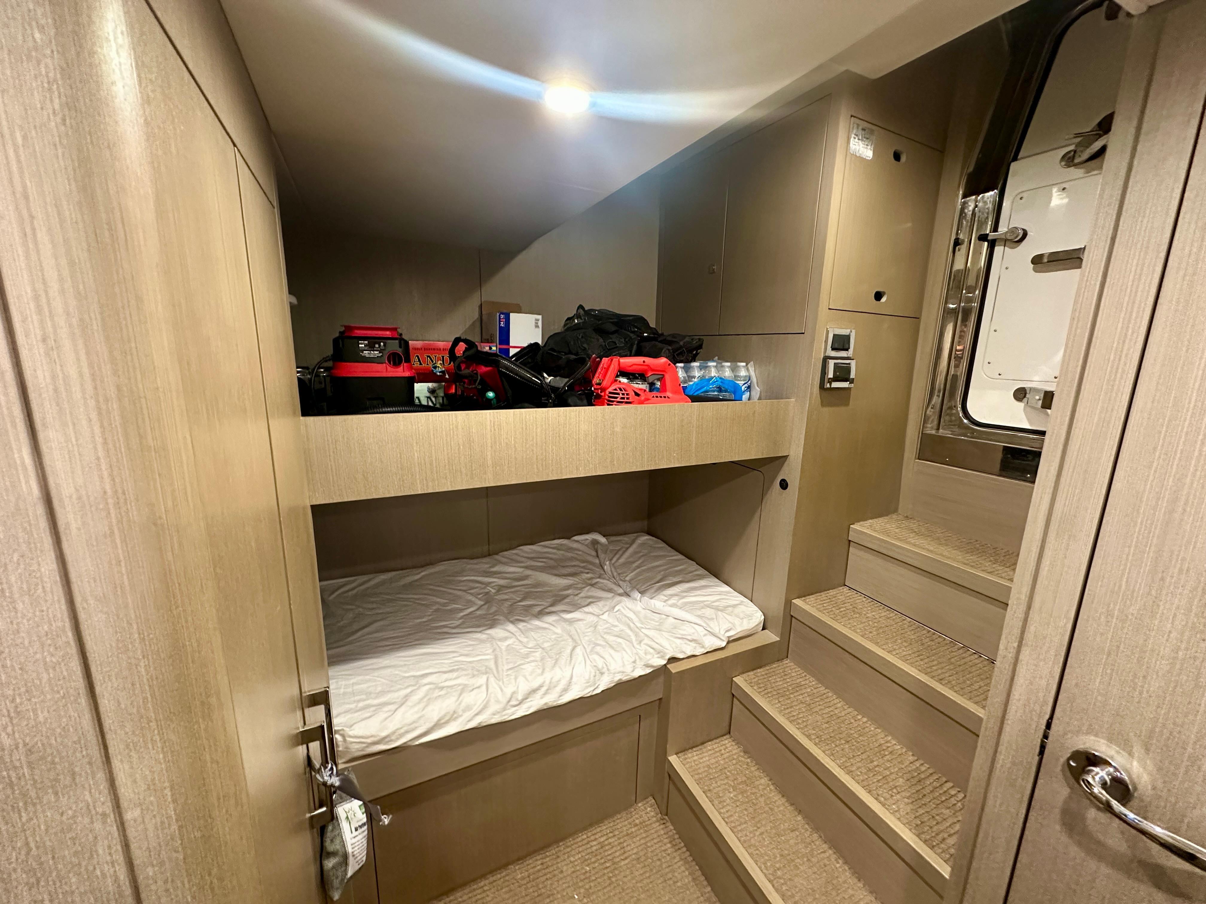 - Crew cabinBunk beds, head, kitchenette, seating bench on the port side, access door to engine room