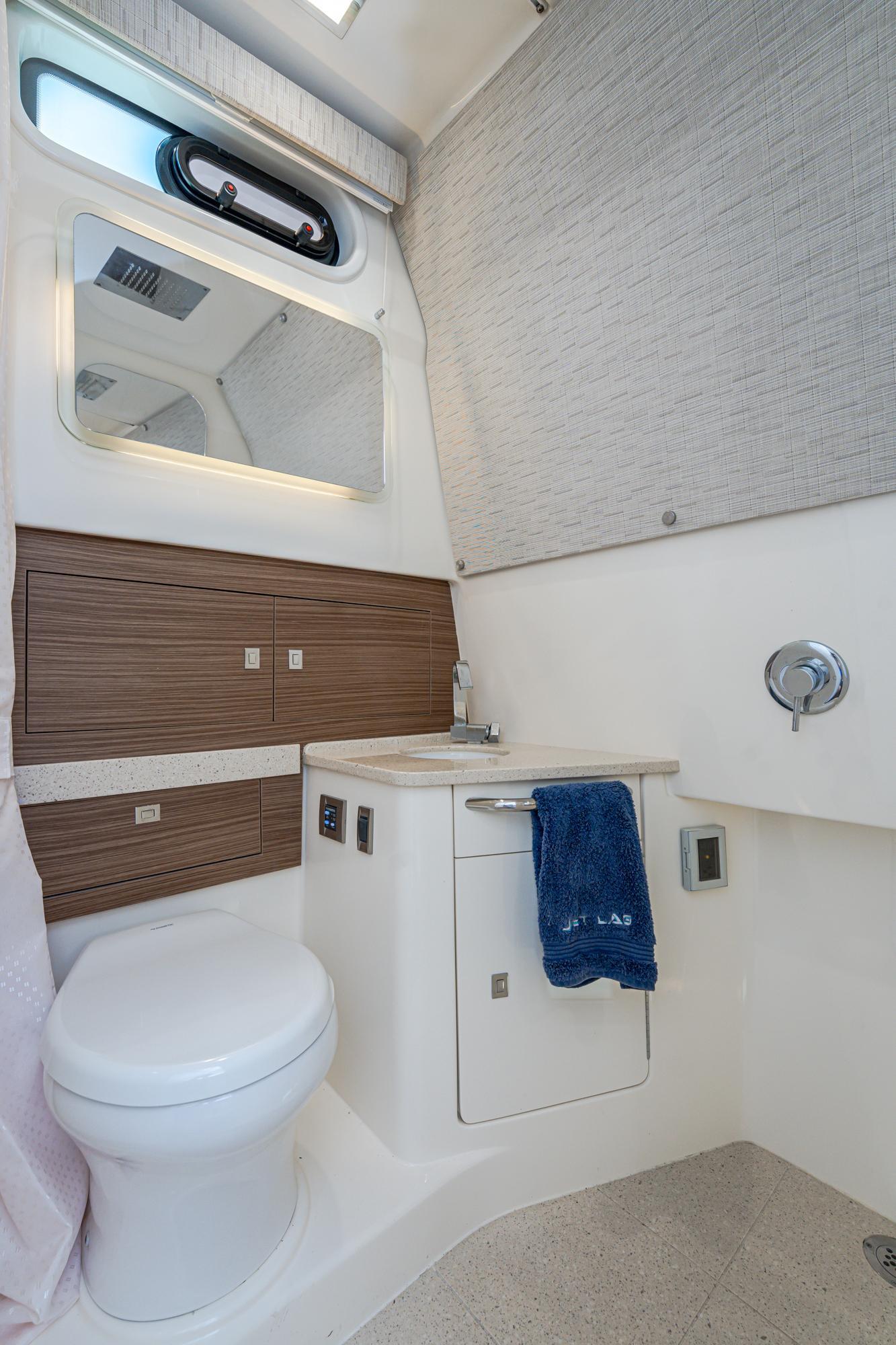 - Electric Vacu-Flush® toilet, holding tank with vent filter, overboard discharge, dockside pump-out and tank level indicator