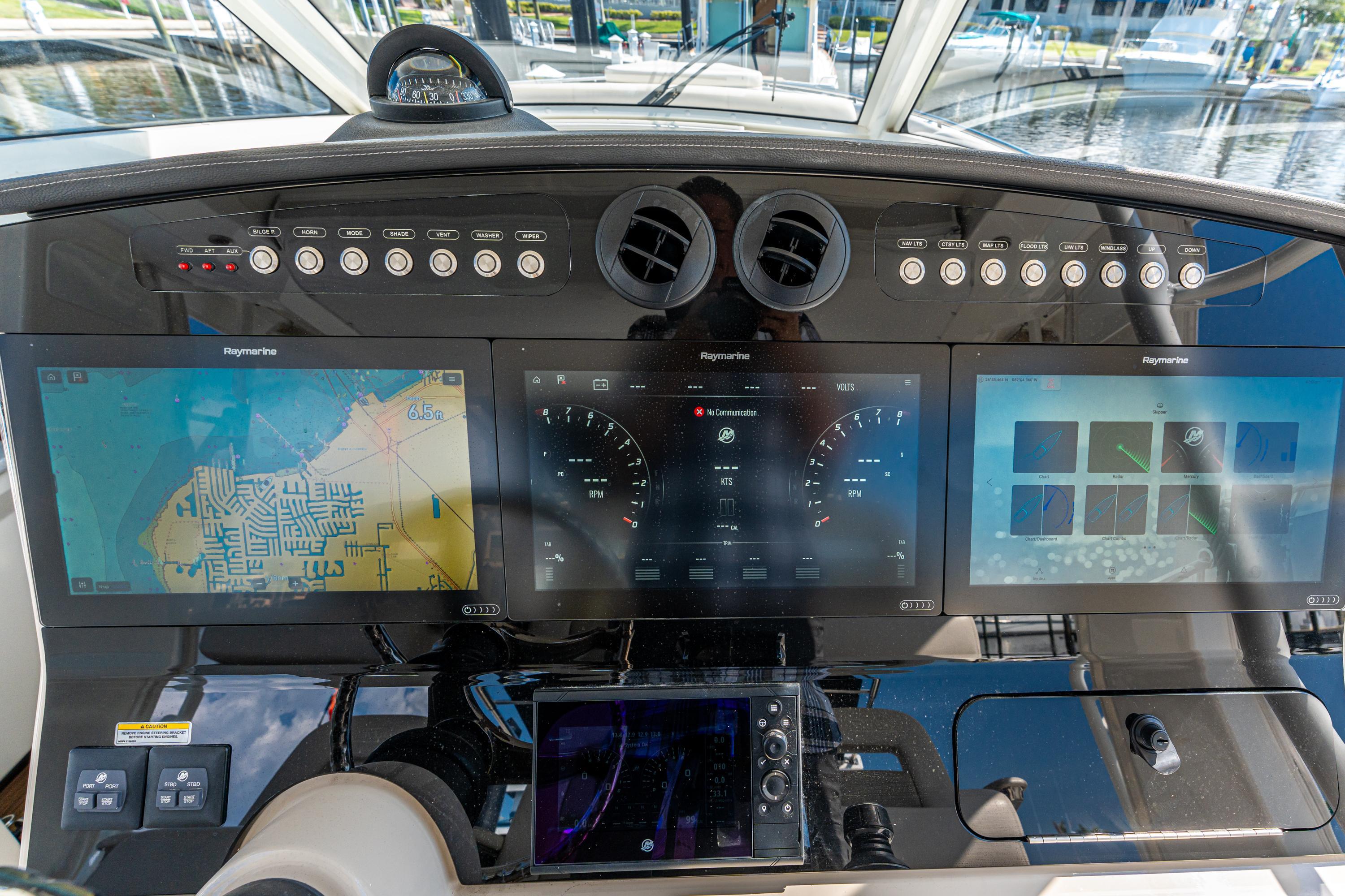 - Raymarine 19” Axiom Electronics / Dual Navigation Package - includes: GPS/chart plotter/fishfinder, 1000 watt thru hull transducer B175 med, Raymarine 90 modular VHF system, Raymarine Sounder RV-1000, custom black acrylic dash surface integrated with switch panels and flush mounting of Axiom XL displays, Navionics Chart Card: North America/Canada