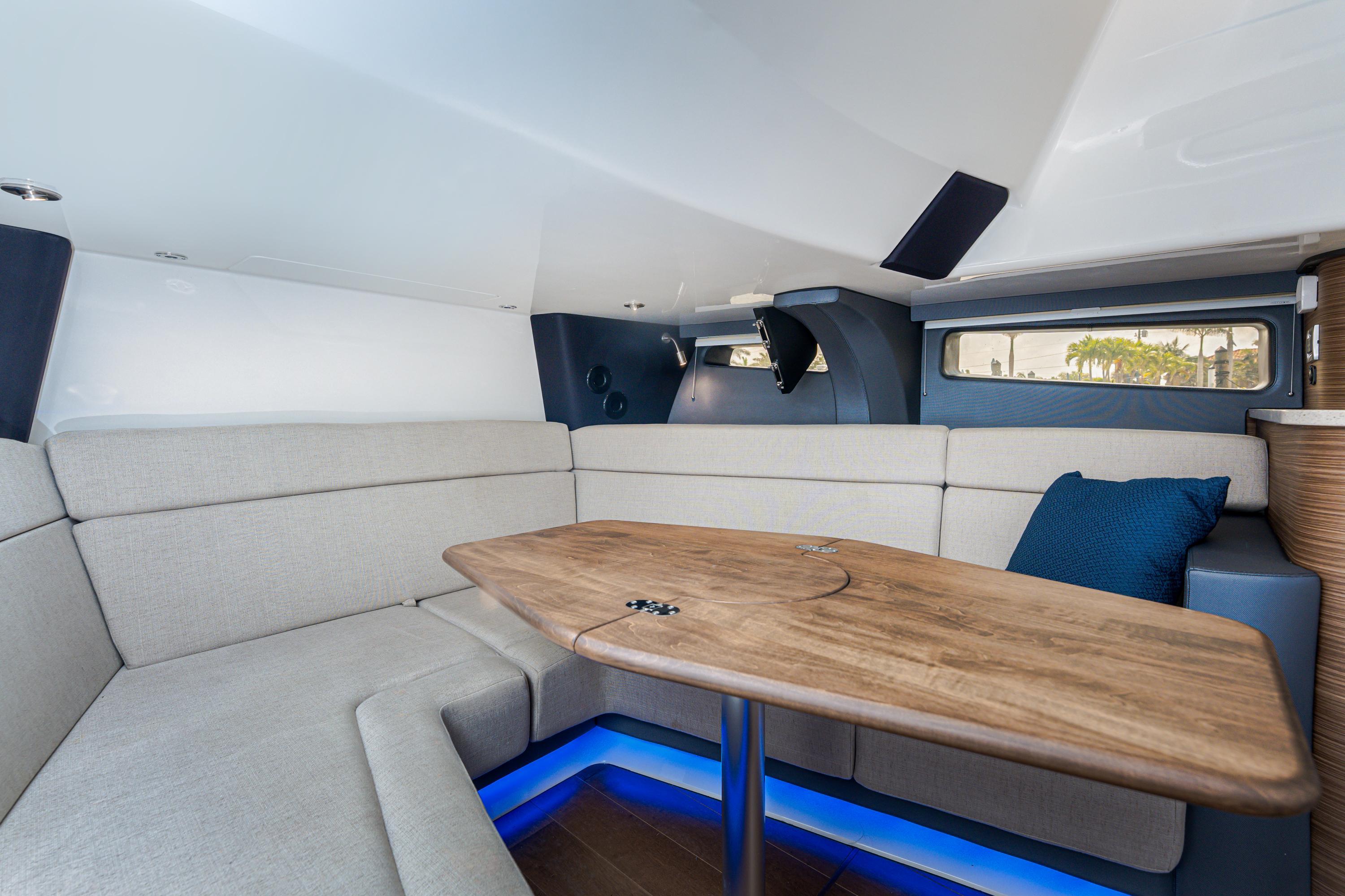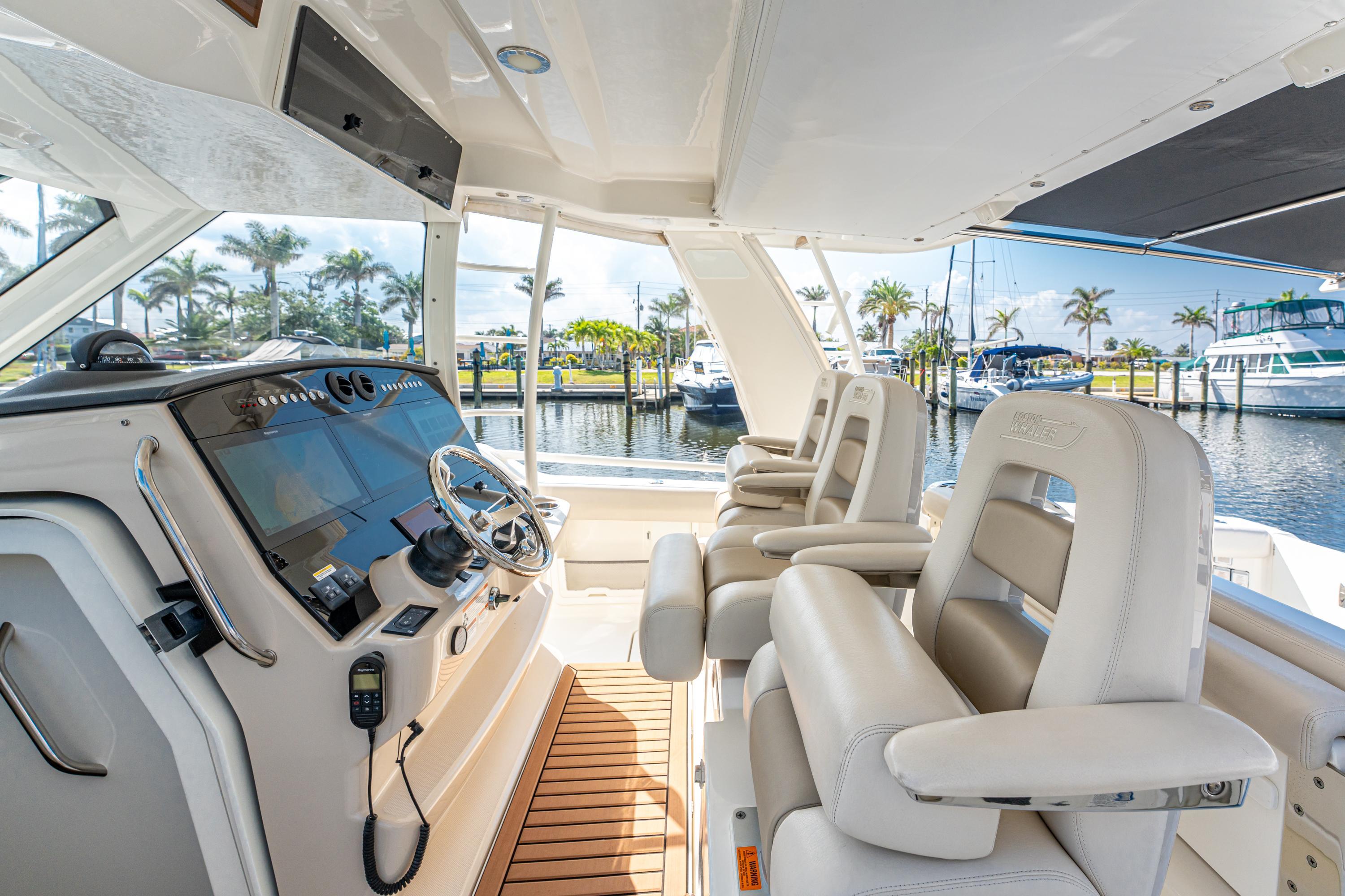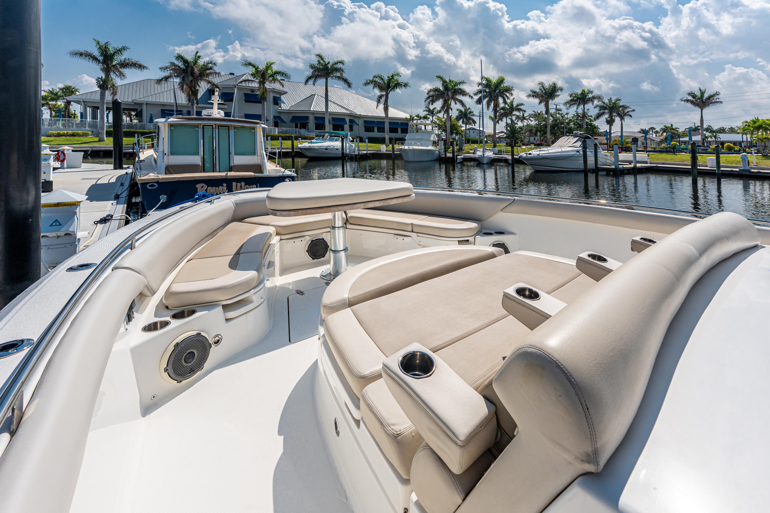 - Helm and companion bolster style seats (3) with fold-down armrests (center seat is electrically actuated) (port and starboard seats rotate to face aft)