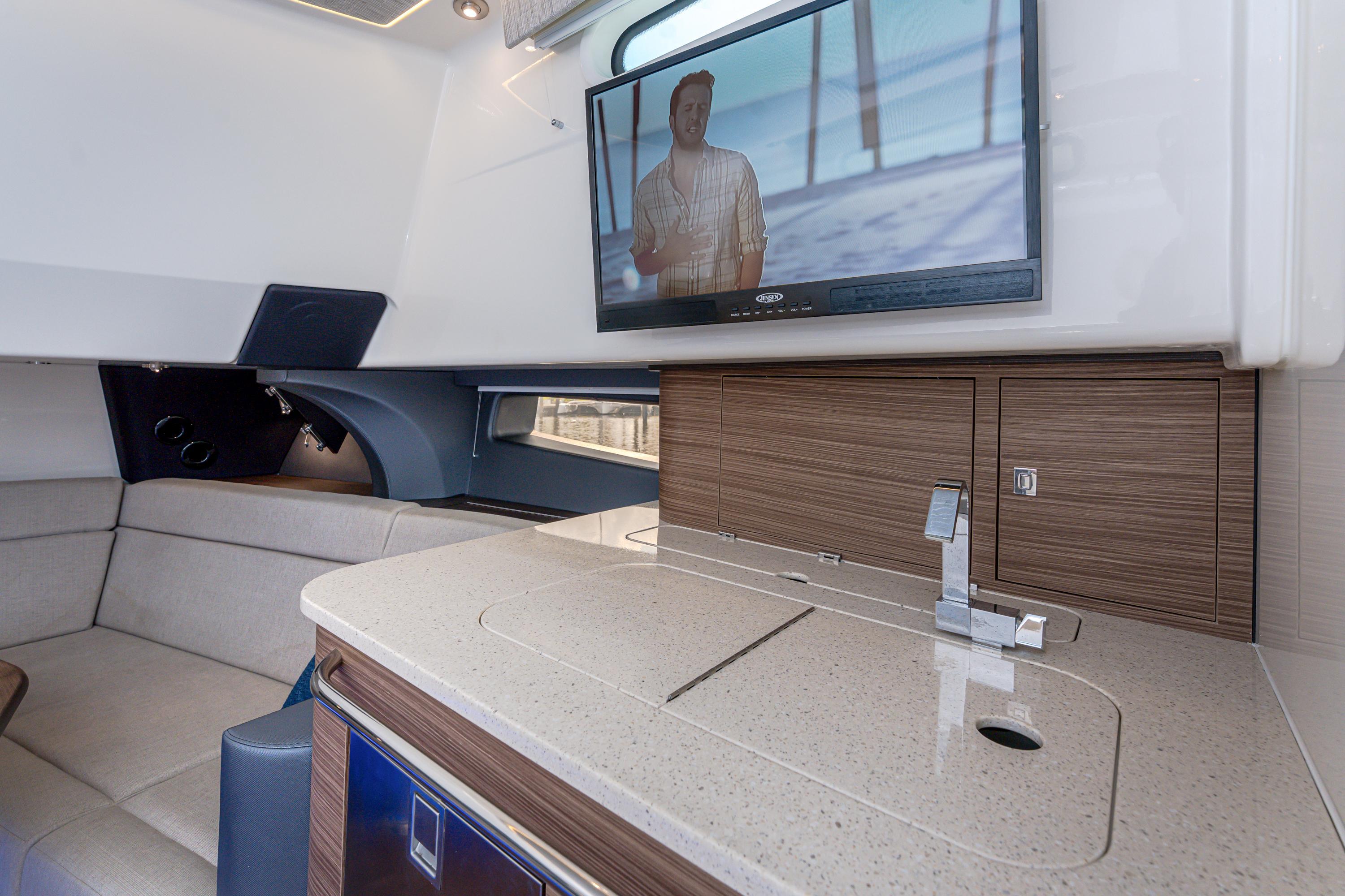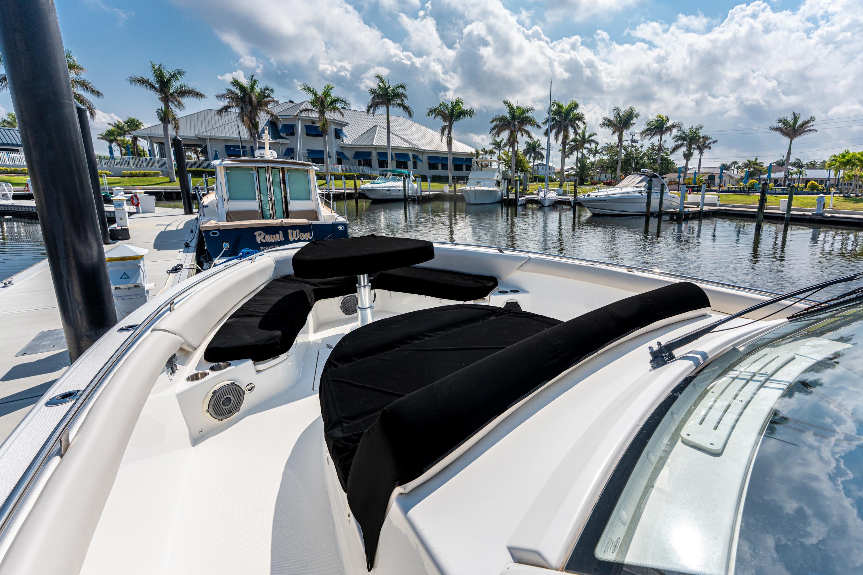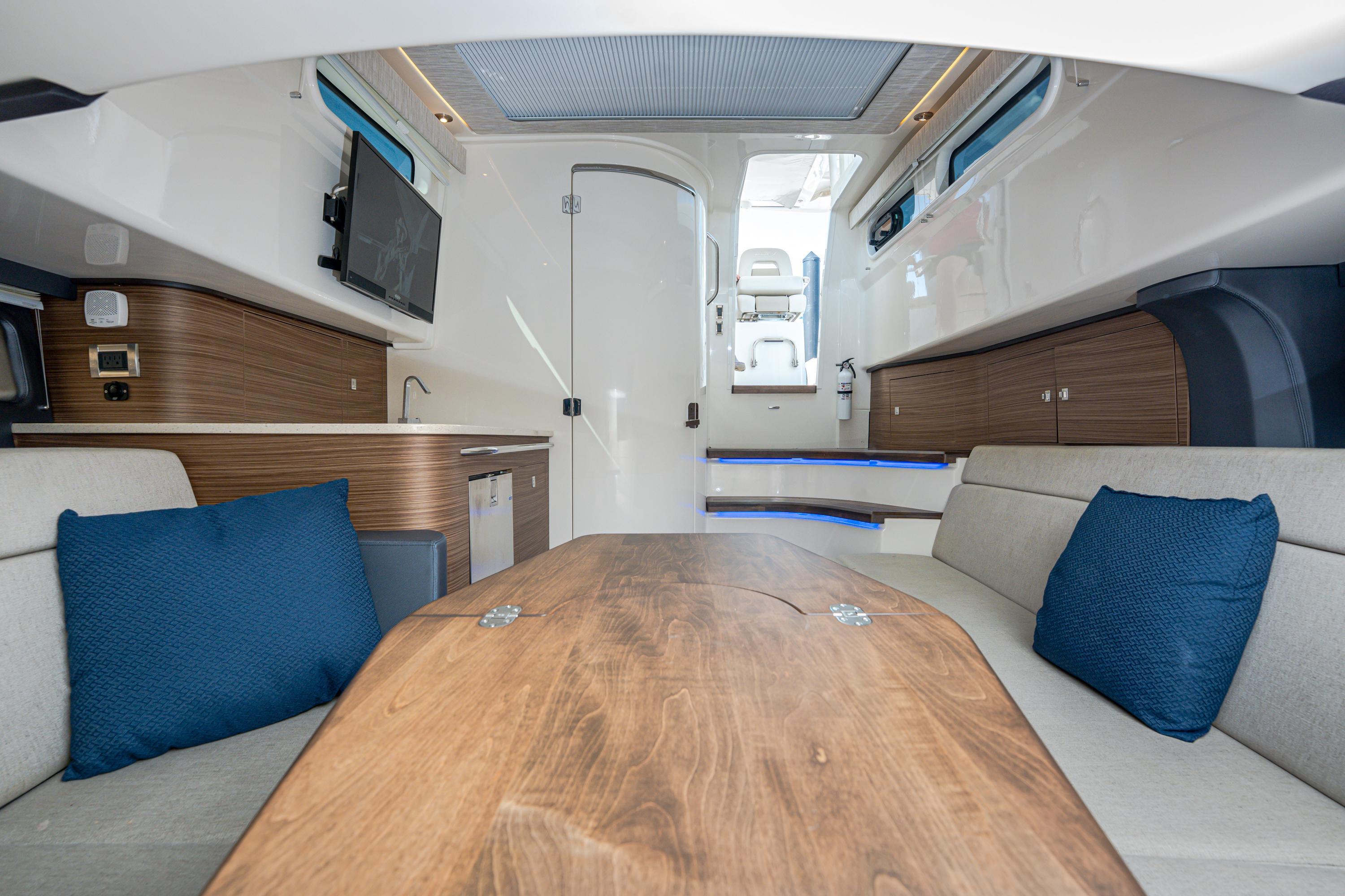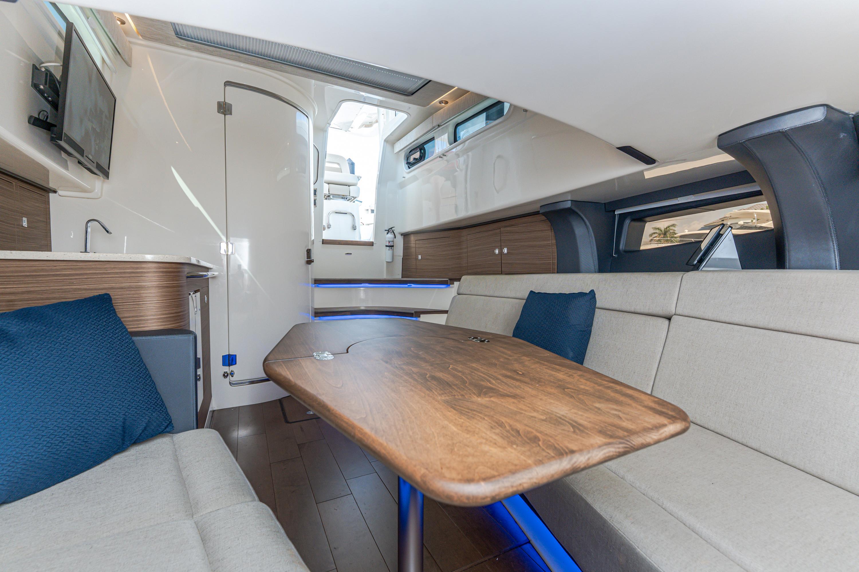 - Helm and companion bolster style seats (3) with fold-down armrests (center seat is electrically actuated) (port and starboard seats rotate to face aft)