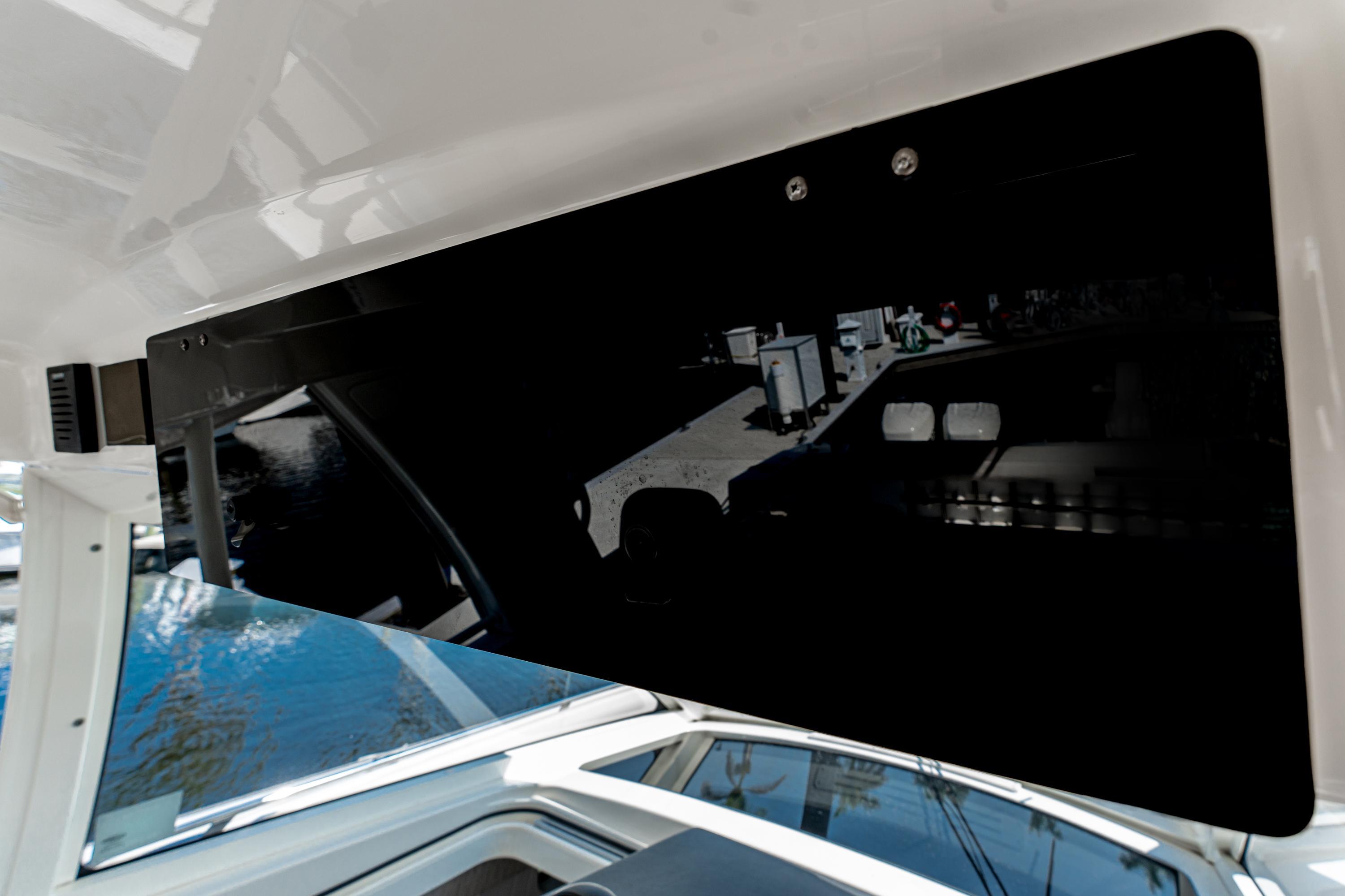 - Sunshade for cockpit – telescoping polished stainless steel frame retracts and deploys electrically (black Sunbrella canvas)