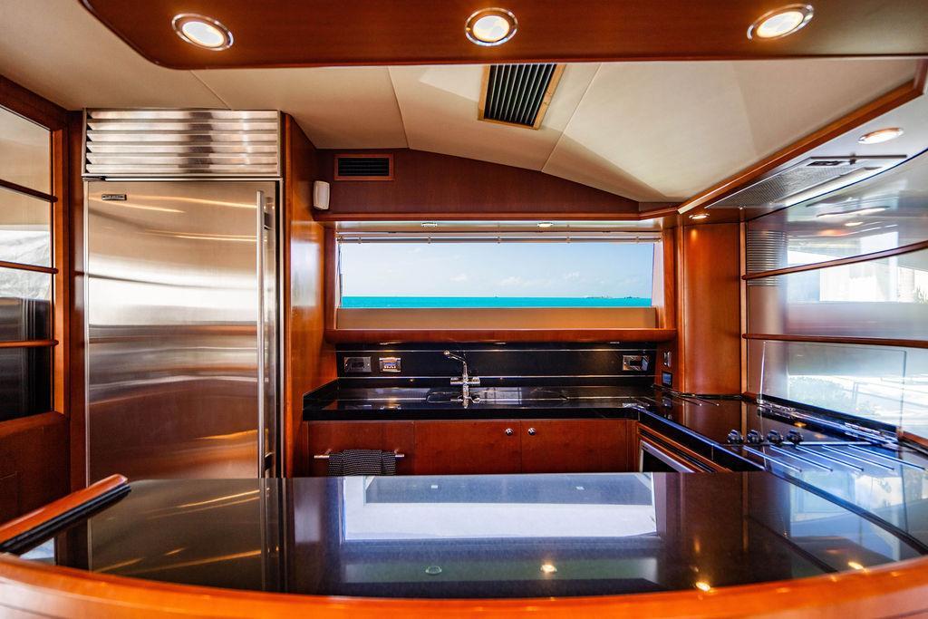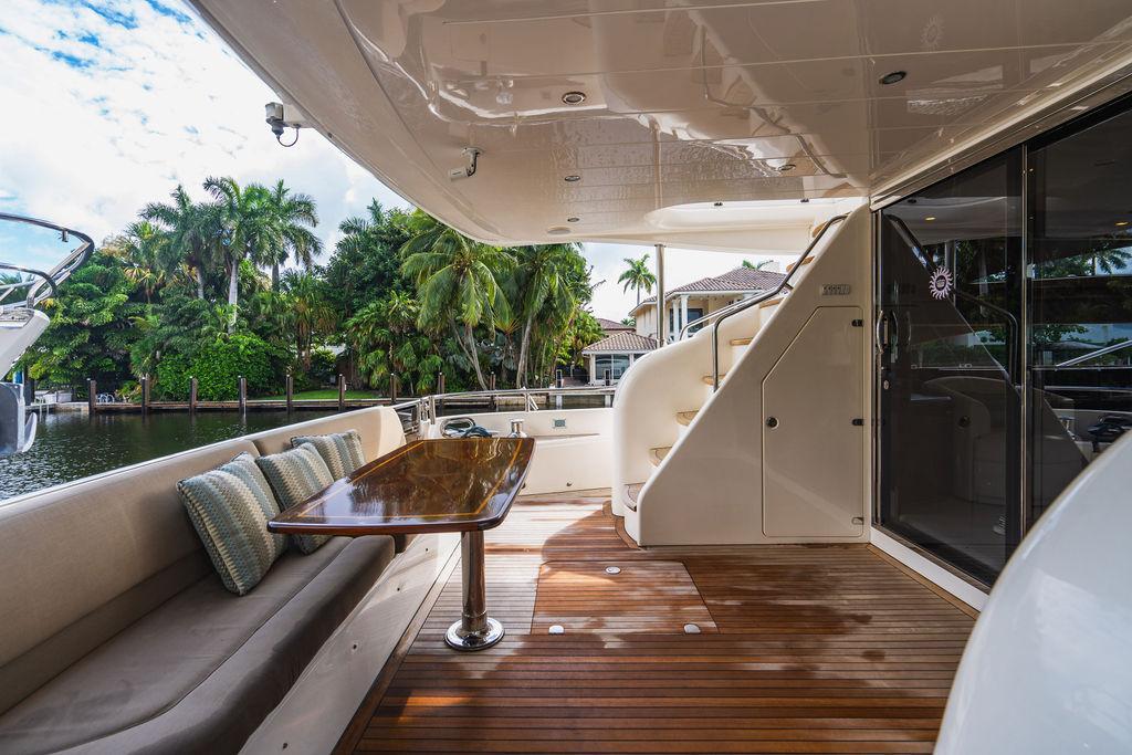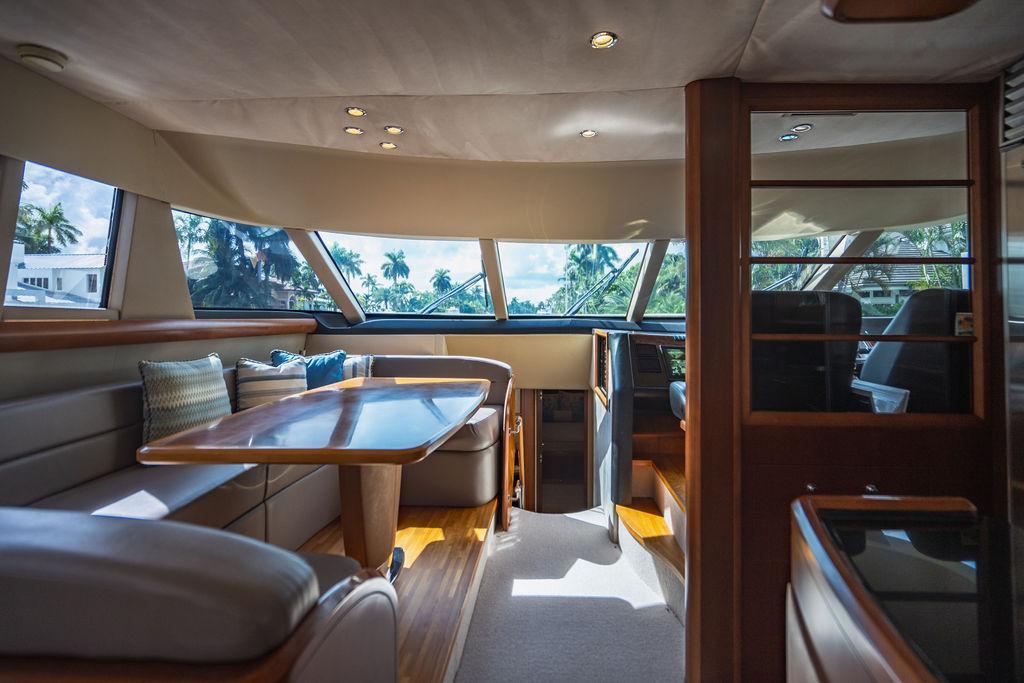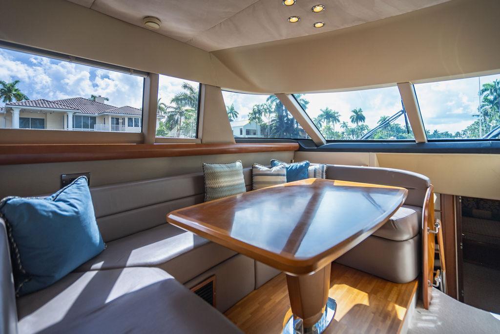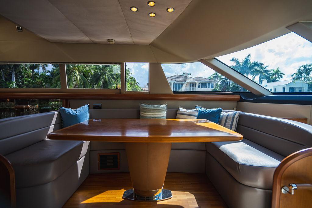 - Dinette: Opposite galley + aft deck & flybridge tables