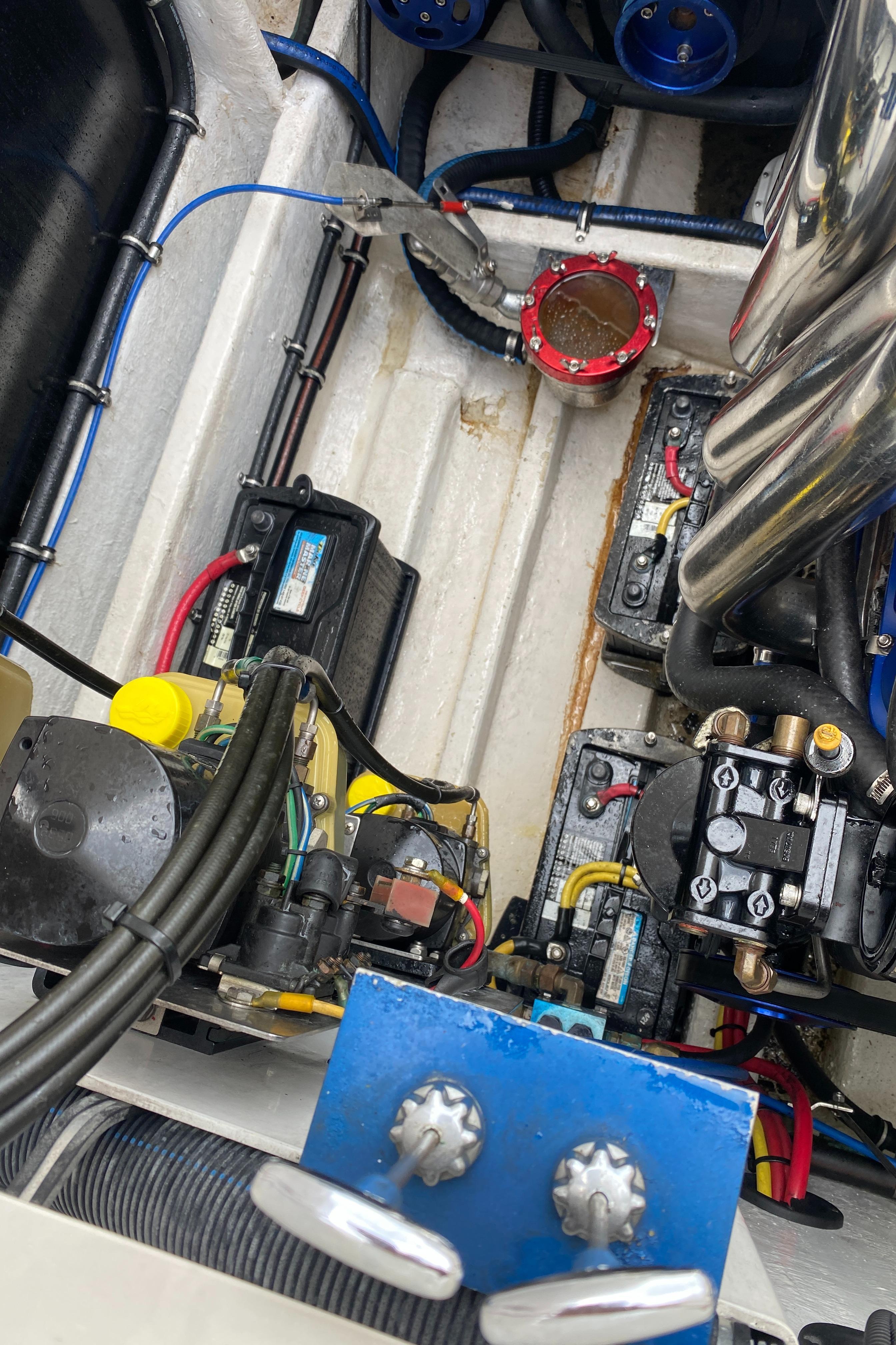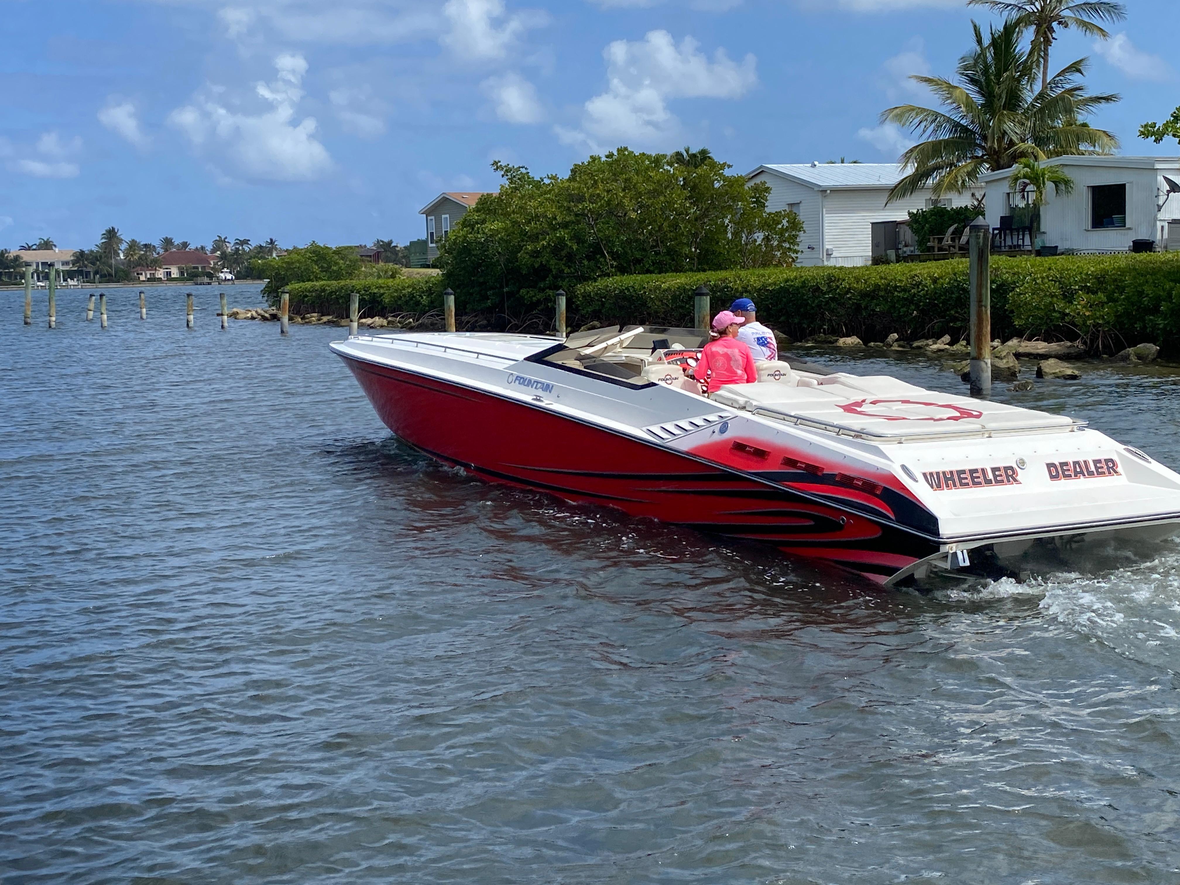 "Wheeler Dealer" is a 2006 42 Fountain Executioner. Owned by a very knowledgeable caring owner. Always stored in a marina indoor storage, No Bottom paint. Powered by twin 525 Mercruiser's driving XR drives on 6 bladed SS props with approx.50 hours since complete engine rebuilds. SS exhaust, gives the boat that distinctive sound of power. "Wheeler Dealer" is in excellent condition. Gaffrig controls, Keiffaer Trim tabs affords the captain confident throttle control while cruising at 50 mph with a top end Approx.80 . The red and white color scheme is carried through out the interior and exterior, very nice graphics on the hull sides makes "Wheeler Dealer" a true head turner. Bolster Helm and companion seating with a rear bench seat keeps everyone safe and comfortable while underway. Forward cuddy cabin with U shaped bow bench seating, Enclosed head allows the owner guest comfortable accommodations. Priced to sell as the owners boating needs are changing. A must see for the discriminating buyer of this classic legend .Contact the listing central agent to arrange a private showing .Manufactures Description Fountain styling evolved into what it is today, but the Executioner's chiseled lines and sleek profile were an instant classic. Now you can have that retro look incorporated with the latest in performance and design technology. It has electric drop-down bolster seats, a driver-inspired dash layout with color co-ordinated bezels, throttles, and steering wheel. The cabin also has been brought into the 21st Century with a full galley, enclosed head, V-berth, and wraparound settees.