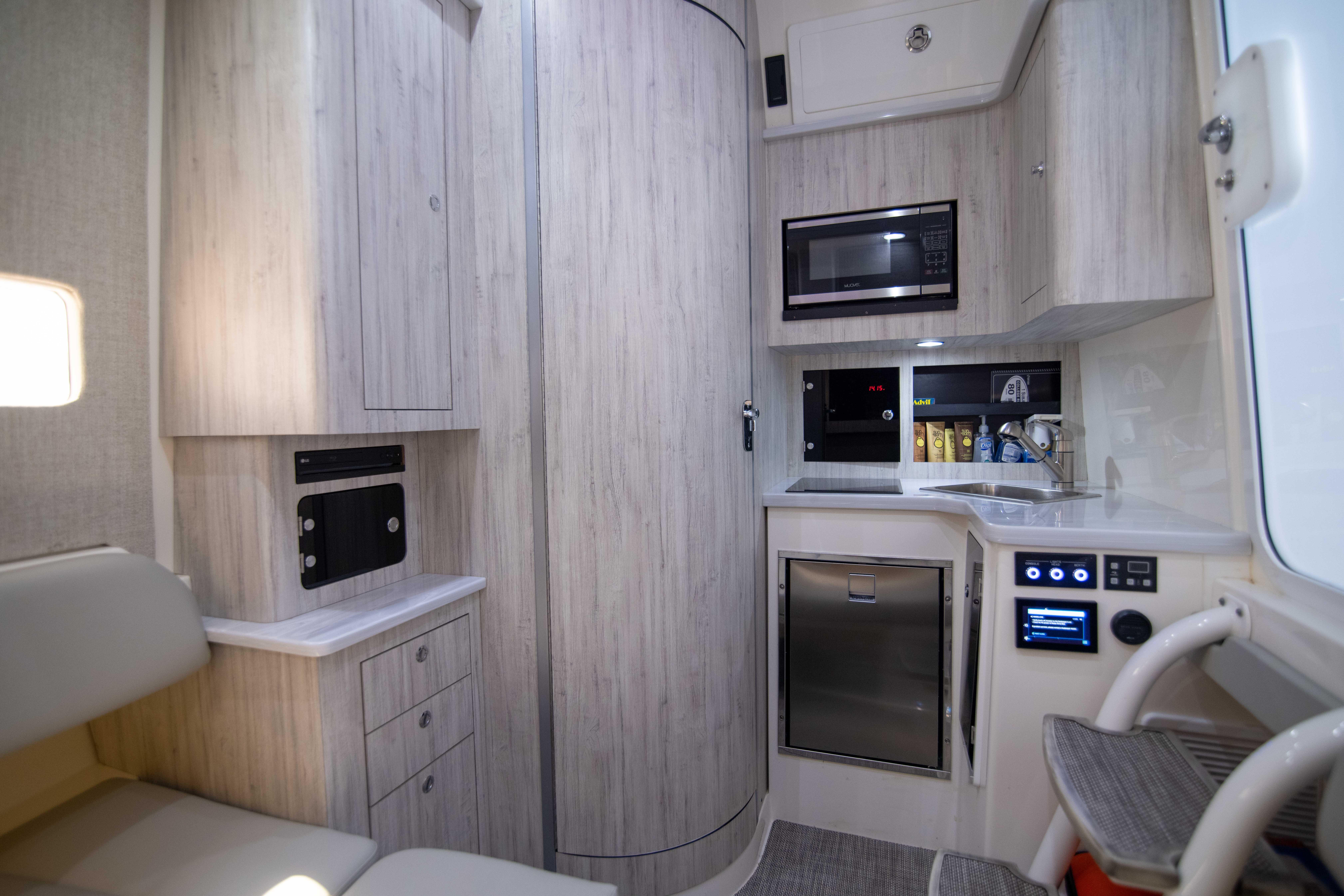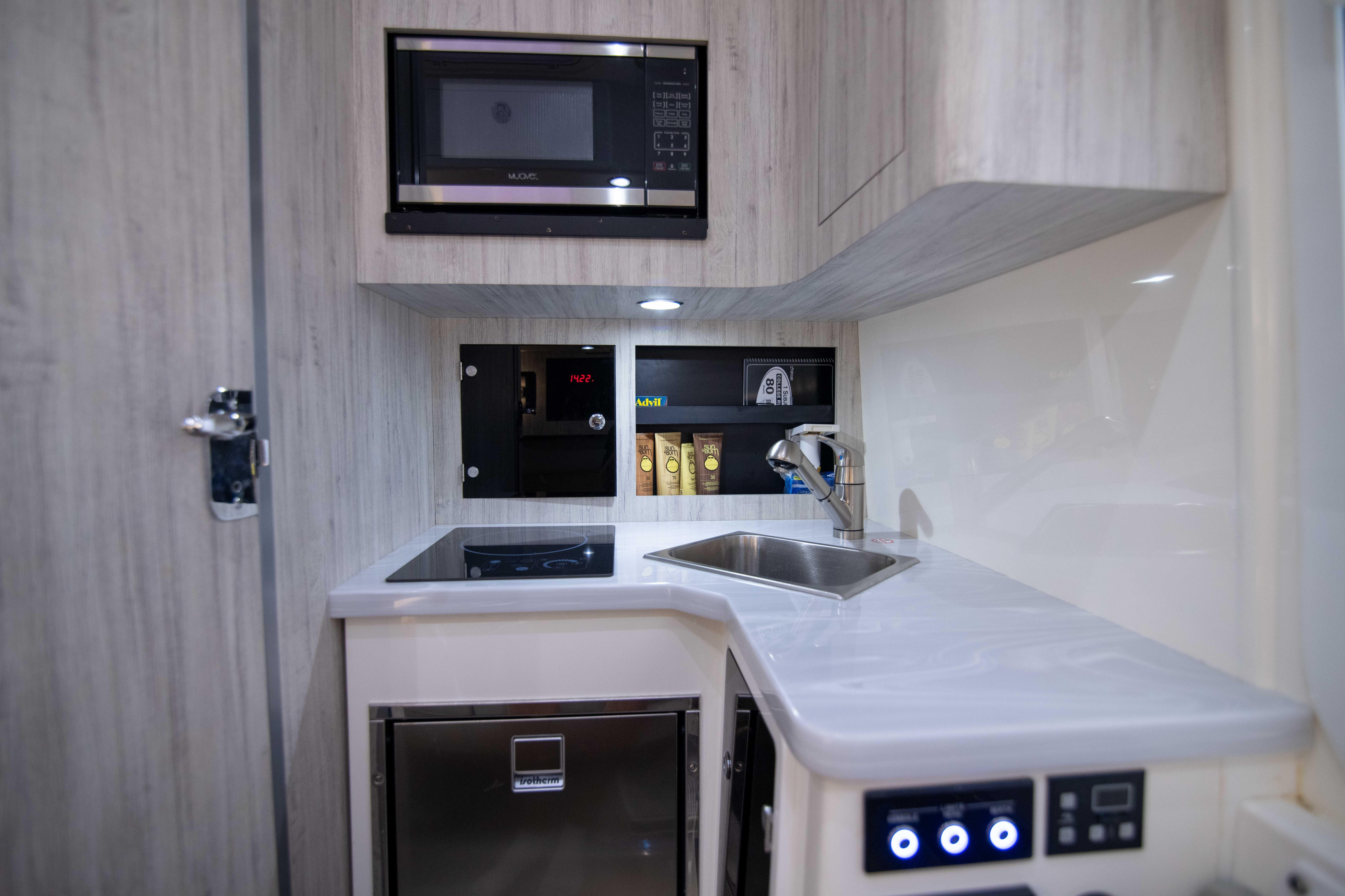 - Galley with refrigerator, microwave, sink, Kenyon single burner cooktop, and cabinet storage