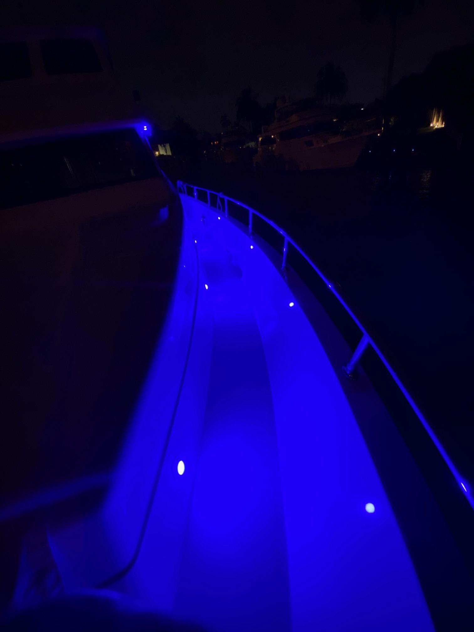 The lower aft deck has a long table perfect for seating 8 complete with new teak deck chairs and cushions. Soft overhead LED lighting can be employed in either white or blue mode, and just adds to the ambience. A new Sunshade has been installed behind the seating area for protection during the height of the day. The wet bar also has another additional refrigerator. The beauty of the newly installed teak deck is undeniable. A perfect place to gather for morning coffee or to plan the day's excursions. Starlink provides coverage here as well. The custom boarding stairs have beautifully varnished rails and when not in use are stored in a dedicated locker on deck.