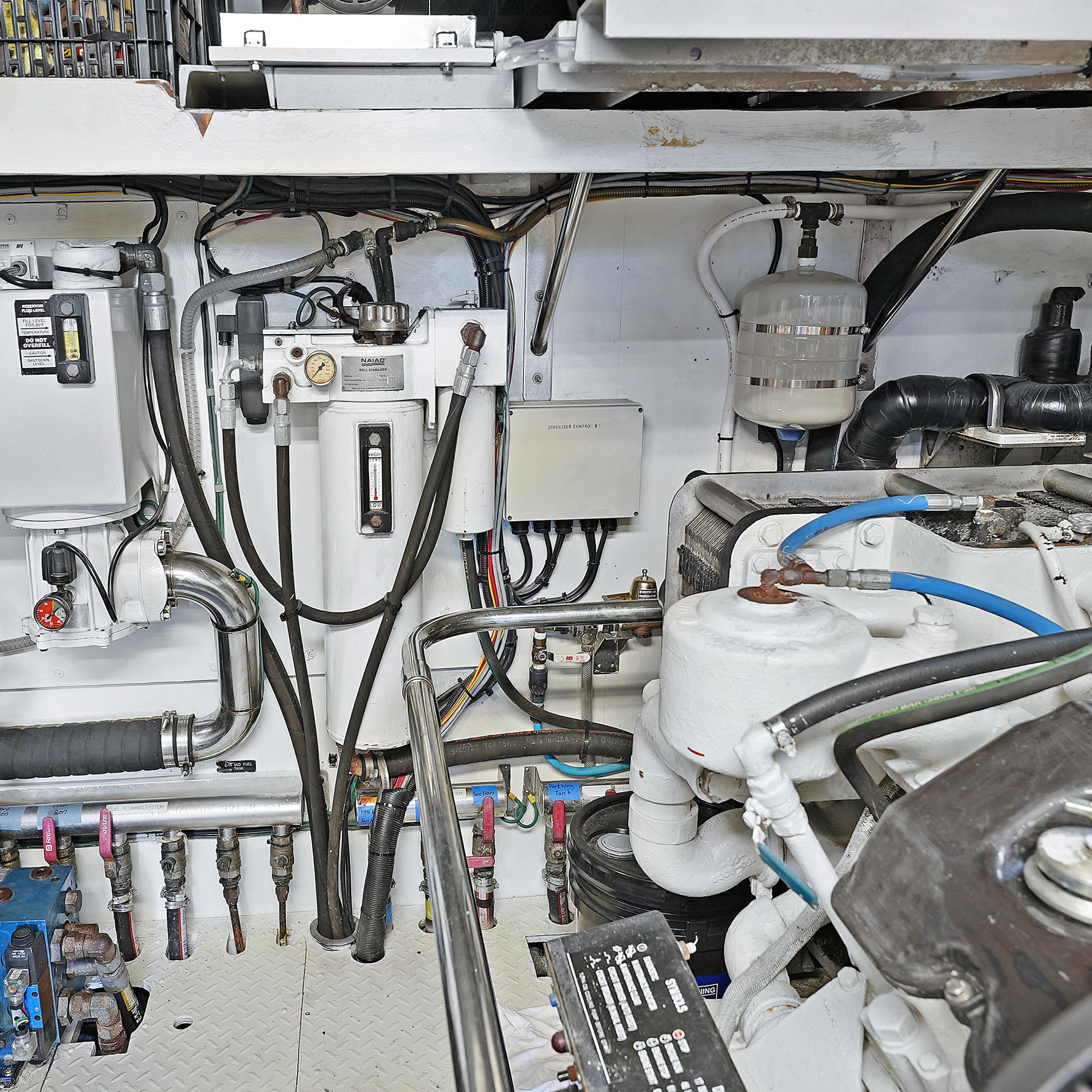 SUE CAROLYN has Naiad stabilizers and HPS bow thruster. Redundancy has been built in, with hydraulic pumps on each engine, dual Racor filters, twin Fire Boy fire extinguisher systems, and three new separate CruiseAir chilled water A/C systems.