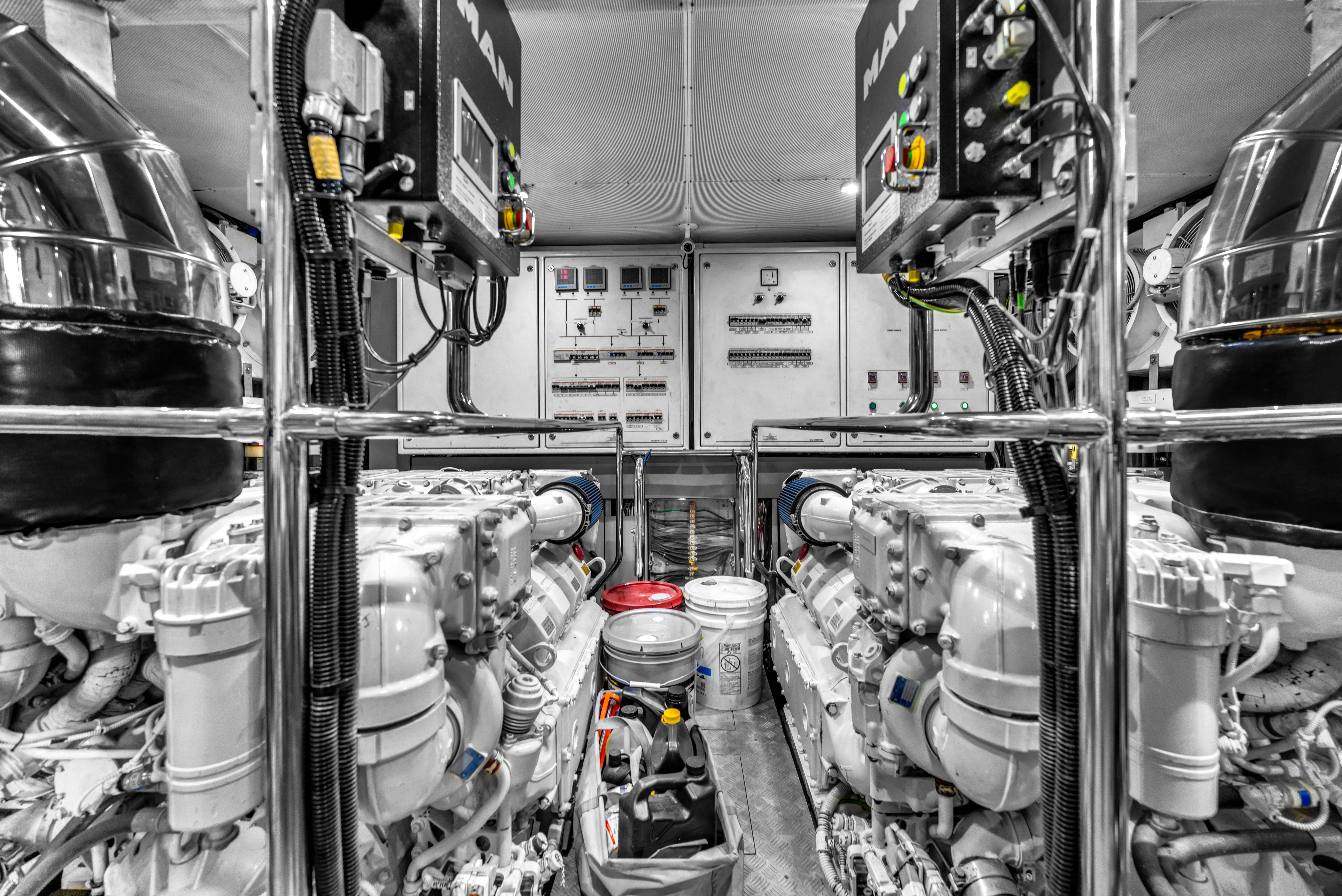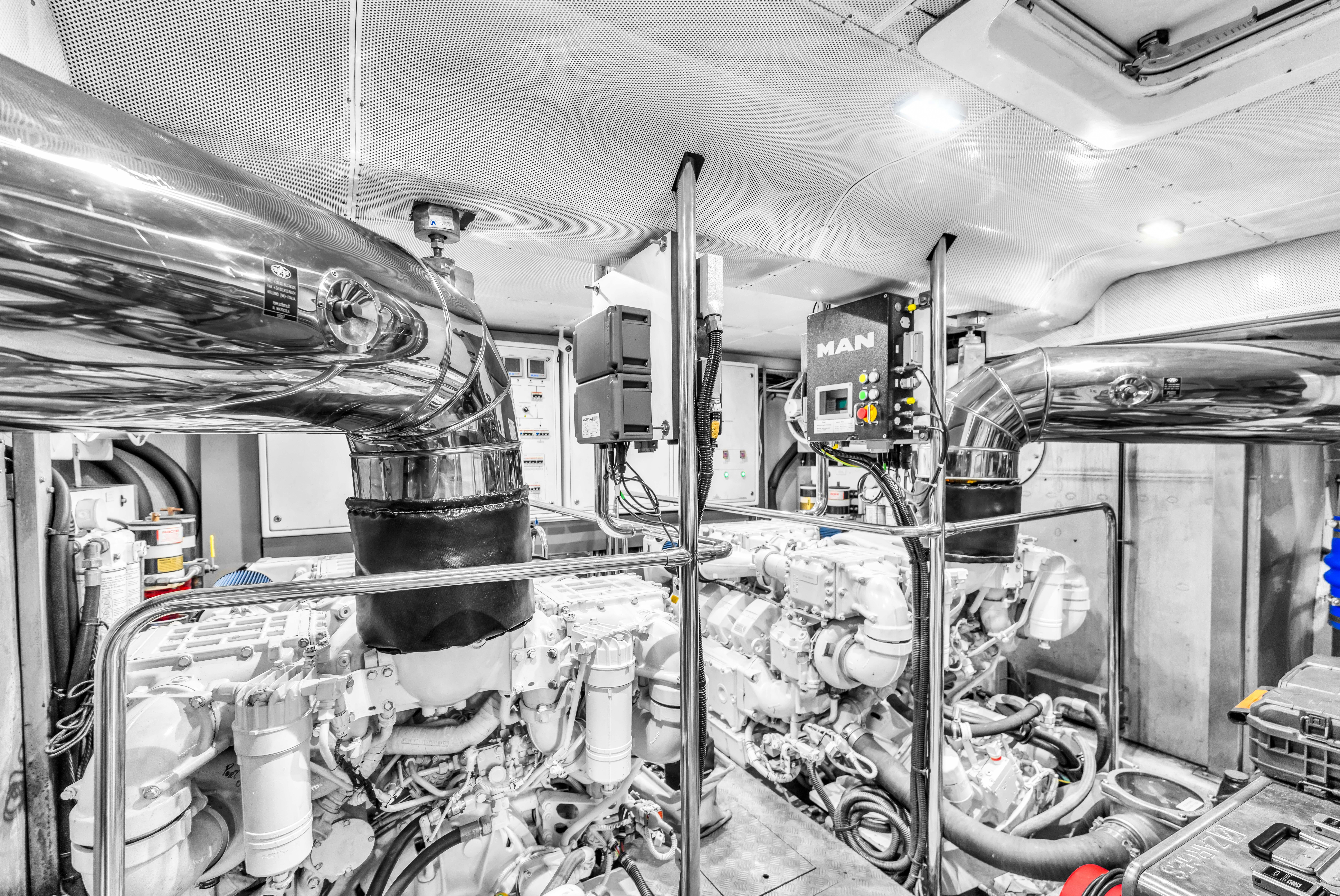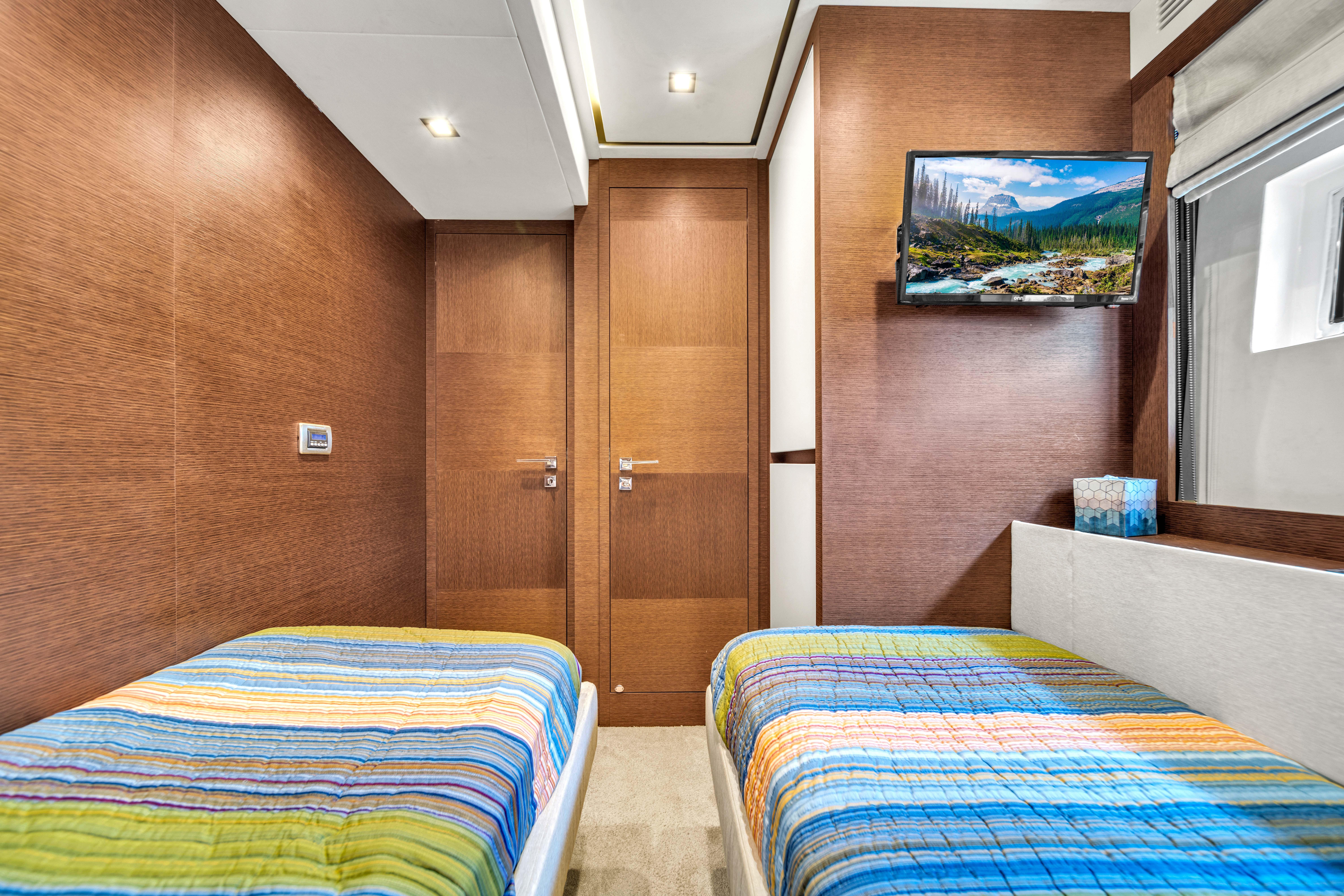 This motor yacht has been designed to fully enjoy being at sea, whether on open waters or at anchor, with multiple living spaces on deck, including a vast cockpit and an immense terrace on the flybridge.  Bathed in light, the forward owner’s cabin is a quiet, intimate living space with a private access, a large walk-in closet, a wide desk, an independent head and shower compartment.