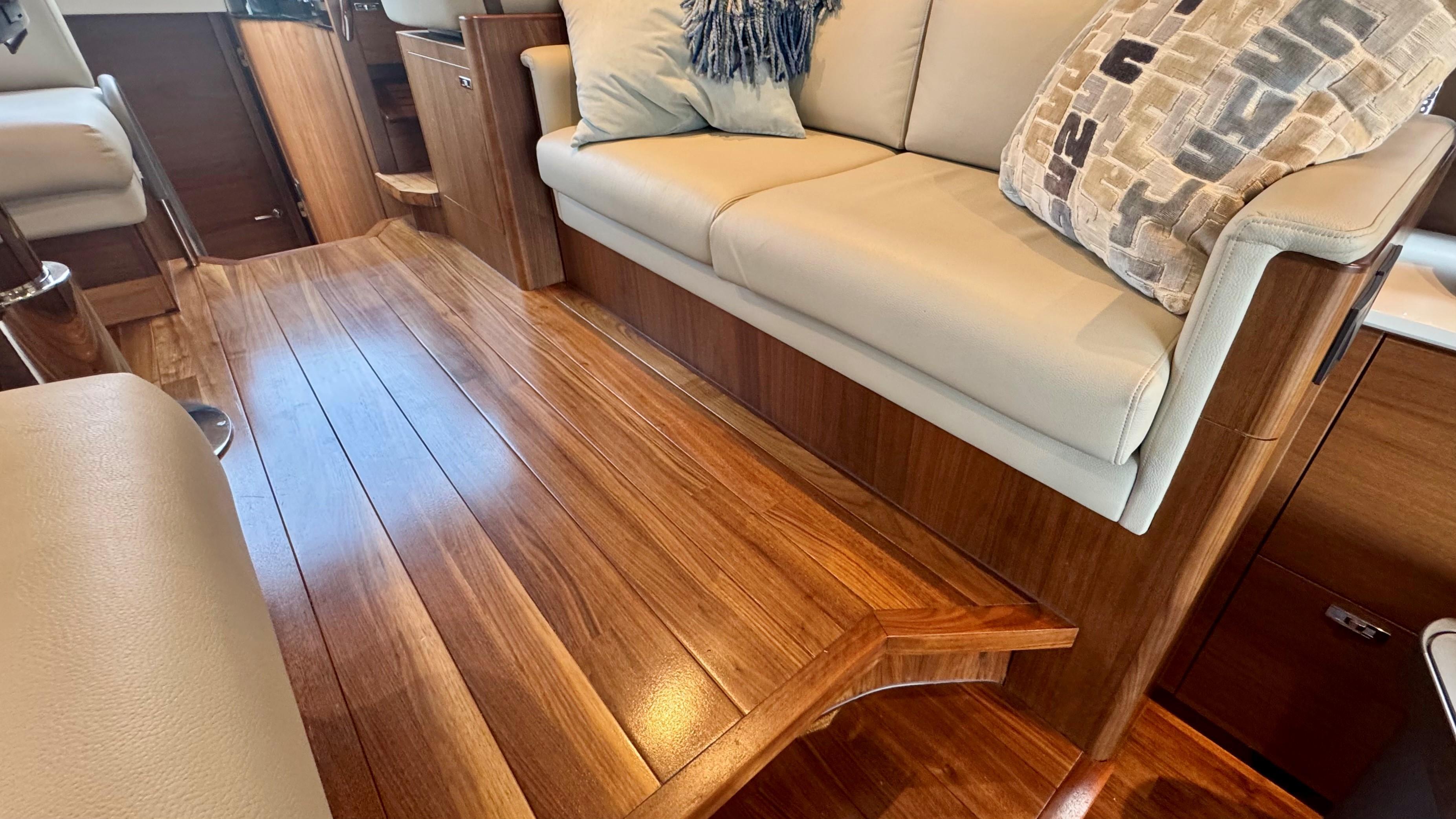 - Timber-laid floor (V-groove planked) to galley area and dining area