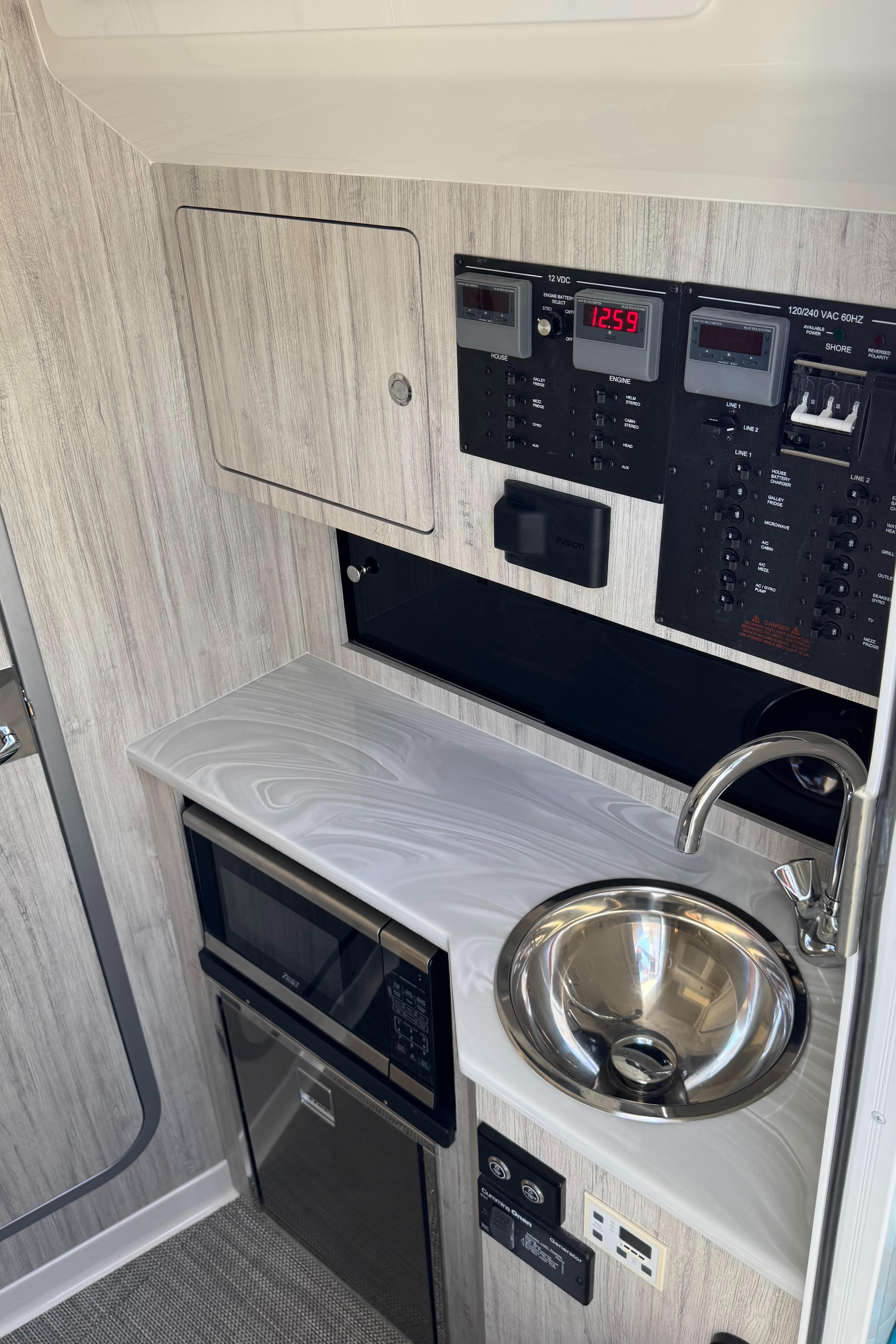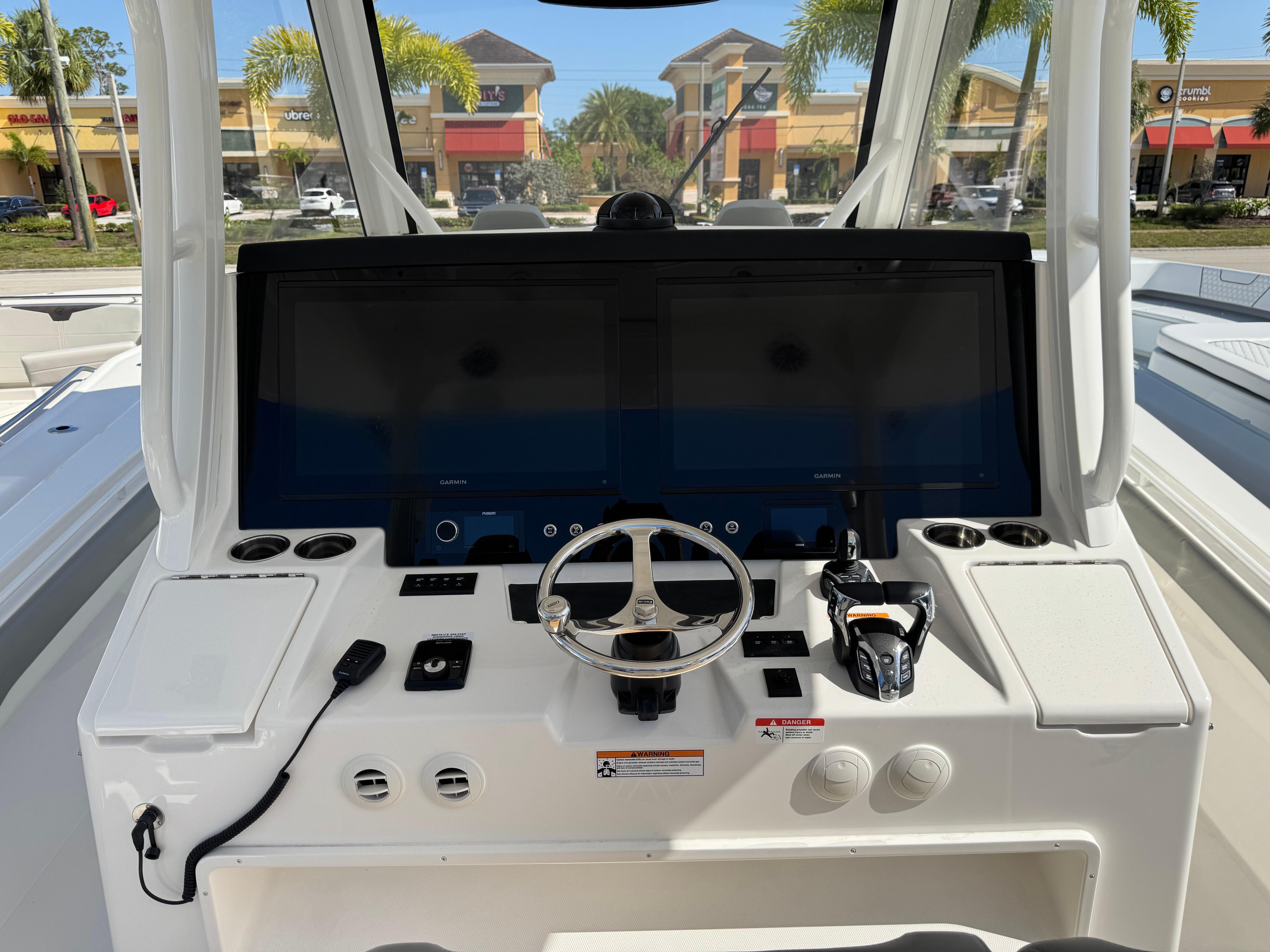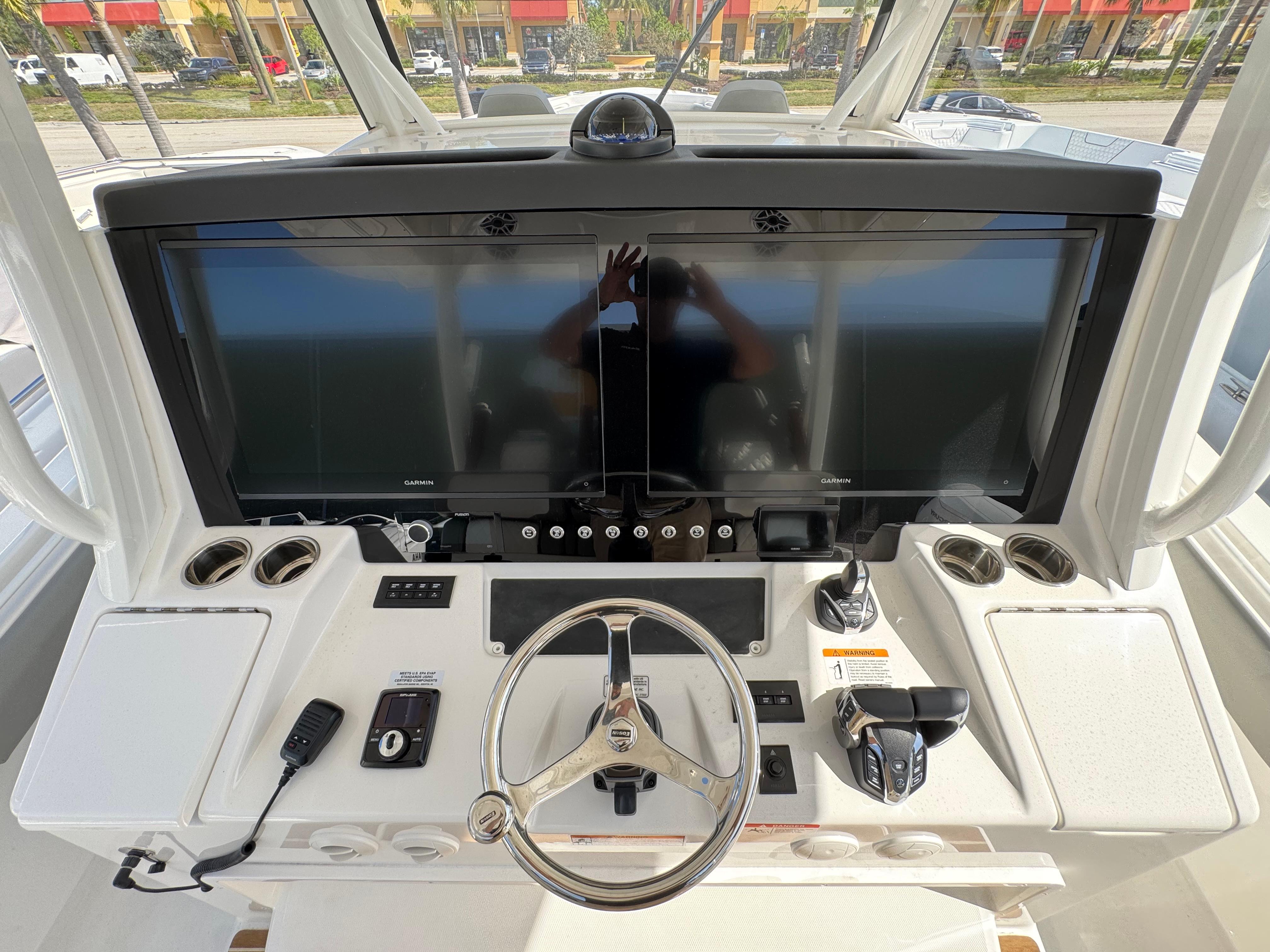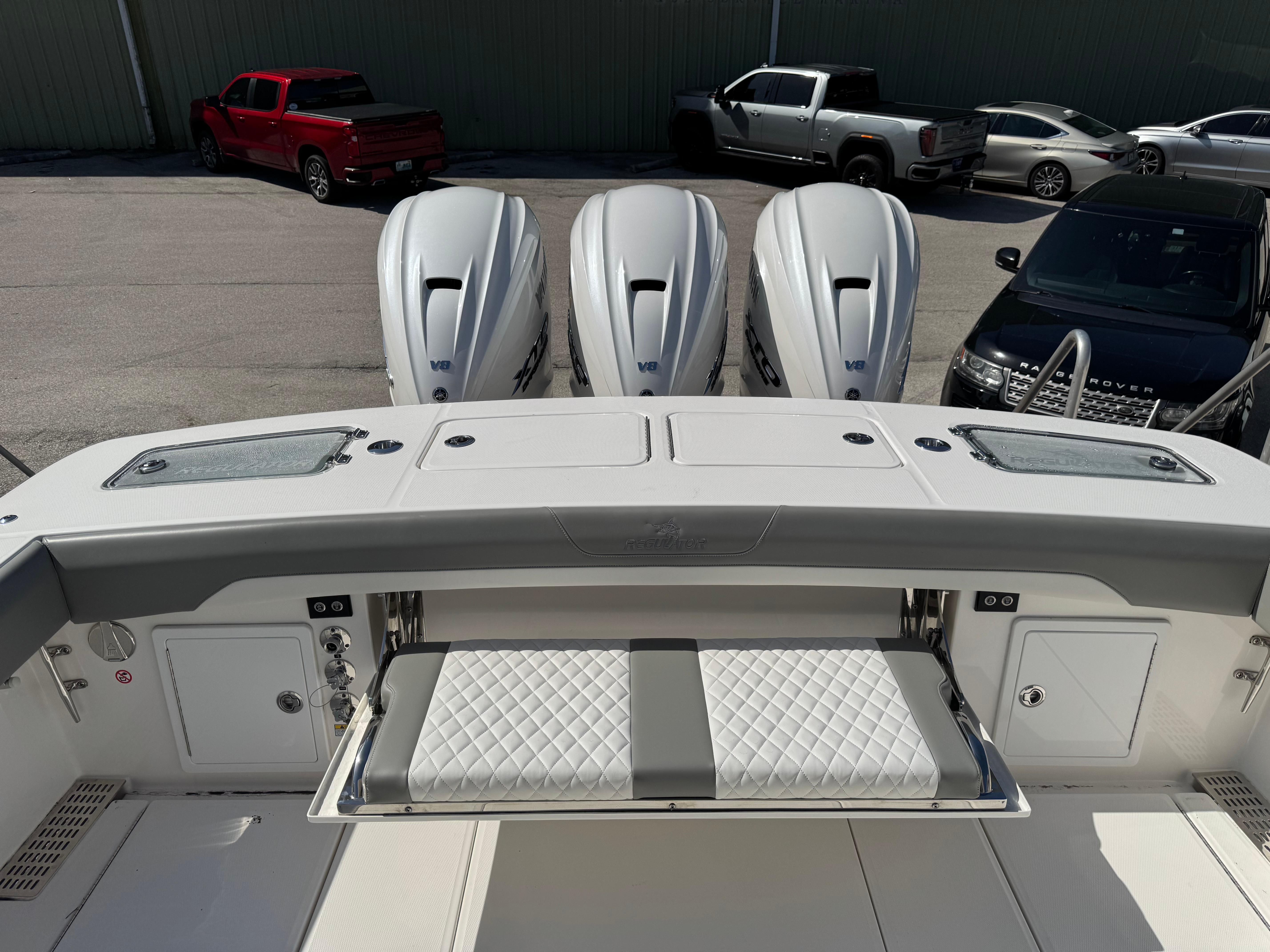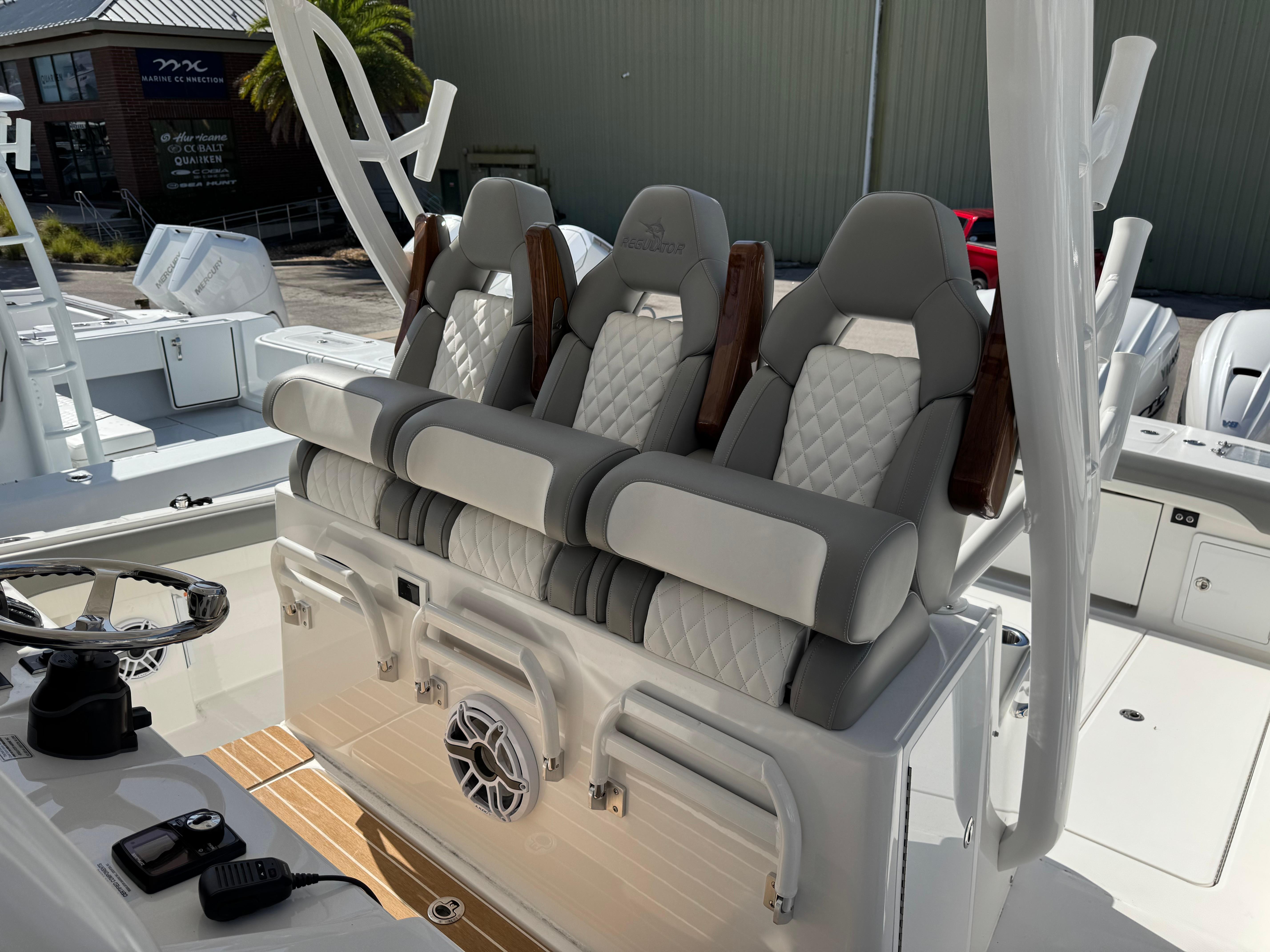 STANDARD FEATURESCONSOLEFiberglass T-Top with Surfboard Edges, Electronics Box, Integrated Navigation/Dock Lighting, Spreader Lights, and Multi-Colored LED Lights - Complete with Integrated, Vented, Wraparound Windshield and Windshield Wiper/Washer, Plus Rocket Launchers built into Aft Support Frame White Powder Coat Package Factory Installed Garmin® Offshore 37 Package: Dual 22" GPSMAP® 9022 Multi-Touch Widescreen Chartplotter/Sonar Displays, VHF 215 AIS Radio with Dual 8' Antennas, GMR ™ 424 XHD 4kW Open-Array Radar, Airmar® B275LHW with Wide Beam 1kW CHIRP Transducer, and Yamaha EX Autopilot, Plus Black Flushmount Electronics Face and Remote Mic Offshore Command Center: Garmin® Multi-Function Display with Digital Switching and Monitoring, Plus Proprietary Regulator MyHelm™ Interface for Seamless and Intuitive Connectivity of Key Functions via Touchscreen Integrated Switch Panel w/ LED Push Button Switches Ritchie® Supersport Compass Yamaha Next Generation Digital Boat Control System with Tilt Helm Digital Electric Steering (DES), Multifunction Digital Electronic Control (DEC), Ex Autopilot with Waypoint Deceleration, Electronic Key Switches (EKS) with Wireless Fob, Helm Master® EX Joystick with Multimode Set Point™, and CL5™ Multifunction Touchscreen Display Fusion® Apollo 770 Marine Stereo with AM/FM/WB, SiriusXM® Ready, Wi-Fi Audio Streaming, Apple AirPlay 2, Bluetooth® with Integrated DSP and (4) Backlit Speakers Siren Trident with Siren 3 Pro EZ-View Flushmount Electronic Mounting Face with Access in Head Compartment Illuminated Glove Boxes with Fiberglass Lids Recessed Upholstered Console Storage Trays with Dash Brow Stainless Wheel w/ Knob USB Charging PortsCONSOLE INTERIORBattery System with Key Fob-Enabled Switches and (7) Marine Batteries with Easy Access (2) 40 Amp Battery Chargers with 50' Power Cord CO Detector Courtesy LED Lights Bilge High Water Alarm Sleeping Accommodations for Two with Reading Lights Galley with Refrigerator, Microwave, Sink, and Cabinet Storage Air Conditioned Cabin Cabin Rod Storage Lockers (2) Chilewich AccentsHEAD INTERIORElectric Head with 13 gal. Holding Tank Stand-Up Head Compartment with Solid Surface Countertop, Sink with Hot Water, Interior Lighting, and Mirror Vented Port Light Hot Water Shower & Towel RackDECK AND COCKPITFully-Accessible, Illuminated Pump Room beneath Aft Bench Seat (Fuel Tanks, Optional Sekeeper® 5 & other Systems Access, and Extra Storage) Onan 9kW Diesel Generator Automatic Interceptor Trim Tabs Starboard Boarding and Dive Door w/ Removable Folding Ladder Pull-Up Bow Cleats Stainless Steel Hardware Through-Bolted with Elastic Stop Nuts Molded Non-Skid Horizontal Surfaces Engine Bracket with Integrated Telescoping Ladder Through Stem Bow Roller with Anchor Windlass in Forward Deck Anchor Locker with Remote Switch, Chain, Chain Stop, Anchor and Freshwater Wash Down & Overboard Drain Stainless Steel Scuppers Flush-Mounted Fiberglass Sun Bed with Filler Cushion and Convertible Pedestal Table with Electric Motor to Raise/Lower USB Charging Ports in Forward Seating Area Four (4) JL Audio® Backlit SpeakersSEATING AND FISHING EQUIPMENTForward Seating with Flip-Up Backrests (2) Forward Console Settee with Insulated Tub Regulator E-Series Triple Helm Seating & Tackle Center w/ Aft-Facing Bench Seat Integrated Flush Folding Transom SeatFISHING EQUIPMENT50 gal. Freshwater System with (2) Wash Downs and Transom Shower Insulated, Illuminated Forward Fishbox (3) 311 qt. In-Deck Insulated, Illuminated, Macerated Aft Fishbox (2) Insulated, Illuminated 322 qt. Transom Fishbox Insulated, Illuminated 33 gal. Transom Livewell (2) Raw Water Wash Down and Livewell Plumbing (6) Stainless Steel Aft Gunwale Conventional Rod Holders(2) Conventional Transom Rod Holders (2) Cup Holder Rod Holders in (Aft Bench Seat)POWER OPTIONTriple White Yamaha XTO Offshore® 450 4-Stroke Engines with DES Tilt Helm and DEC - Plus Helm Master® EX Joystick w/ Multimode Set Point™, EX Autopilot with Waypoint Deceleration, and Electronic Key Switch with Wireless Fob POWER & SYSTEMSSeakeeper® 4.5 Gyro Stabilization System Upgrade to Onan 13.5 kW Diesel Generator All White Entire HullT-TOP GEMLUX® Bluewater Outrigger Bases with 22' Carbon Fiber Collapsible Poles and GEMLUX® Double Rigger Kit T-Top Storage CompartmentSEATHING & UPHOLSTERYDove Gray Upholstery Diamond Quilted Upholstery E-Series Triple Helm Seating & Tackle Center w/ Raised-Deck Triple Helm Companion Seats w/ Armrests, Bolsters, and Footrests w/ SoftGrip Foot Rail; Aft-Facing Bench Seat for Two w/ Armrests, (2) Cup Holder Rod Holders, Tackle Storage, (6) Rocket Launchers built into Aft Frame, and more Teak Accents Halcyon Luxe Interior Package with Cool Grey & Warm White Tones Across Countertops, Cabinets & Chilewich AccentsELECTRONICS(2) Inductive Cell Phone Chargers in Recessed Console Trays Cabin Entertainment Upgrade Package: Includes Smart TV, Fusion® Apollo SRX400 Head Zone Receiver, and Bose® Soundbar Electric Anchor Light and Antenna Mounts Entertainment Upgrade Package: Includes Fusion® Dynamically Calibrated System with (10) Premium Backlit Speakers, Subwoofer, Amps, and Integrated Wi-Fi Factory-Installed Garmin® GMR M 1224 XHD 12kW Open-Array Radar Factory-Installed Garmin® GXM™ 54 SiriusM® Marine Weather Receiver Upgrade Factory-Installed Garmin® Offshore Package: Dual 27" GPSMAP® 9227 Multi-Touch Widescreen Chartplotter/Sonar Displays, VHF 215 AIS Radio with Dual 8' Antennas, GMR™ 424 XHD 4 kW Open-Array Radar, Airmar® B275LHW with Wide Beam 1 KW CHIRP Transducer, & Yamaha EX Autopilot, Plus Black Flushmt Elec. FLIRT™ M232 Thermal Camera LED Light Bar Multi-Colored Underwater LED Lights (2)FISHING UPGRADES(2) Clear Port & Starboard Livewell Lids w/ Etched Regulator Logos (2) Electric Reel Hook-Ups Quick-Release Under Gunwale Gaff Holder Refrigerated Port Aft In-Deck Fishbox Refrigerated Transom FishboxCOMFORT & CONVENIENCE 12k BTU Air-Conditioning System