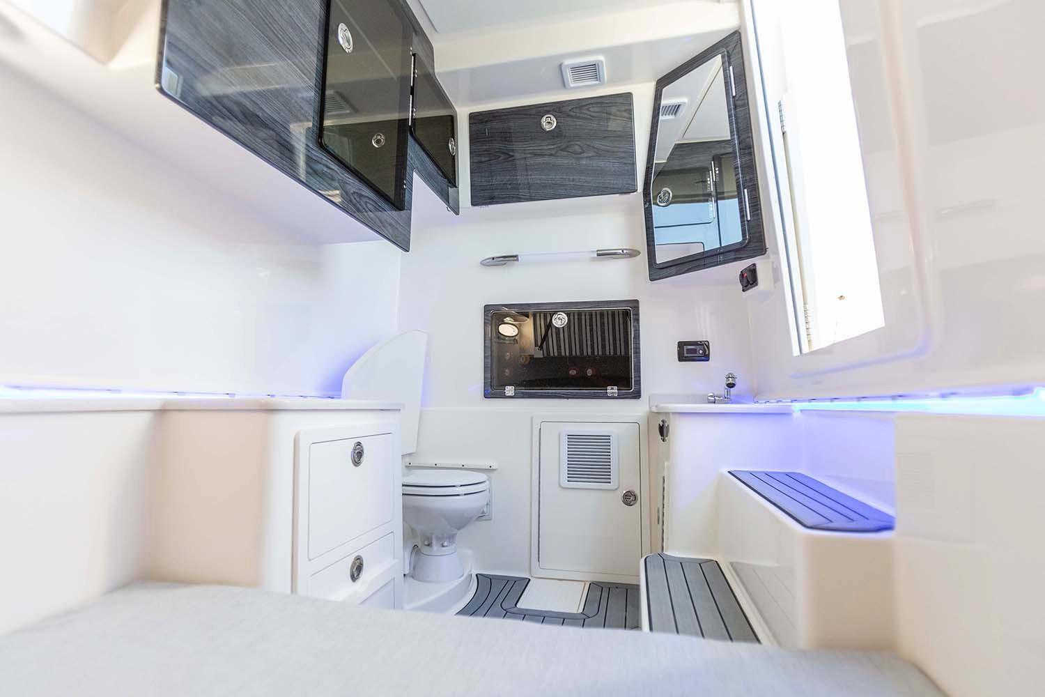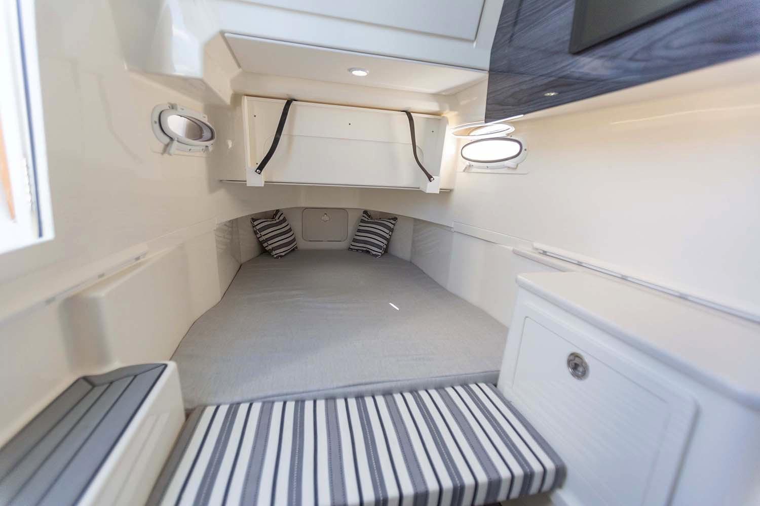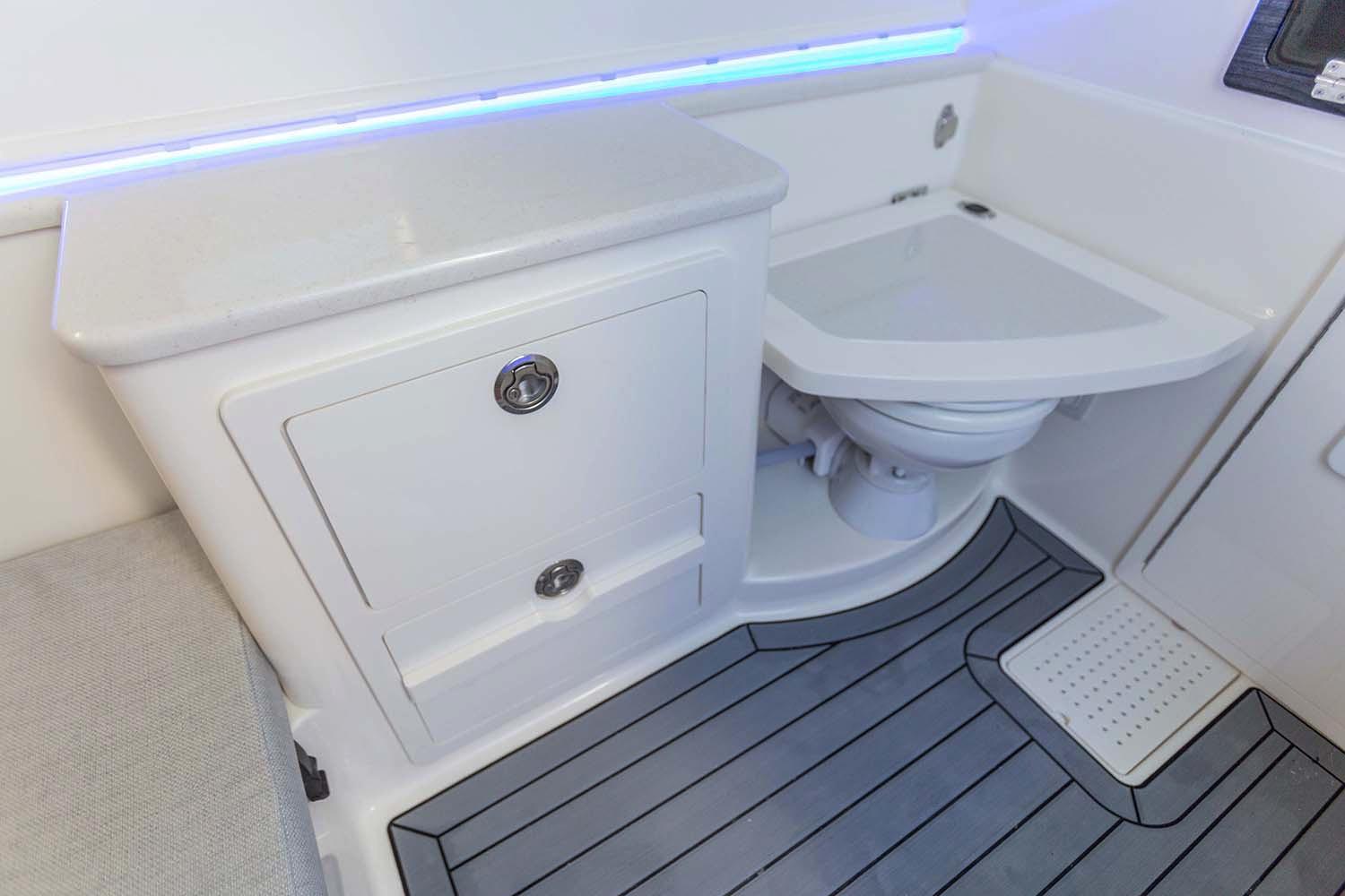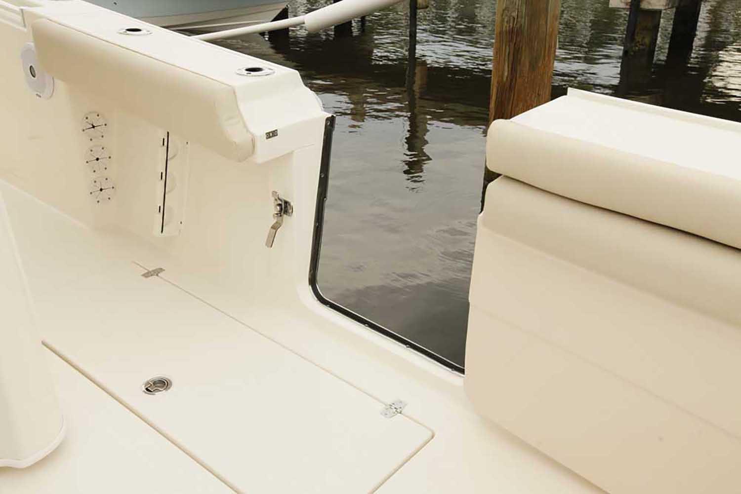 The 350 fishes hard and plays easy with a rare combination of high style and ultra-performance. A double-stepped hull makes getting to the fishing grounds fast and fuel efficient while elegant topside amenities bathe you in style and comfort. Tournament capable fishing features include dual 42-gallon bait tanks, 2 huge in-floor fishboxes that pump overboard, a full tackle station and bait prep area, plus a hidden below deck rod locker that’s lockable. With an 11’2” beam and a clean, wide open cockpit, there’s plenty of room for a group of anglers to all fish at once with plenty of space to spare or to chase around a hot fish at boatside. An inward opening side door makes pulling aboard a big tuna or dropping in a diver safe and easy.When it’s time to relax, the 350 converts to a cruising and sandbar hopping pleasure vessel. Comfortable and elegantly appointed seating for 11 includes triple, independent helm seats, an integrated chaise lounge big enough for two, and full sun lounge capability with forward facing backrests. There’s even a hideaway bow table that electronically raises out of the floor that’s perfect for a picnic lunch or party spread. Plus, the boat comes with 7 insulated boxes to provide more than enough cooler space and has tons of dry storage for beach gear, water toys and floats. To top it all off, the inside of the console houses a spacious, airy berth that’s surrounded by a refined interior with wooden cabinetry, an electric head and a combination sink/shower.