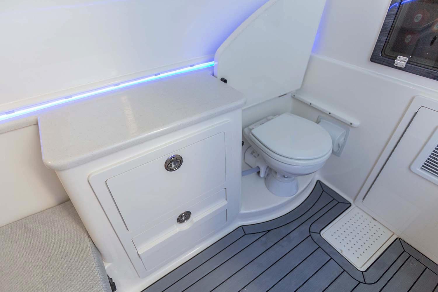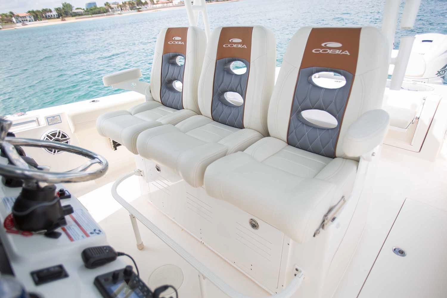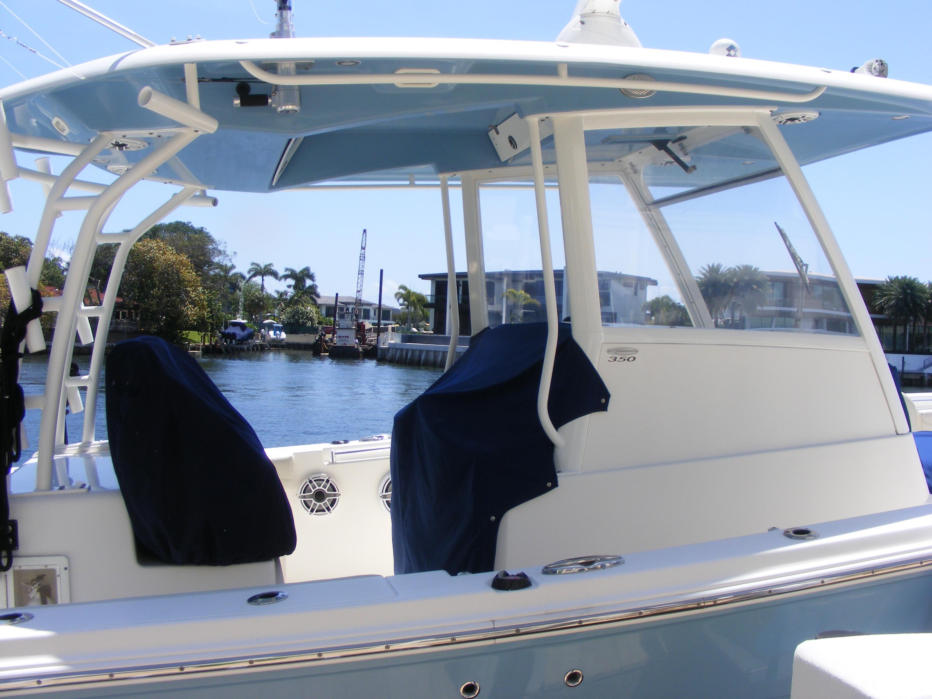 The 350 fishes hard and plays easy with a rare combination of high style and ultra-performance. A double-stepped hull makes getting to the fishing grounds fast and fuel efficient while elegant topside amenities bathe you in style and comfort. Tournament capable fishing features include dual 42-gallon bait tanks, 2 huge in-floor fishboxes that pump overboard, a full tackle station and bait prep area, plus a hidden below deck rod locker that’s lockable. With an 11’2” beam and a clean, wide open cockpit, there’s plenty of room for a group of anglers to all fish at once with plenty of space to spare or to chase around a hot fish at boatside. An inward opening side door makes pulling aboard a big tuna or dropping in a diver safe and easy.When it’s time to relax, the 350 converts to a cruising and sandbar hopping pleasure vessel. Comfortable and elegantly appointed seating for 11 includes triple, independent helm seats, an integrated chaise lounge big enough for two, and full sun lounge capability with forward facing backrests. There’s even a hideaway bow table that electronically raises out of the floor that’s perfect for a picnic lunch or party spread. Plus, the boat comes with 7 insulated boxes to provide more than enough cooler space and has tons of dry storage for beach gear, water toys and floats. To top it all off, the inside of the console houses a spacious, airy berth that’s surrounded by a refined interior with wooden cabinetry, an electric head and a combination sink/shower.
