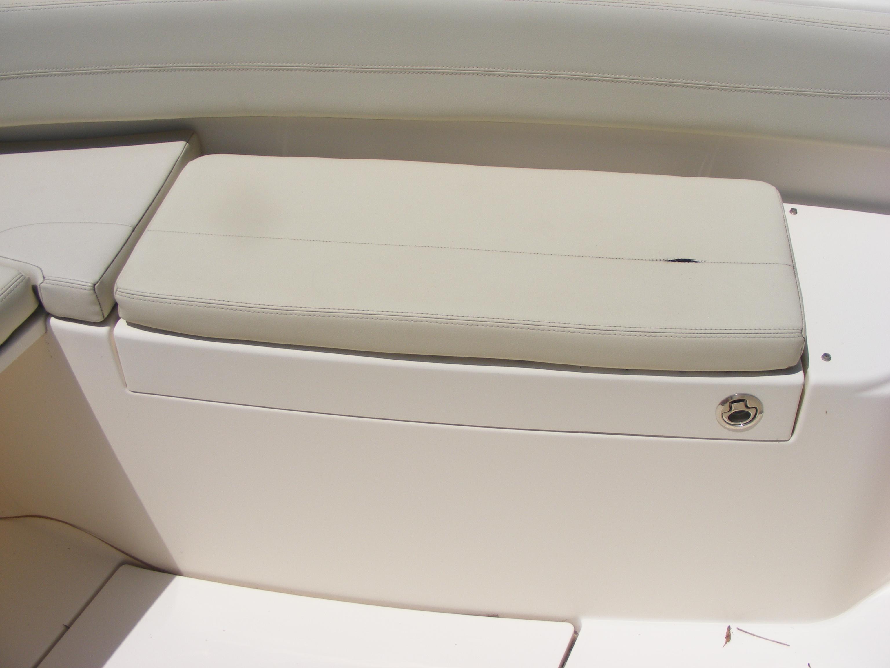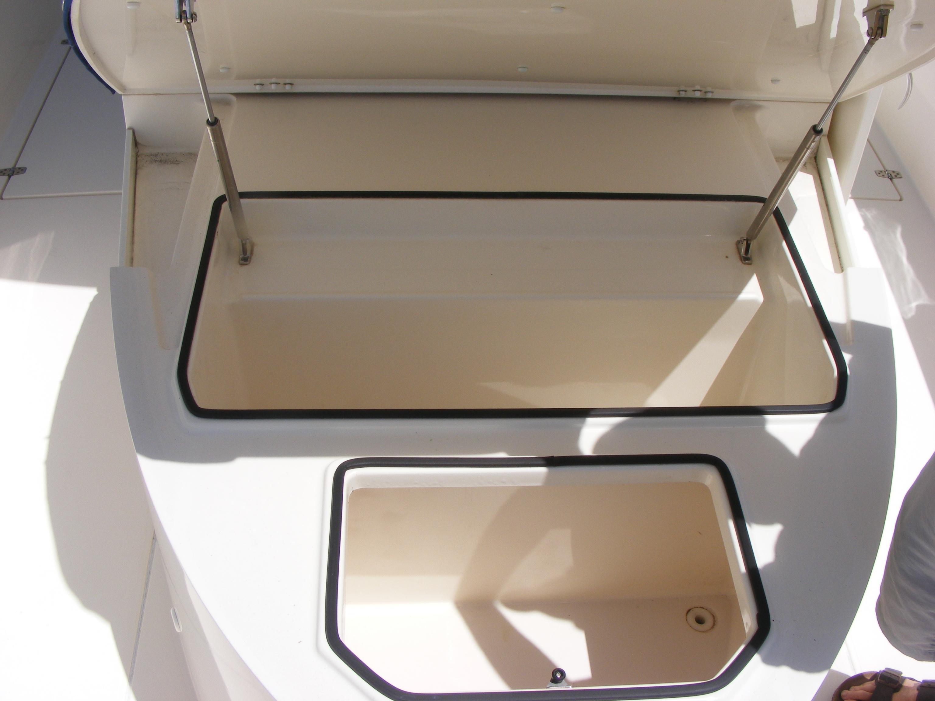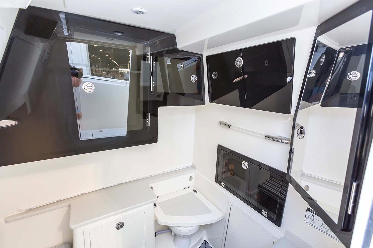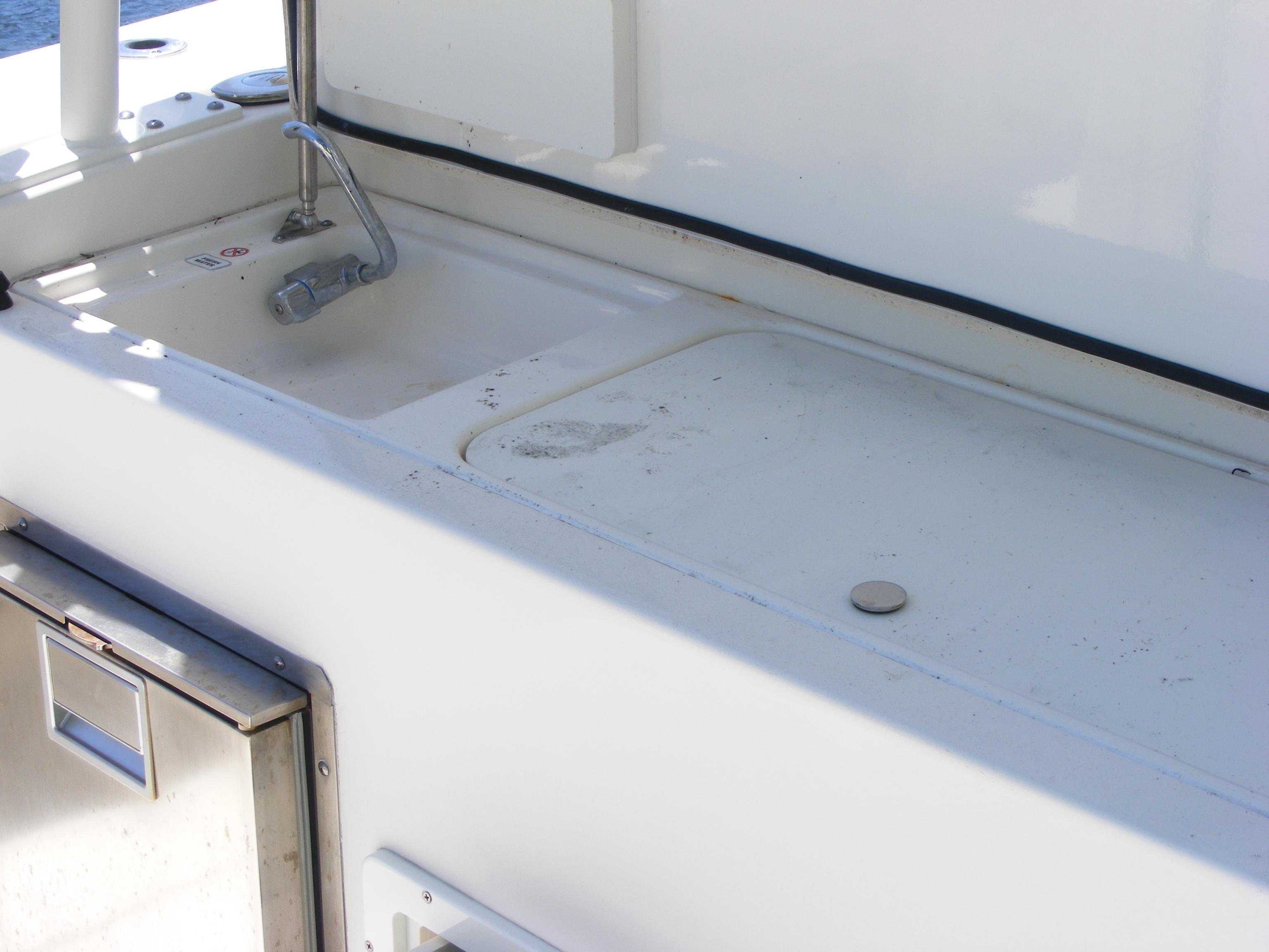 The 350 fishes hard and plays easy with a rare combination of high style and ultra-performance. A double-stepped hull makes getting to the fishing grounds fast and fuel efficient while elegant topside amenities bathe you in style and comfort. Tournament capable fishing features include dual 42-gallon bait tanks, 2 huge in-floor fishboxes that pump overboard, a full tackle station and bait prep area, plus a hidden below deck rod locker that’s lockable. With an 11’2” beam and a clean, wide open cockpit, there’s plenty of room for a group of anglers to all fish at once with plenty of space to spare or to chase around a hot fish at boatside. An inward opening side door makes pulling aboard a big tuna or dropping in a diver safe and easy.When it’s time to relax, the 350 converts to a cruising and sandbar hopping pleasure vessel. Comfortable and elegantly appointed seating for 11 includes triple, independent helm seats, an integrated chaise lounge big enough for two, and full sun lounge capability with forward facing backrests. There’s even a hideaway bow table that electronically raises out of the floor that’s perfect for a picnic lunch or party spread. Plus, the boat comes with 7 insulated boxes to provide more than enough cooler space and has tons of dry storage for beach gear, water toys and floats. To top it all off, the inside of the console houses a spacious, airy berth that’s surrounded by a refined interior with wooden cabinetry, an electric head and a combination sink/shower.
