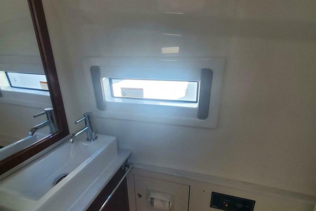 - V berth below with drop down high gloss table, converts to sleeping berth