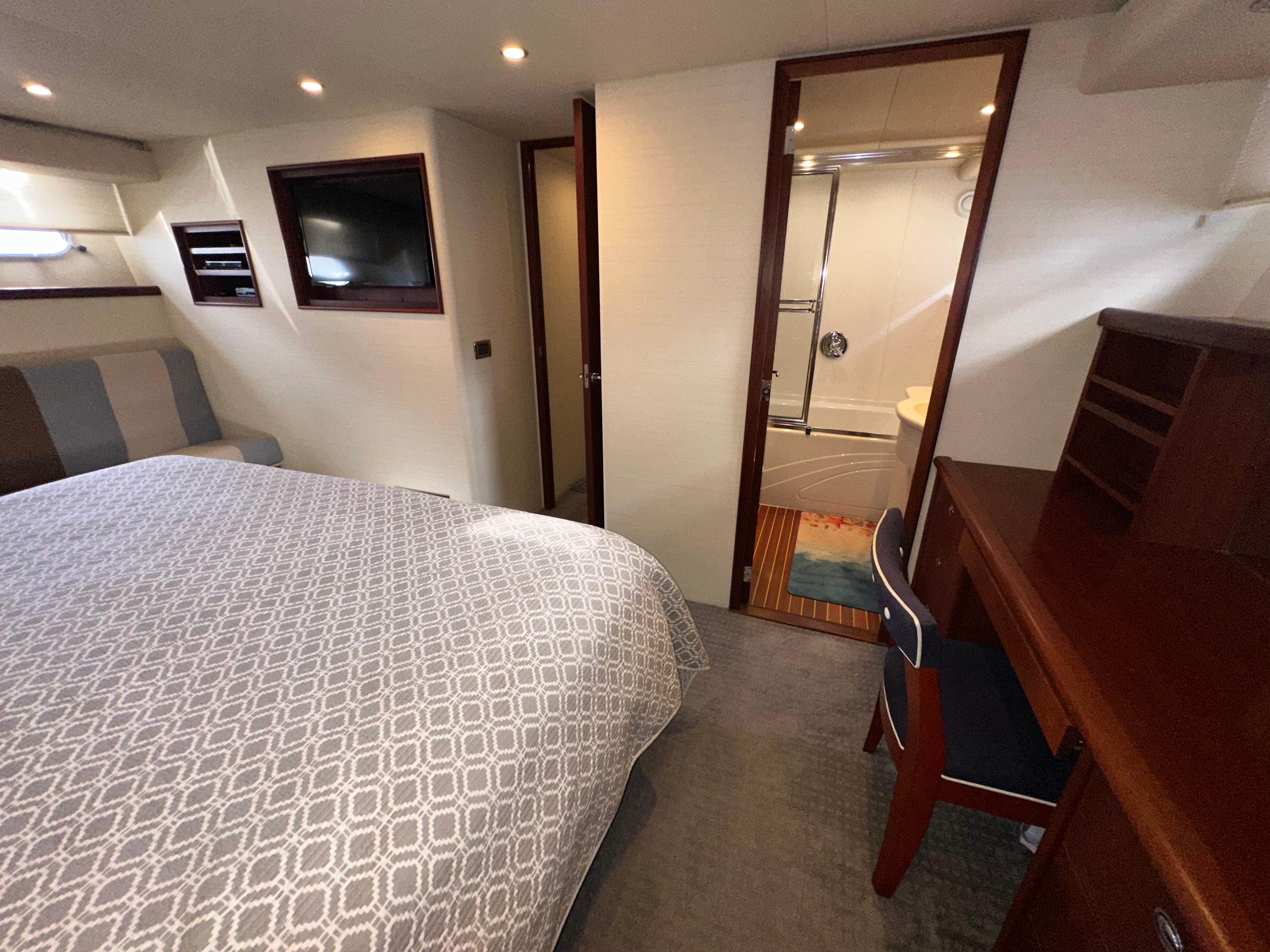- Cherry desk on starboard side, with bookshelves, 6-drawer storage and chair