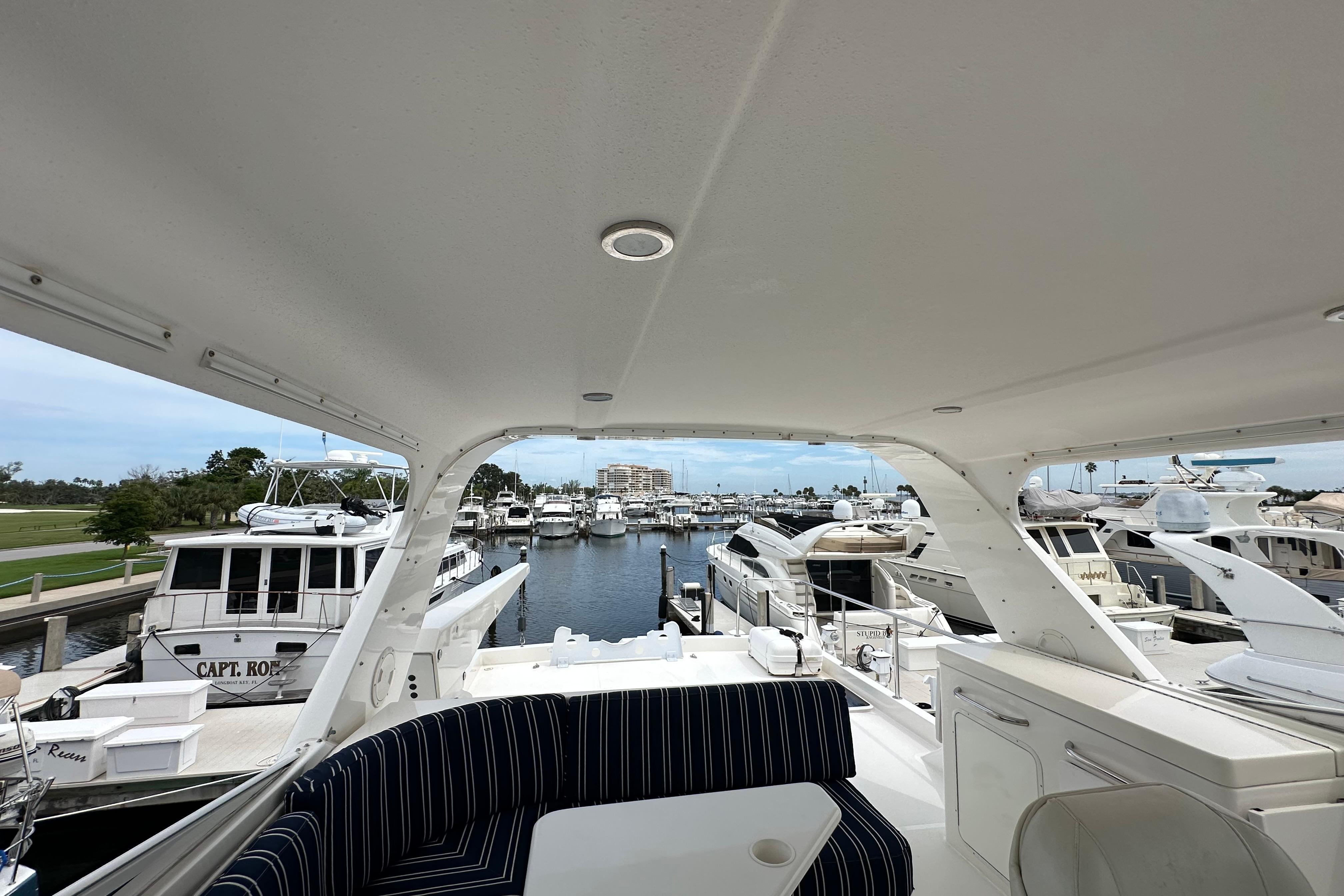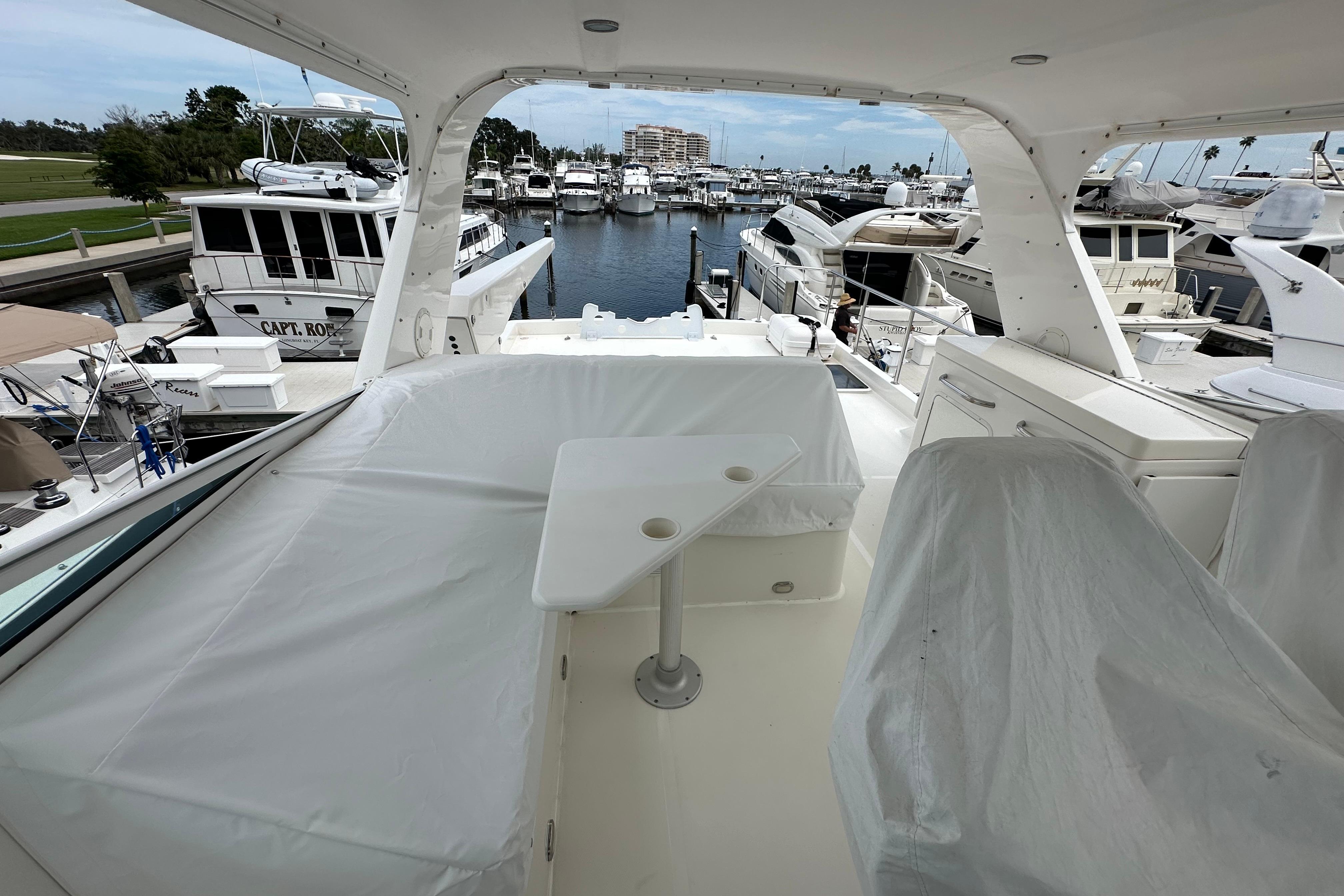 The covered aft deck area features teak flooring, sliding door access to the salon, a stair to the flybridge and a transom door to access the large swim platform. Engine access is thru a hatch under the bench seat.