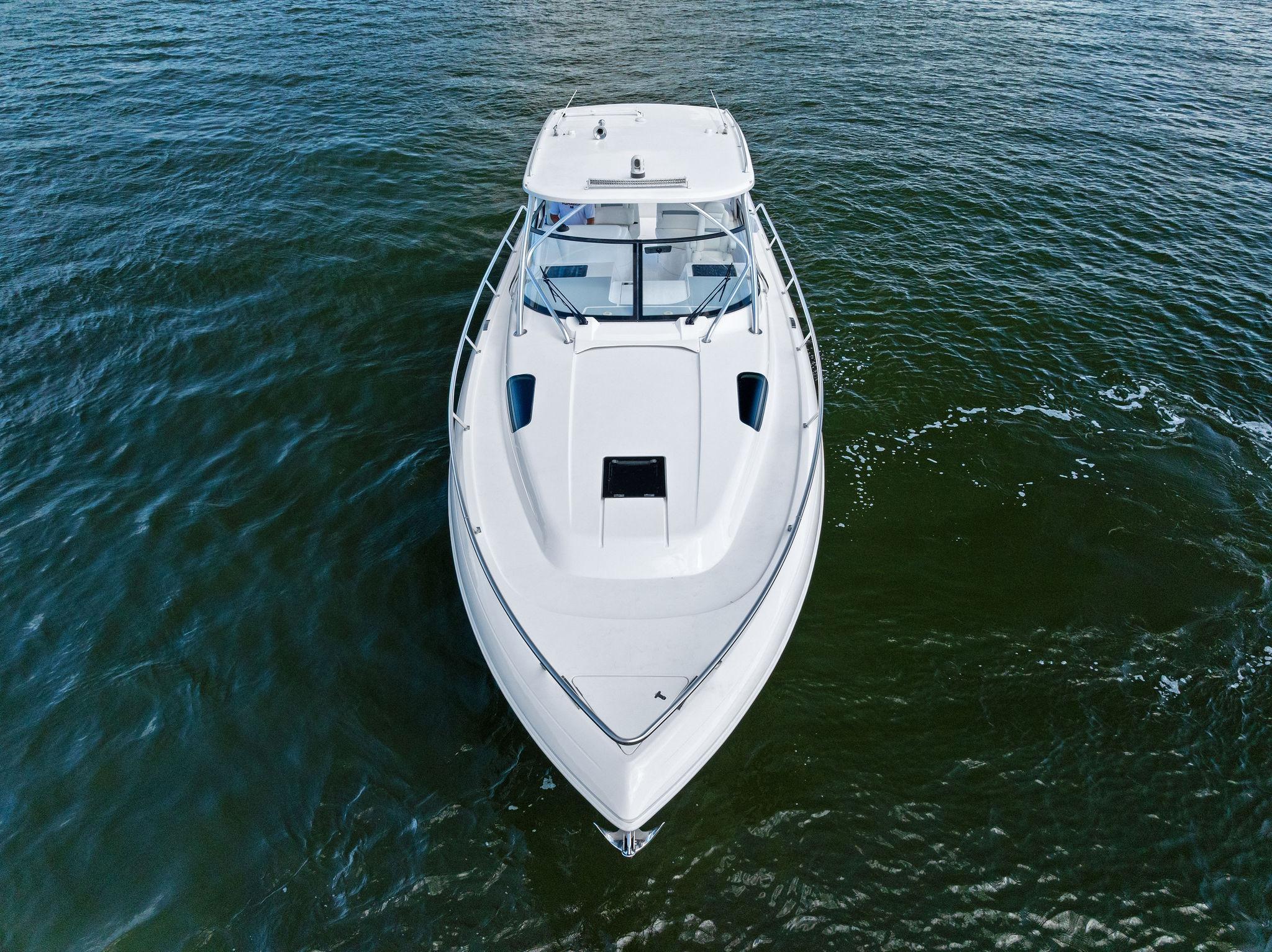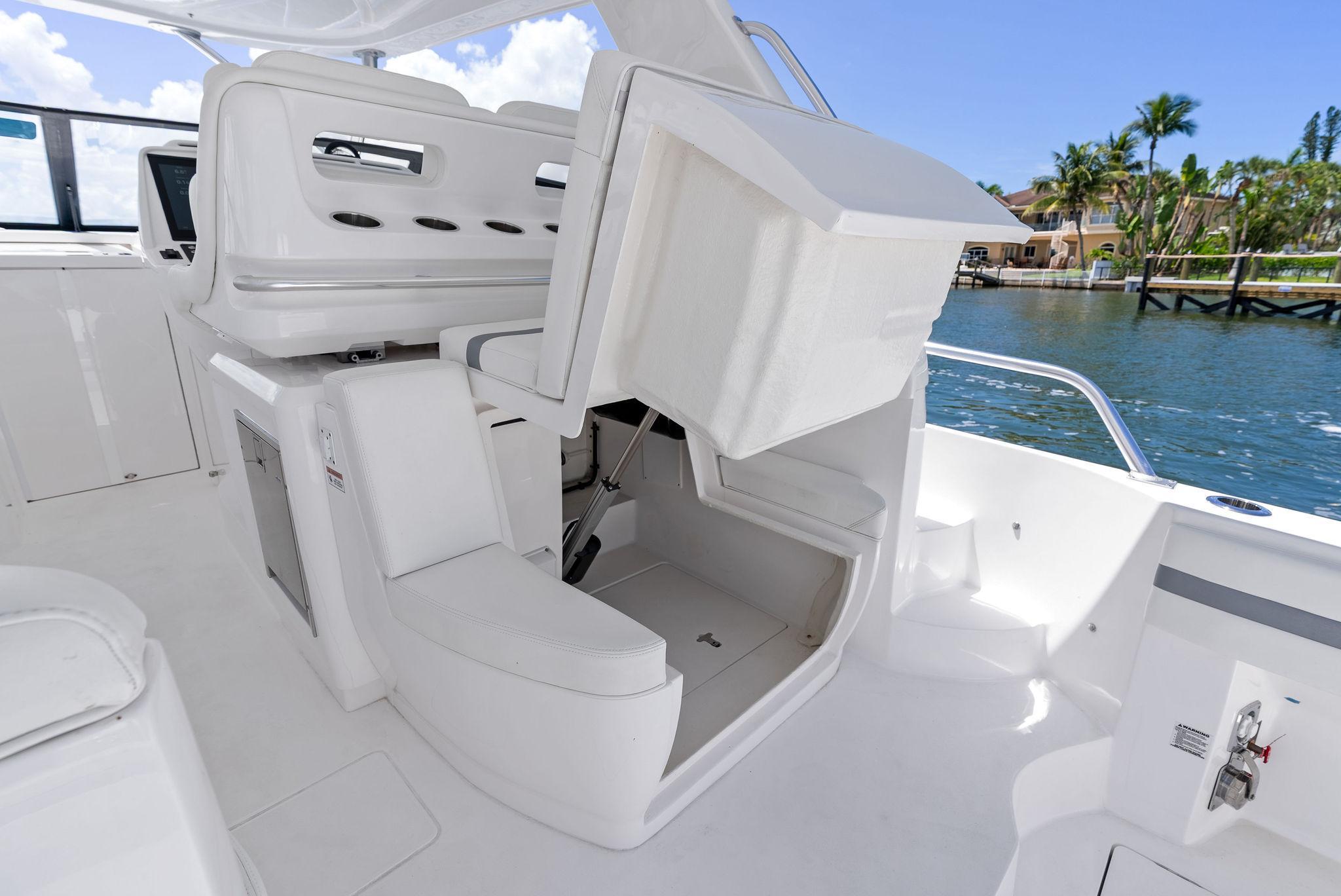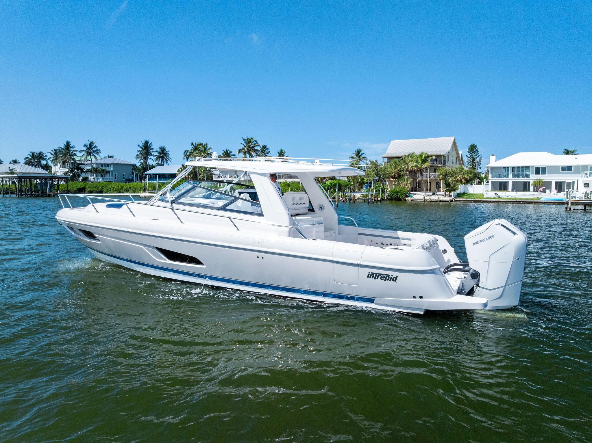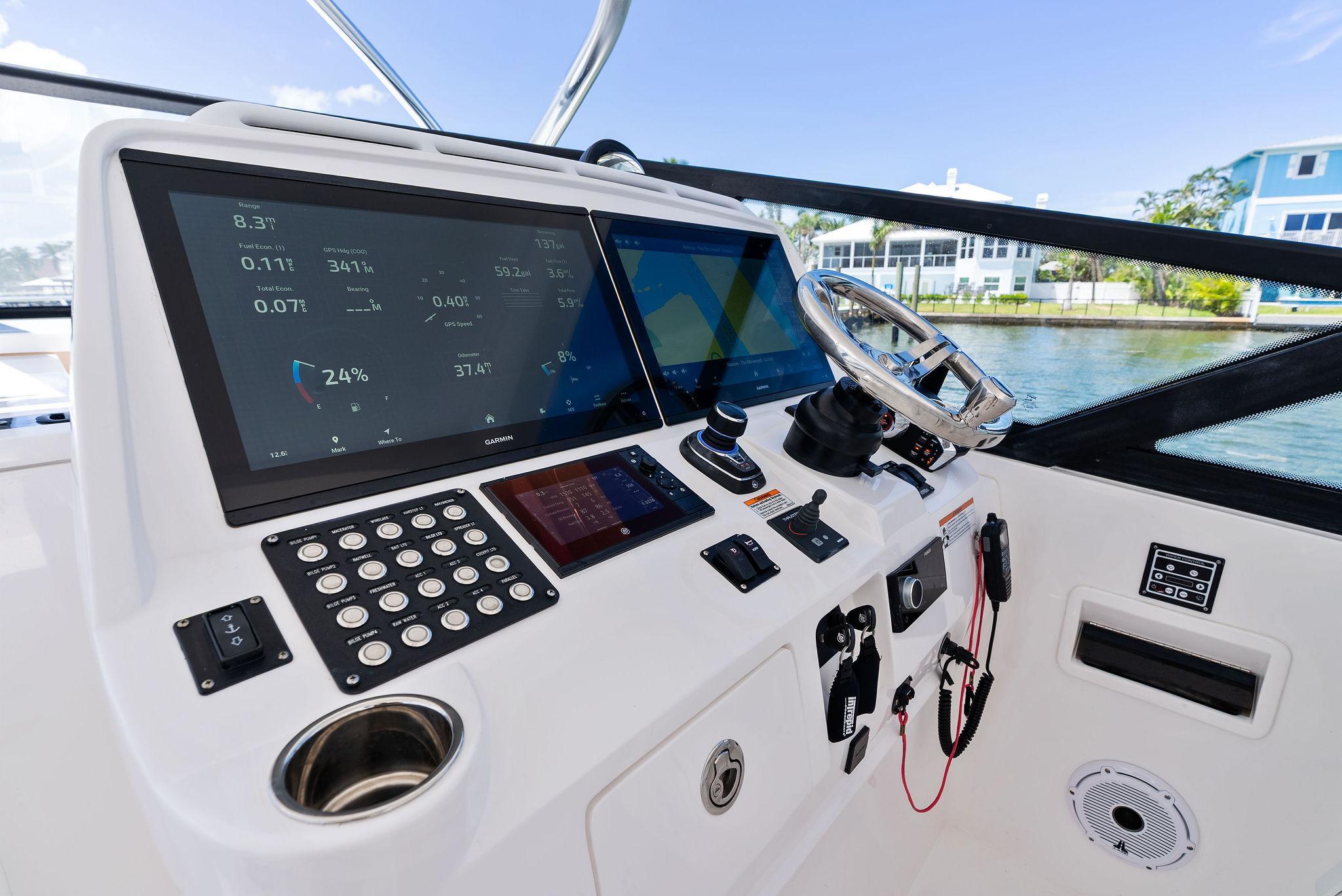 The Intrepid 438 Evolution is a versatile cruising vessel, thoughtfully designed for extended stays, offshore Bluewater fishing adventures, or simply enjoying a fun-filled day at your local sandbar. This 438 Evolution boasts low hours on powerful twin 600 hp Verrado's, paired with a gas-powered Westerbeke generator, eliminating the need to manage multiple fuel types. The helm is outfitted with dual expansive Garmin displays, delivering a true yacht-like experience. Smartly arranged controls, including a joystick for effortless maneuvering, allow the captain to fine-tune the helm seat and confidently set off. When the sun goes down, the onboard FLIR thermal imaging camera ensures safe and enhanced navigation after dark.