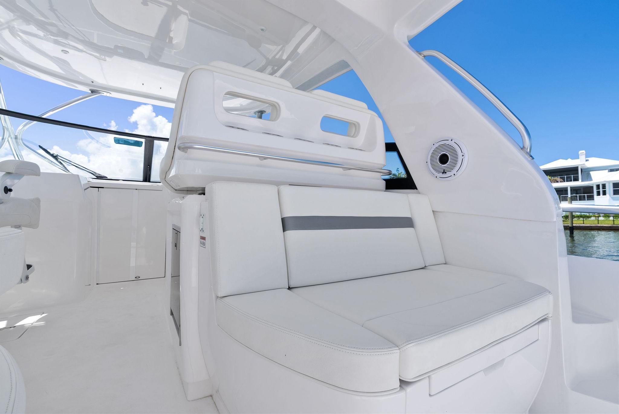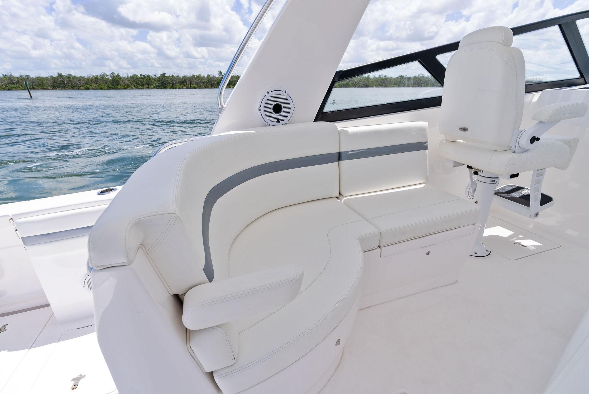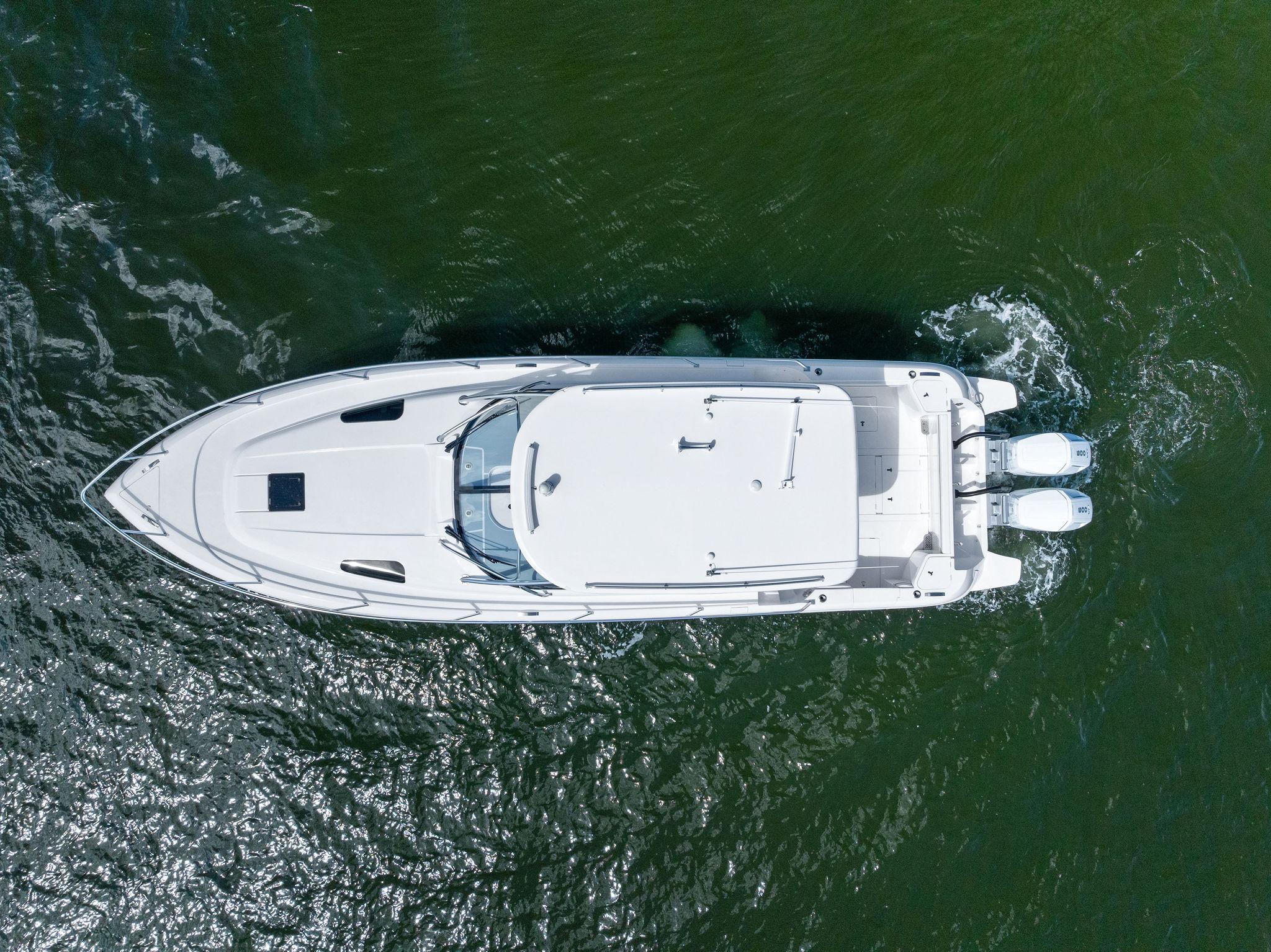 The Intrepid 438 Evolution is a versatile cruising vessel, thoughtfully designed for extended stays, offshore Bluewater fishing adventures, or simply enjoying a fun-filled day at your local sandbar. This 438 Evolution boasts low hours on powerful twin 600 hp Verrado's, paired with a gas-powered Westerbeke generator, eliminating the need to manage multiple fuel types. The helm is outfitted with dual expansive Garmin displays, delivering a true yacht-like experience. Smartly arranged controls, including a joystick for effortless maneuvering, allow the captain to fine-tune the helm seat and confidently set off. When the sun goes down, the onboard FLIR thermal imaging camera ensures safe and enhanced navigation after dark.