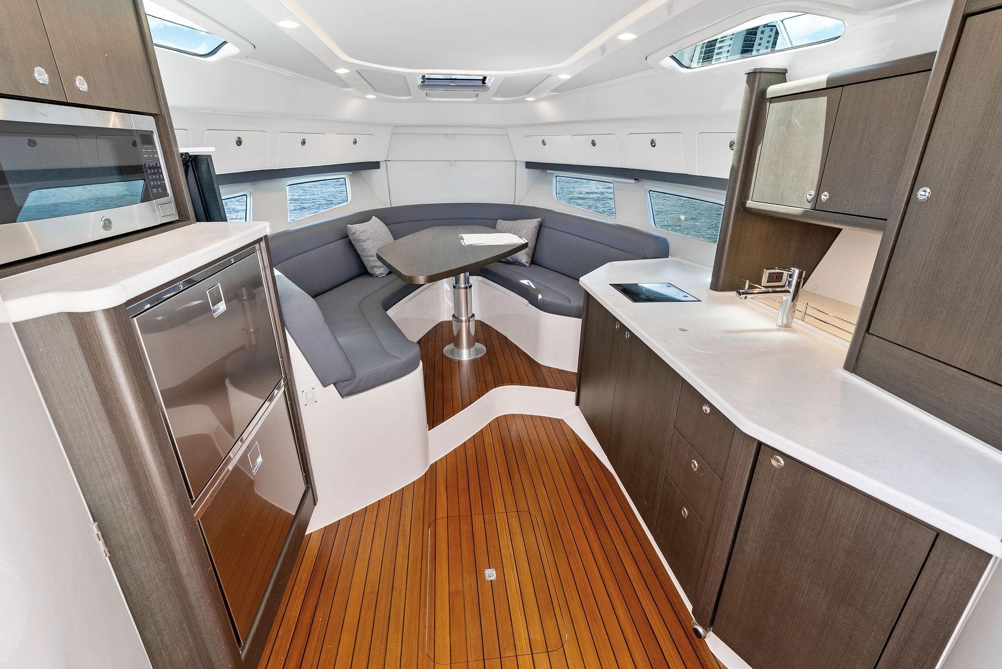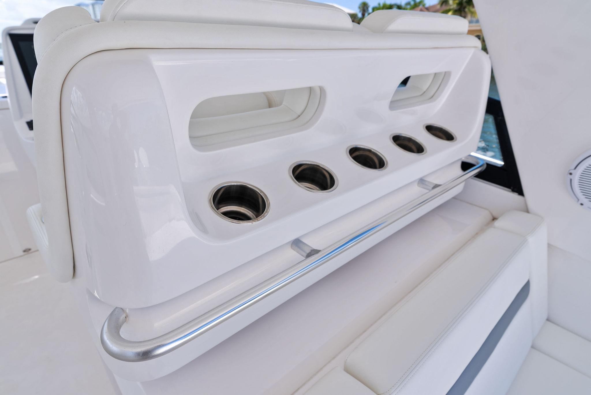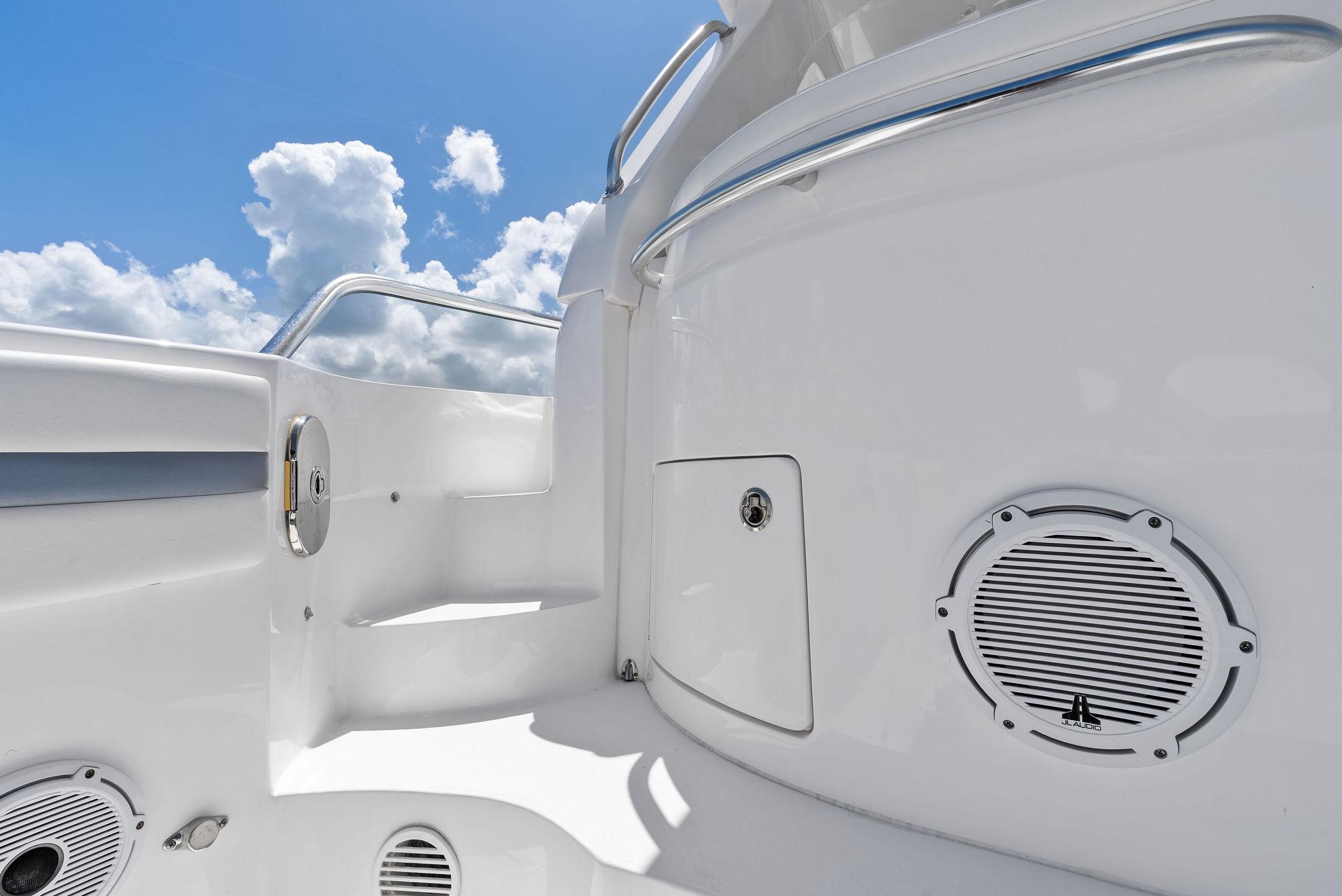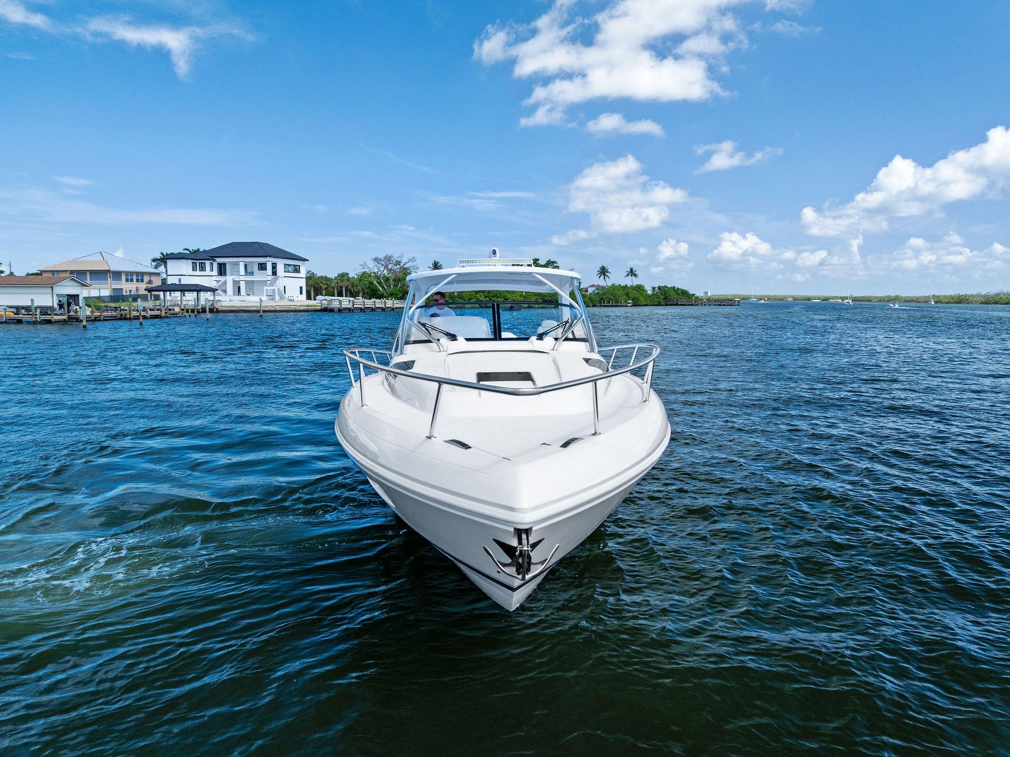 The Intrepid 438 Evolution is a versatile cruising vessel, thoughtfully designed for extended stays, offshore Bluewater fishing adventures, or simply enjoying a fun-filled day at your local sandbar. This 438 Evolution boasts low hours on powerful twin 600 hp Verrado's, paired with a gas-powered Westerbeke generator, eliminating the need to manage multiple fuel types. The helm is outfitted with dual expansive Garmin displays, delivering a true yacht-like experience. Smartly arranged controls, including a joystick for effortless maneuvering, allow the captain to fine-tune the helm seat and confidently set off. When the sun goes down, the onboard FLIR thermal imaging camera ensures safe and enhanced navigation after dark.