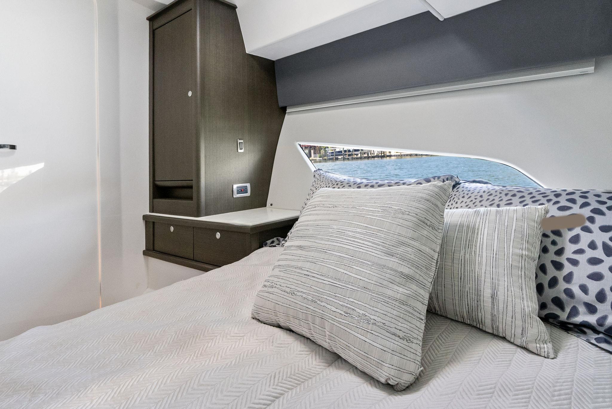 The interior is tastefully appointed with contemporary wood finishes, complemented by a refined blend of soft-touch surfaces. White solid surface countertops provide a clean, striking contrast, all tied together with a chic selection of bedding and pillows that elevate the space with a modern, inviting feel.