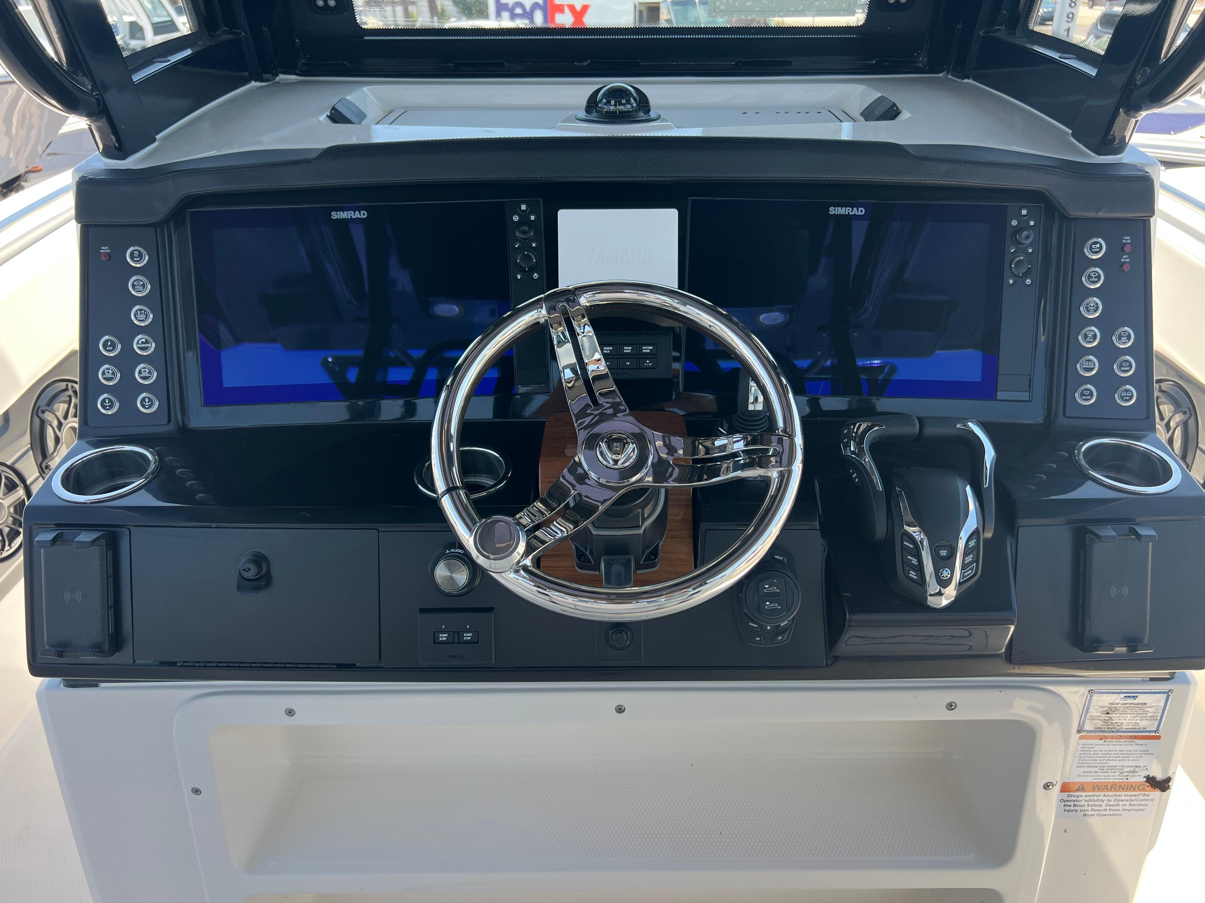 This is the Brand New Model from Robalo, the R300, and it is a Knockout! Robalo did an amazing job with the design and layout of this boat. They thought about everything. This is one of the only 30 foot boats out there that has seating for three at the helm. There is very comfortable seating everywhere and still plenty of room to walk around weather you have a bunch of people on the boat or going out fishing for the day. This R300 is powered by the new Yamaha 350 HP 4-Strokes giving this boat tremendous power for coming out of the hole and cruising strong. It also has the Yamaha Helm Master Joystick Control w/ Auto Pilot. The boat has a ton of standard features including a Shower that comes out of the Hard Top in the Back! It is set up with Dual Simrad 16" Displays, VHF Radio, JL Audio Stereo, & Underwater Lighting. It is also equipped with the Lenco Pro Trim Tab System (Auto Trim Tabs). The head area is very large and easy to get into and has an Electric Head w/ Overboard Discharge. Other options include Bow Table w/ Cushion, Sea Deck Helm Mat, Cabin Wood Flooring, Stainless Drink/ Rod Holders, Tackle Storage, & Polished Stainless Anchor.