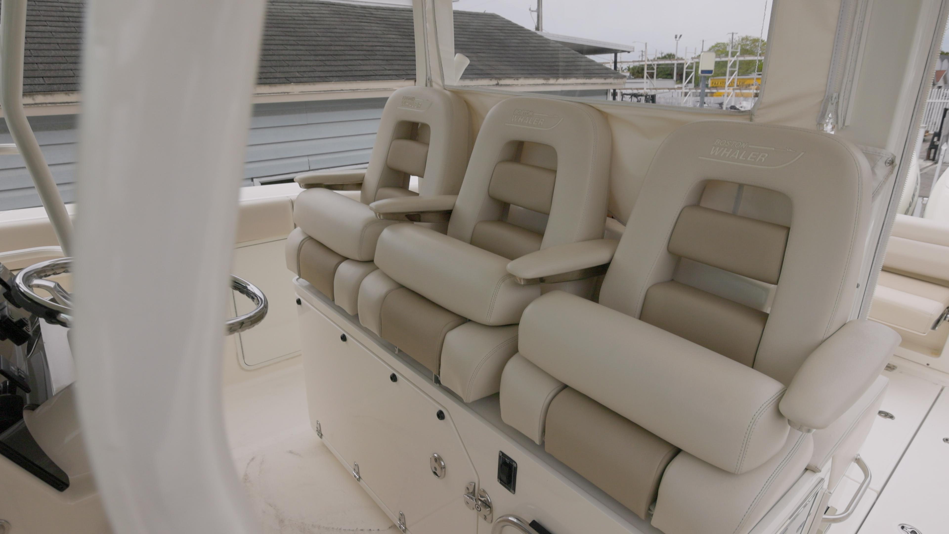 - Helm and companion bolster style seats (3) with fold-down armrests (center seat is electrically actuated) (side seats have manual fore and aft slides)