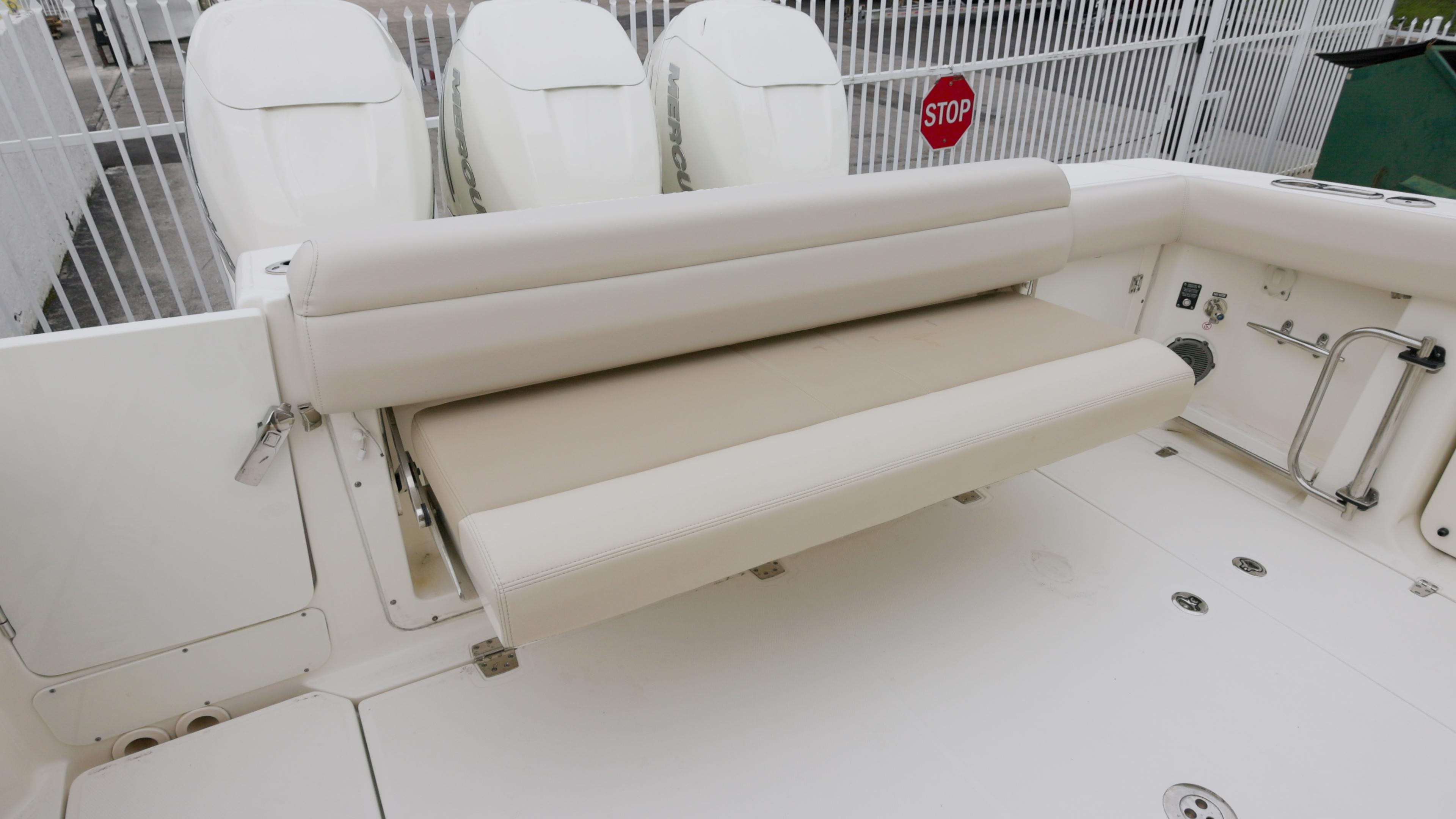 - Aft facing couch with insulated cooler storage under hinged seat, stainless steel cup holders recessed into seating arms (2)(optional 40 gallon livewell under seat)