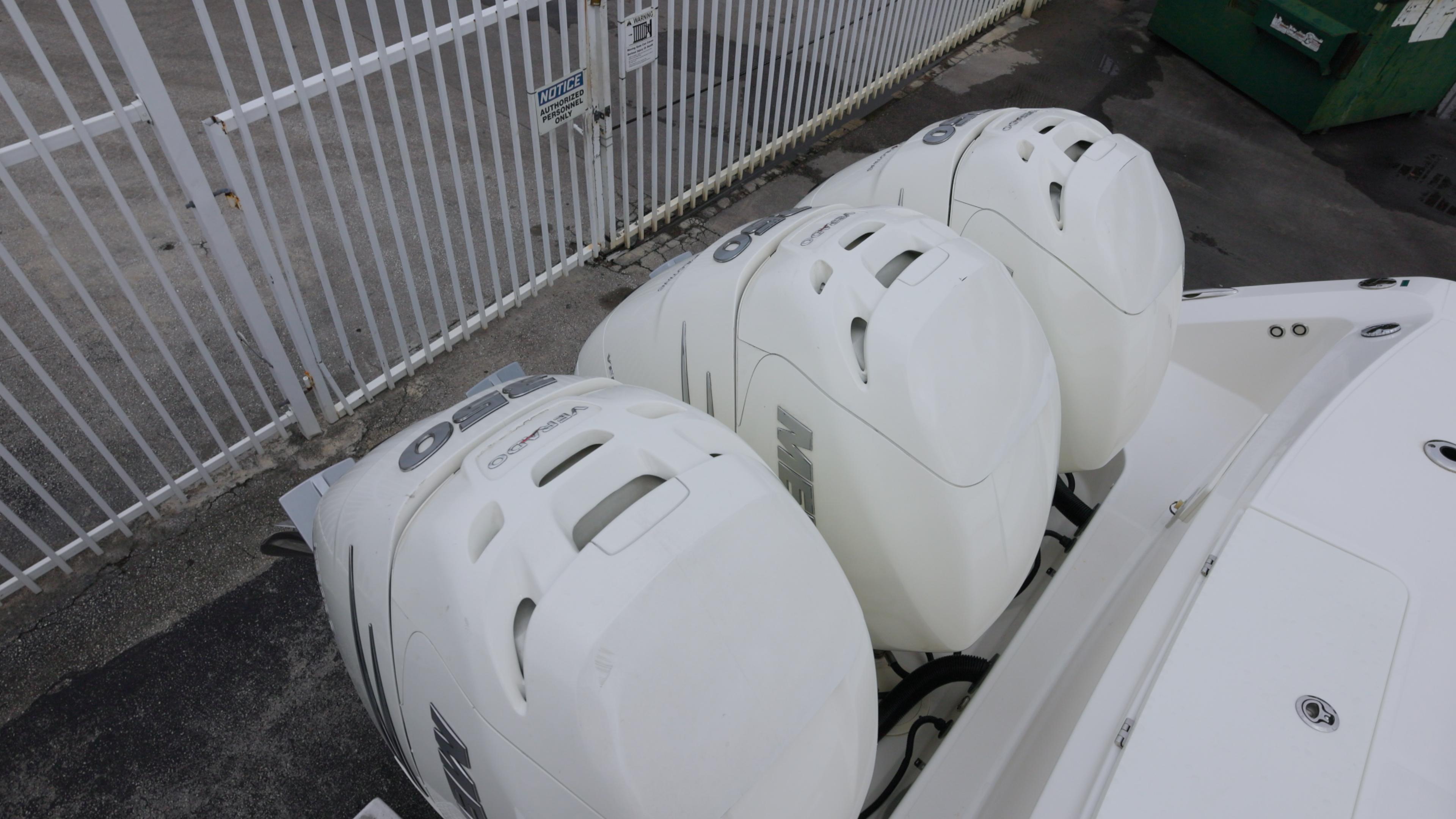 Experience luxury and performance with this pristine center console boat, powered by triple 350hp White Mercury Verado outboards with Joystick Piloting for effortless docking and control. With only 183 hours and all services up to date, this vessel is ready for your next adventure.Key Features:Stabilization & Comfort: Equipped with a SeaKeeper gyro stabilizer to eliminate boat roll, plus bow and cockpit sunshades, an aft cockpit table, and a bow table for ultimate relaxation.Fishing Ready: Features radial outriggers, fold-down trolling seats, freezer plates, and a cockpit fold-out bench seat for versatility on the water.Advanced Electronics: Navigate with confidence using dual 15" Raymarine GS165 GPS displays, open array radar, AIS, and thermal night vision. Stay connected with satellite radio and monitor systems with Active Engine Trim and engine flush system.Premium Amenities: Enjoy a premium audio package, underwater lights, spotlight, 12V receptacles, and enclosure curtains for all-weather comfort. A diesel generator ensures off-grid power.Additional Highlights: Includes a stainless steel anchor, cockpit fold-out bench seat, and spacious deck layoutfor entertaining or fishing.This boat is in immaculate condition and loaded with high-end features, making it perfect for fishing, cruising, or entertaining. Don’t miss out on this turnkey vessel!Contact for pricing and details.