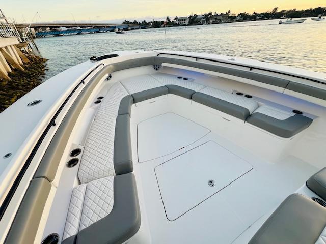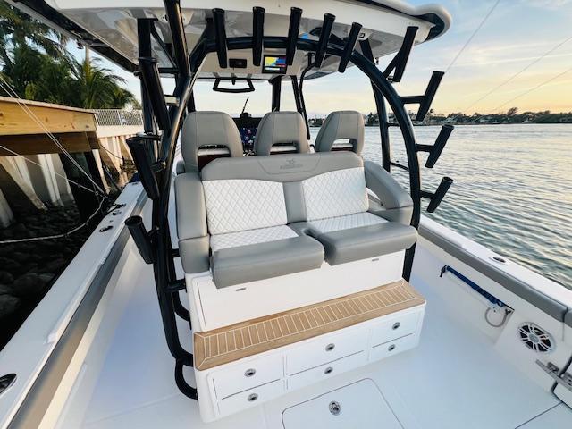 Seating and Upholstery4X Deluxe Helm Seating with Mezzanine Seating and Prep Area with Countertop, Electric Grill, Sink, Drawers, and Tackle and Tray Storage Compartments Forward Seating with Flip-Up Backrests (2) Forward Console Settee with Cooler Integrated Flush Folding Transom Seat Sileather™ Eco-Friendly Upholstery Fabric Standard on all Seating