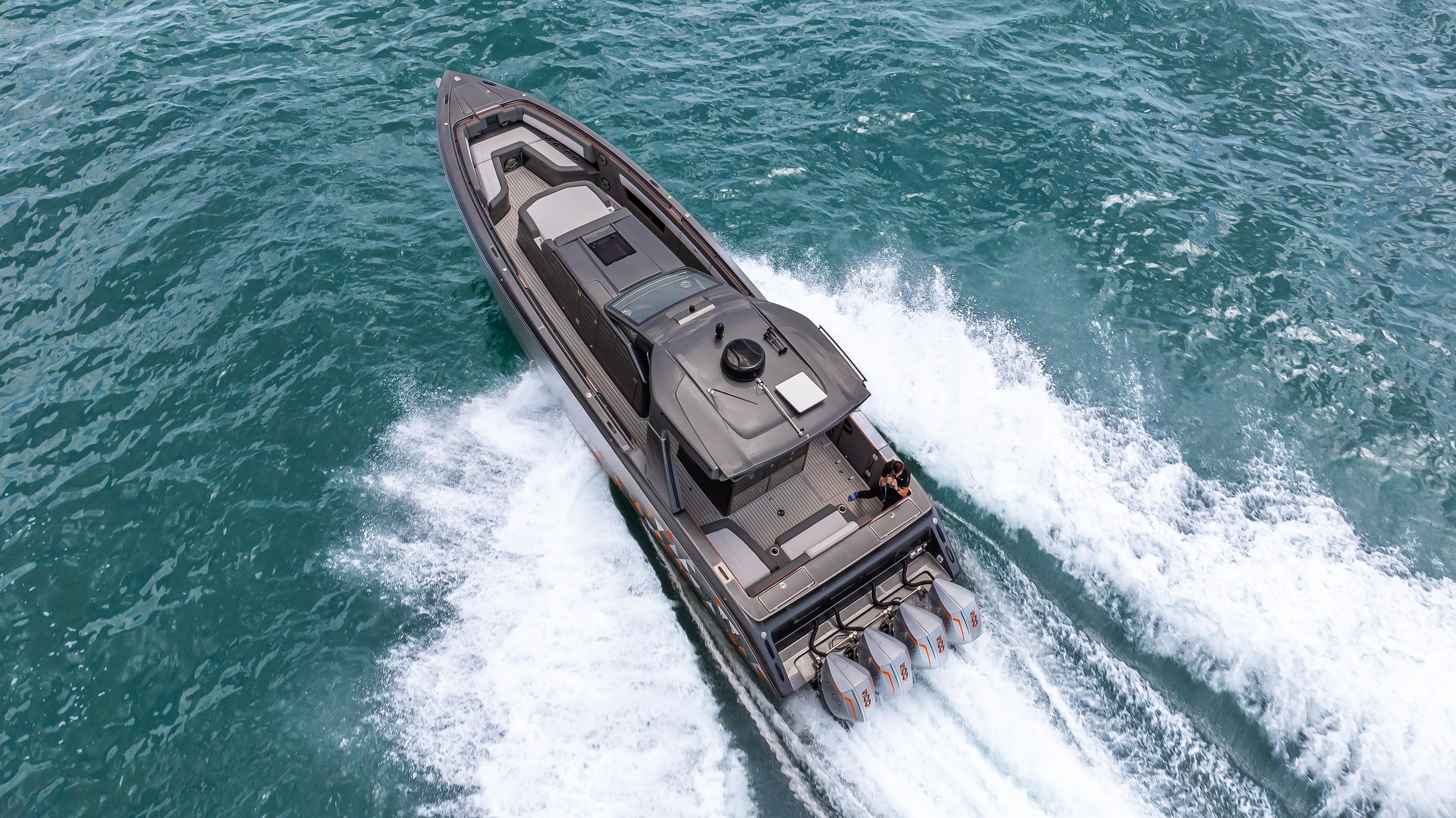 The four-pillar hardtop was skillfully engineered to provide a lower center of gravity in order to increase performance, yet not compromise comfort or the aesthetics. This all carbon-fiber hardtop features double curvature, a frameless clear-laminated safety glass for wind protection, integrated flood lights, boarding handrails, ambient lightning, and lastly, a telescopic sun shade.