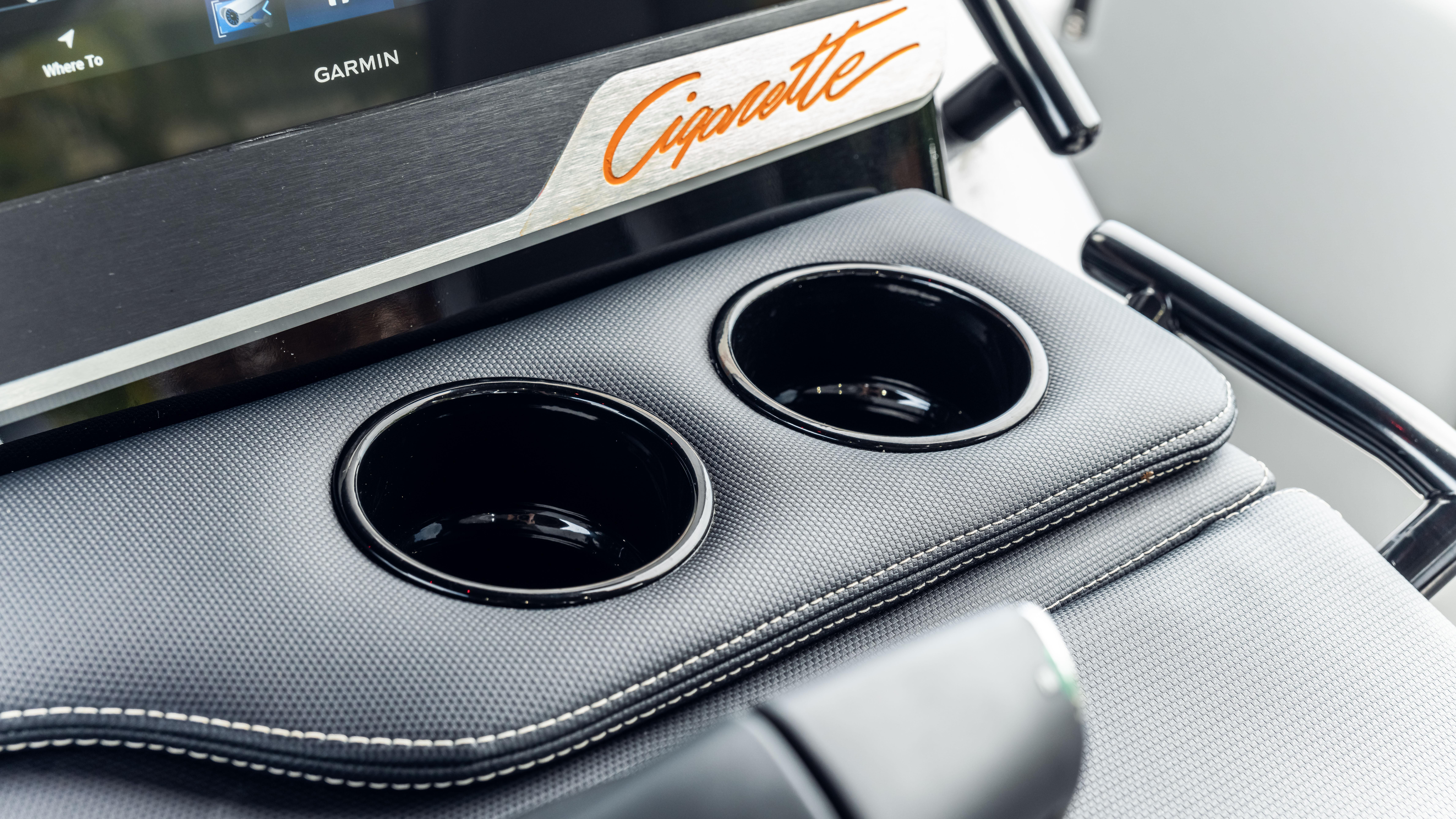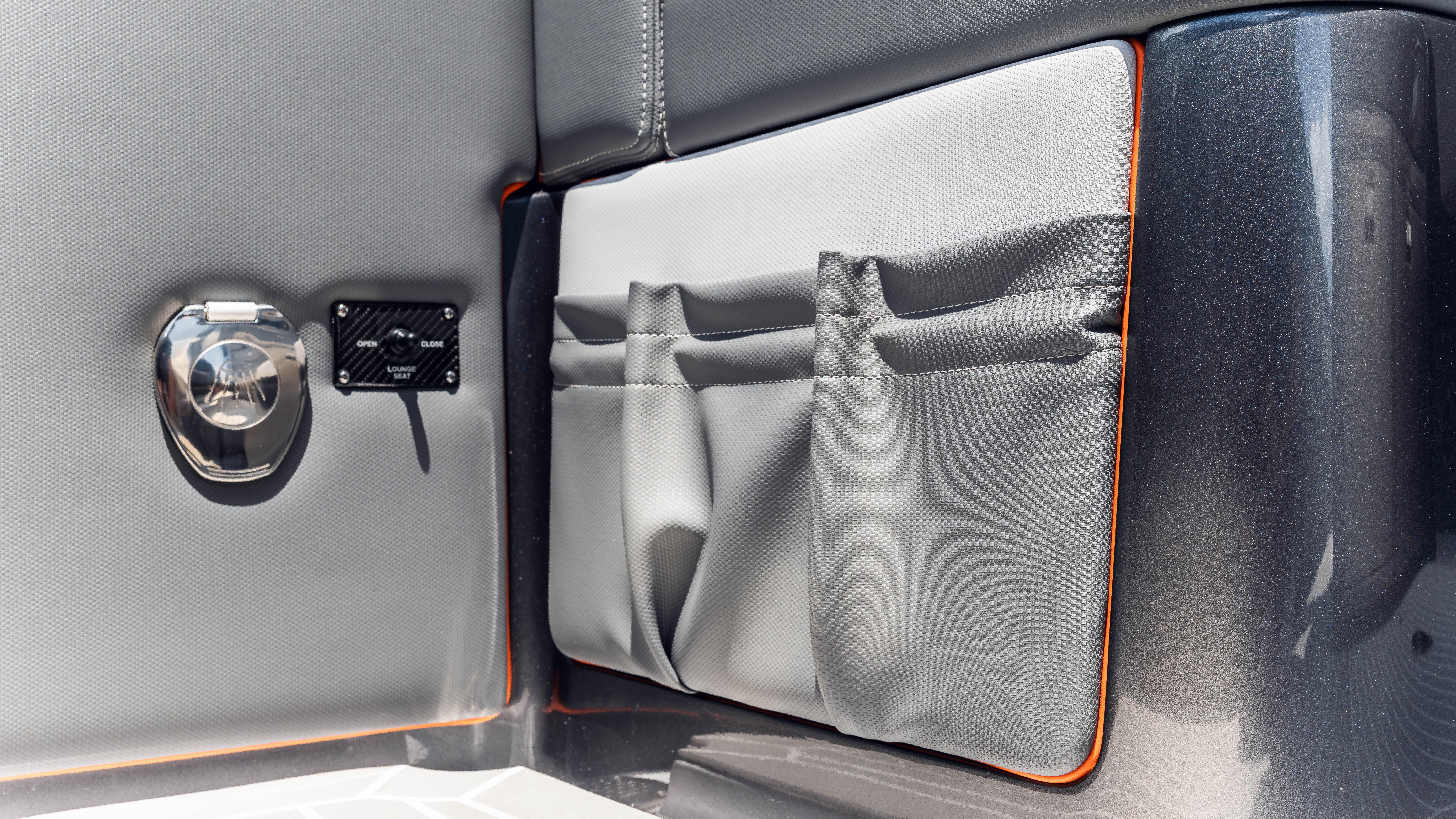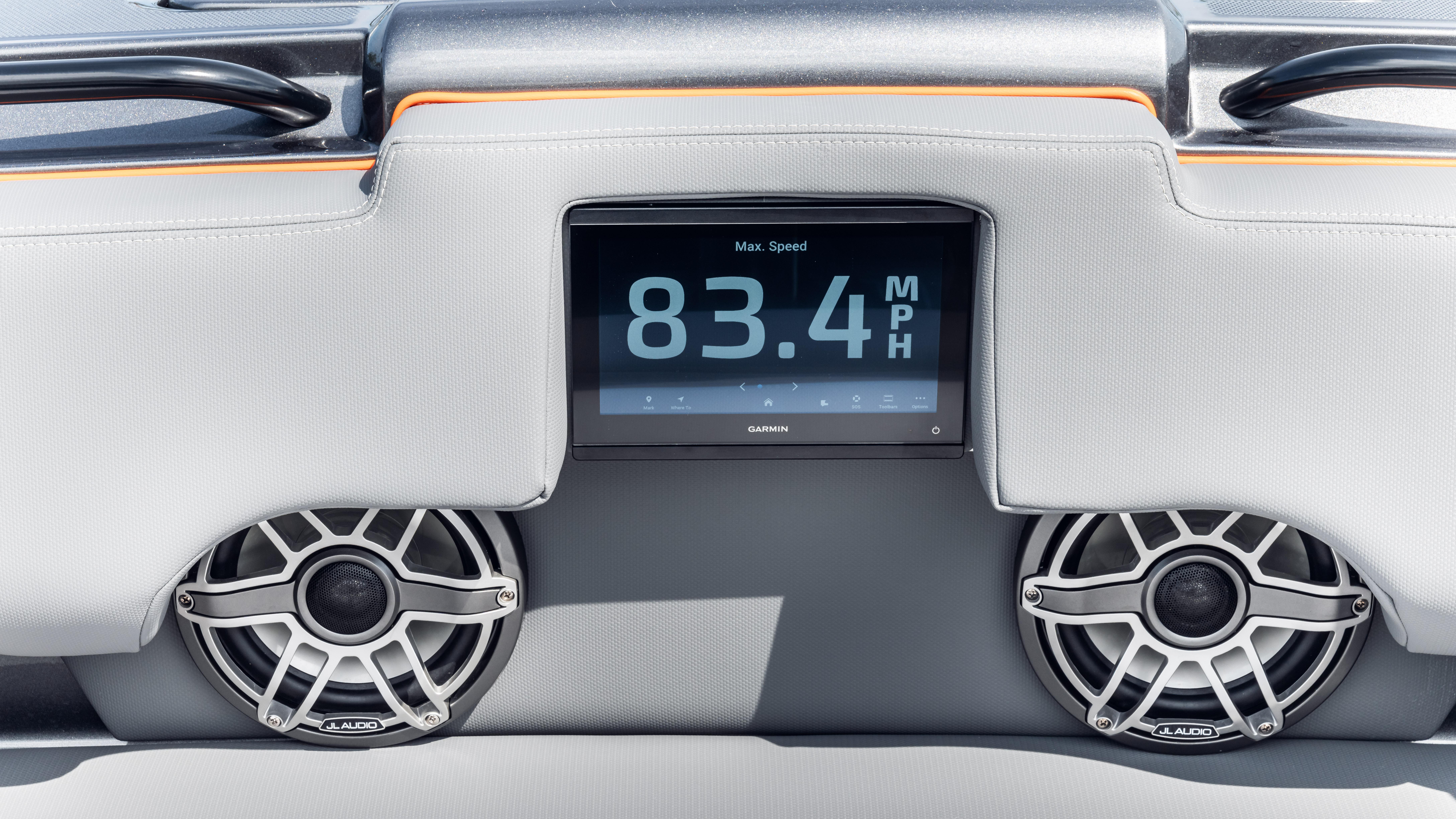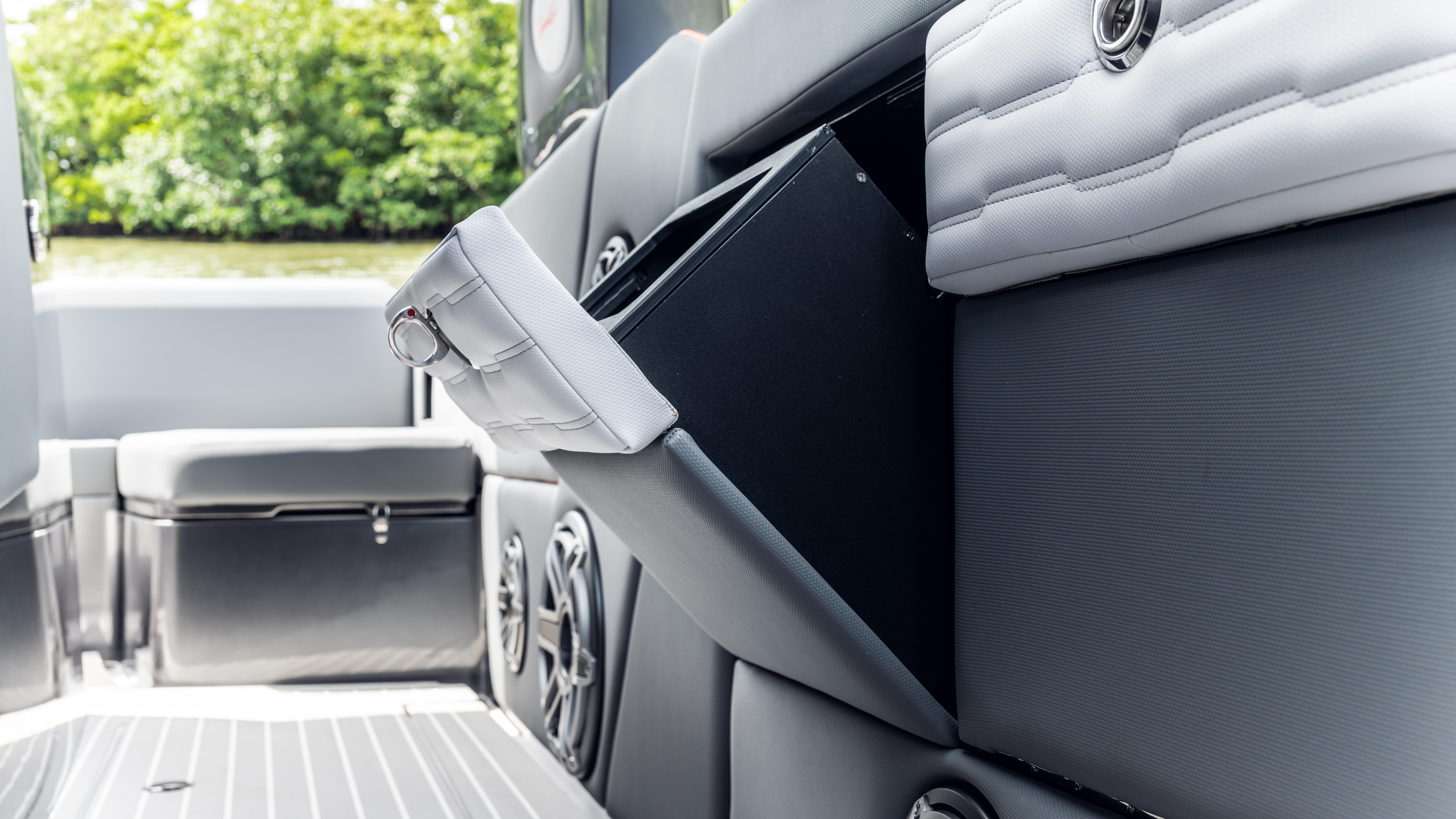 Helm DetailsThe helm features three Garmin 8617 chartplotters flush mounted to an instrument panel CNC cut from a solid block of aluminum. The nano-coated instrument panel face is resistant to heat, reflections and fingerprints, and the perimeter of the panel is lit by RGB LED accent lighting to provide a distinct glow, creating the illusion that the dash is floating. The helm integrates cup holders and two glove boxes. Passengers can feel secure with stainless steel grab bars, and be in total comfort with an ergonomic CNC machined footrest.