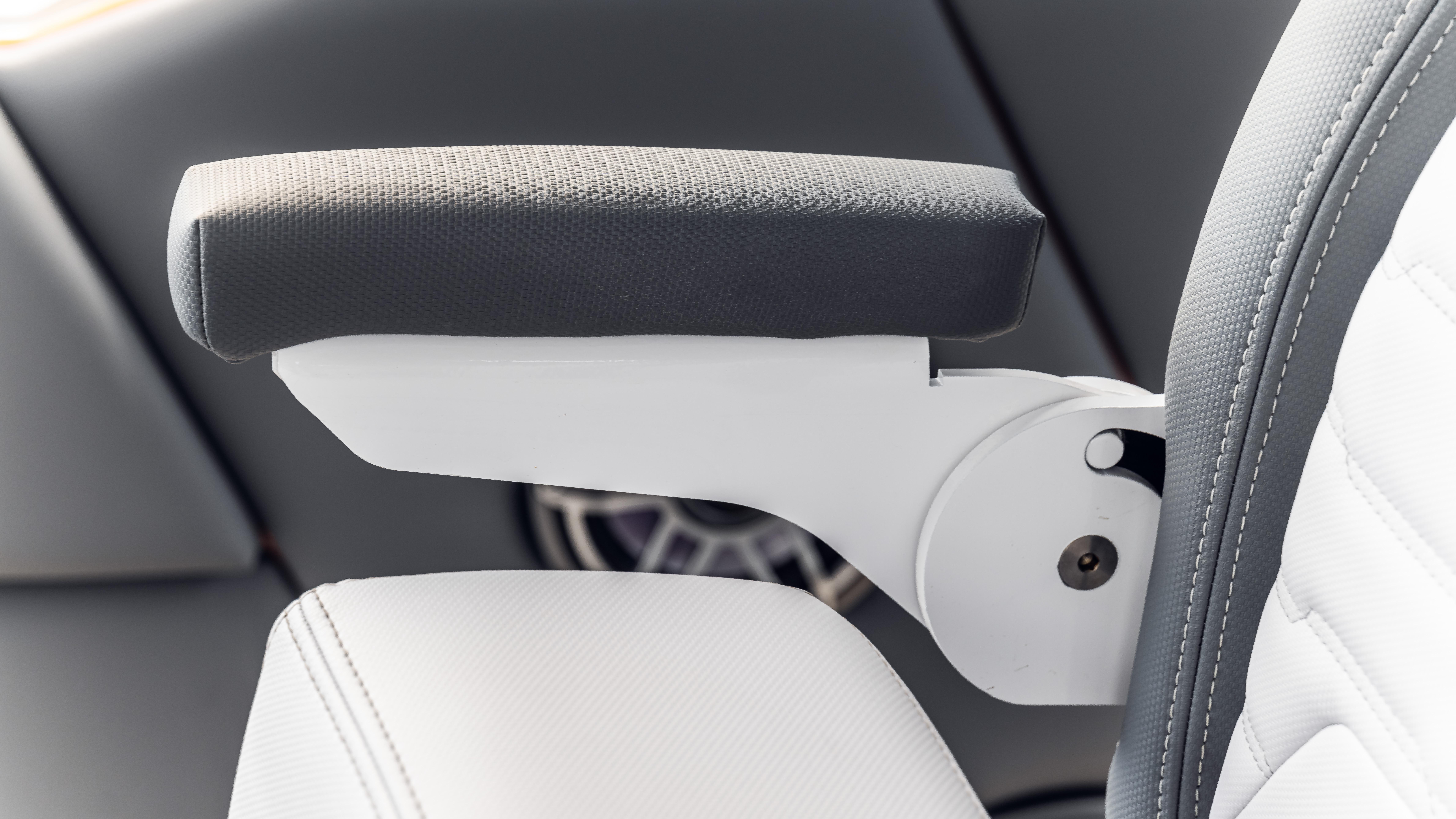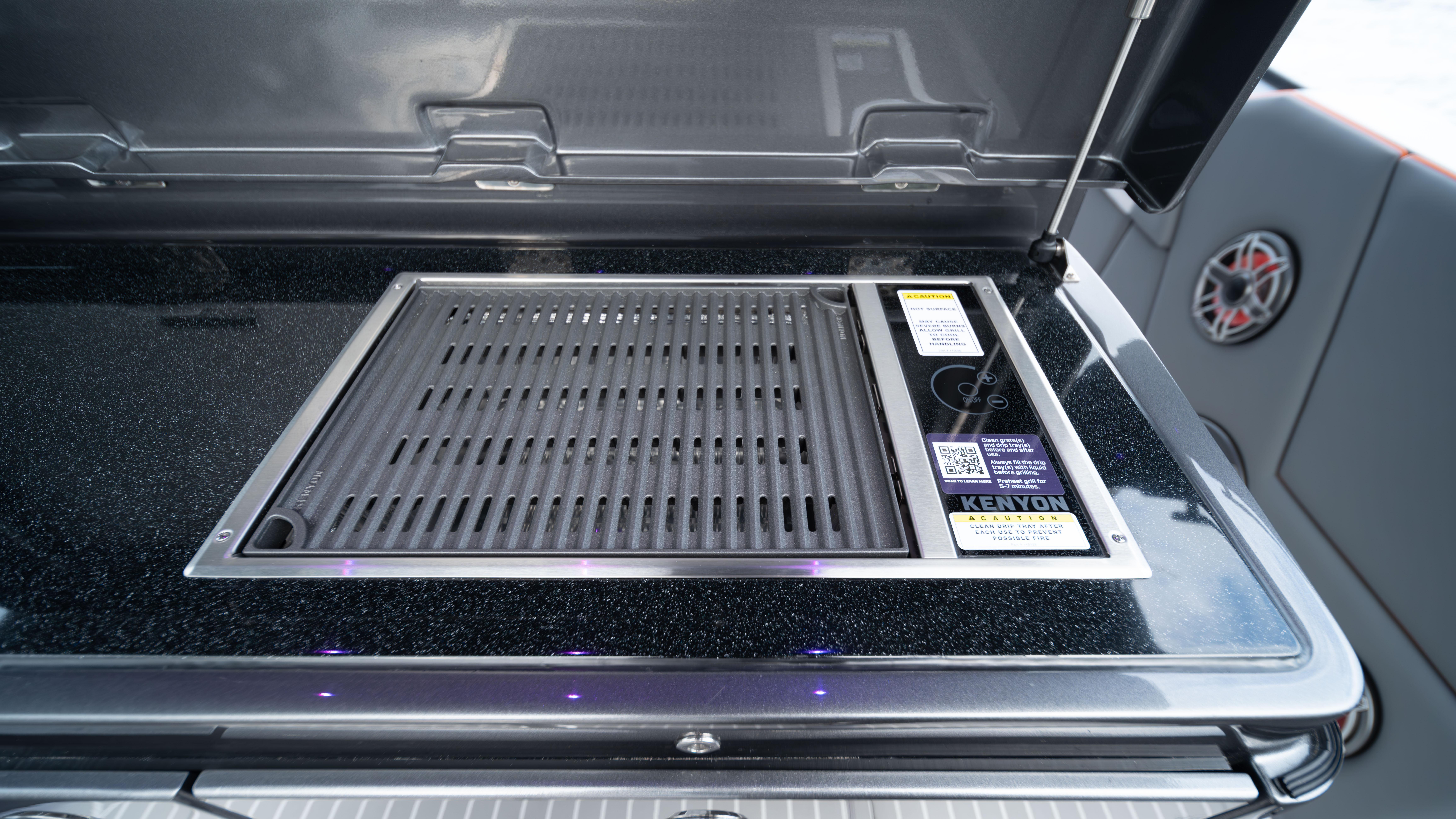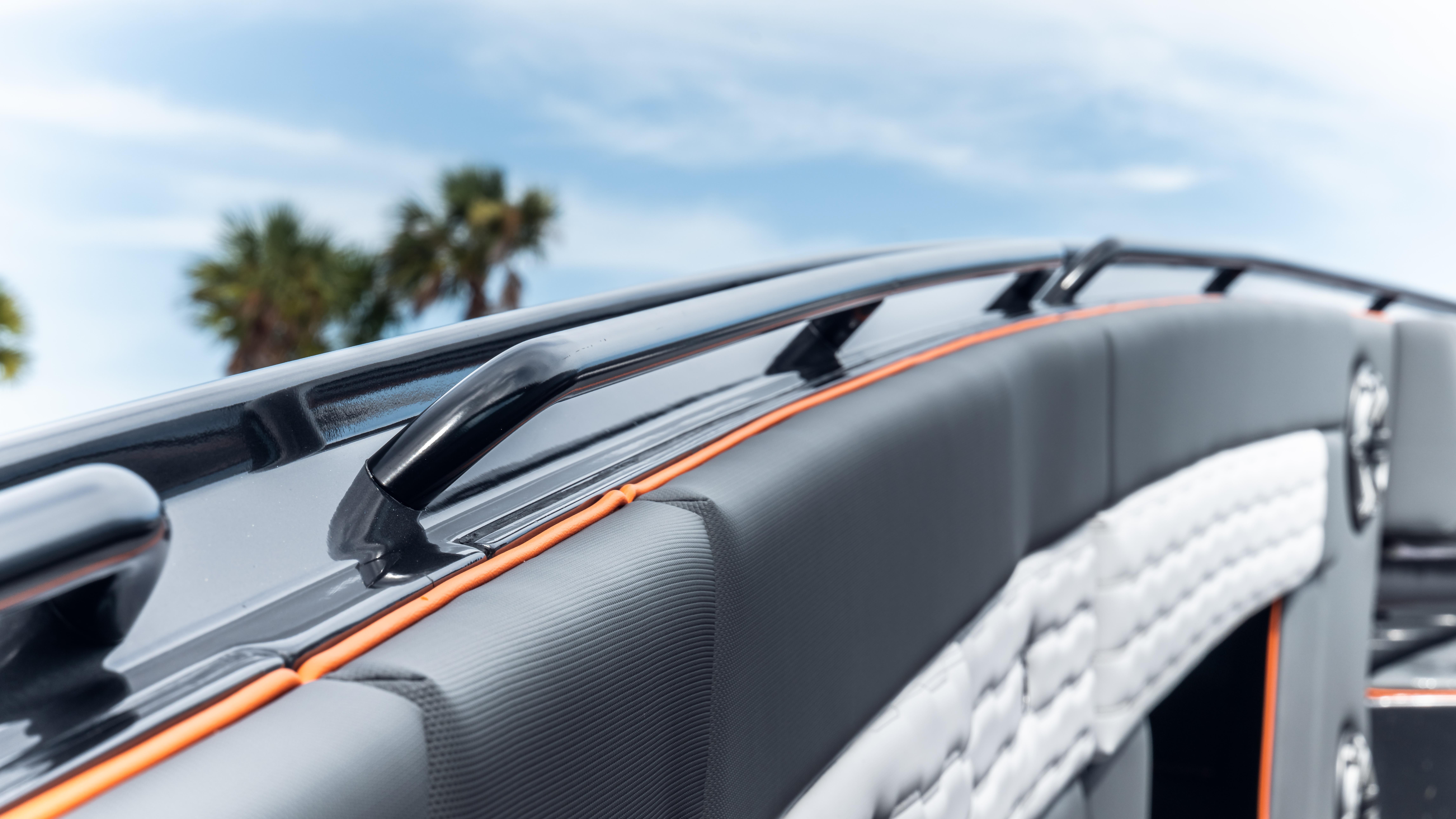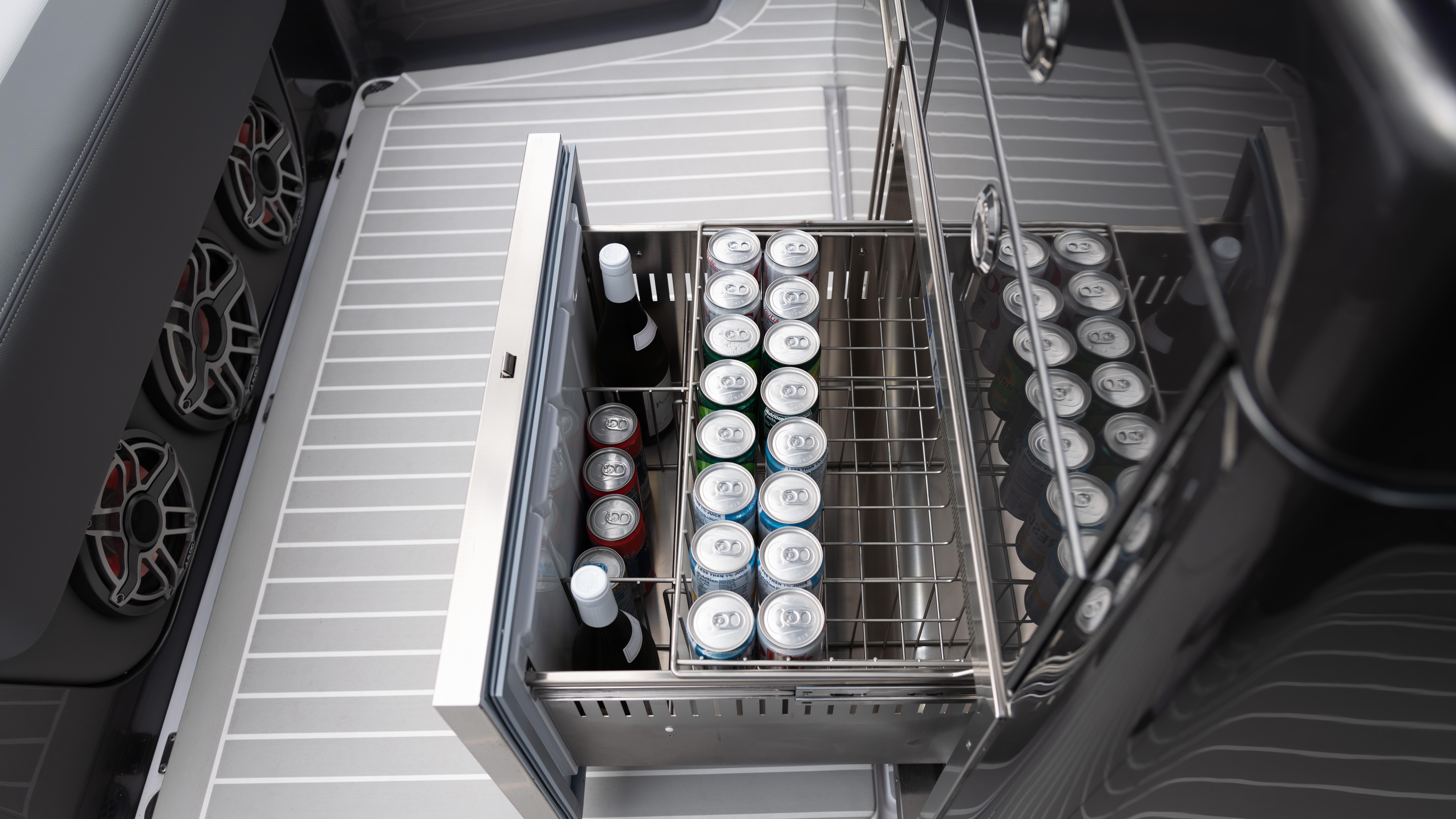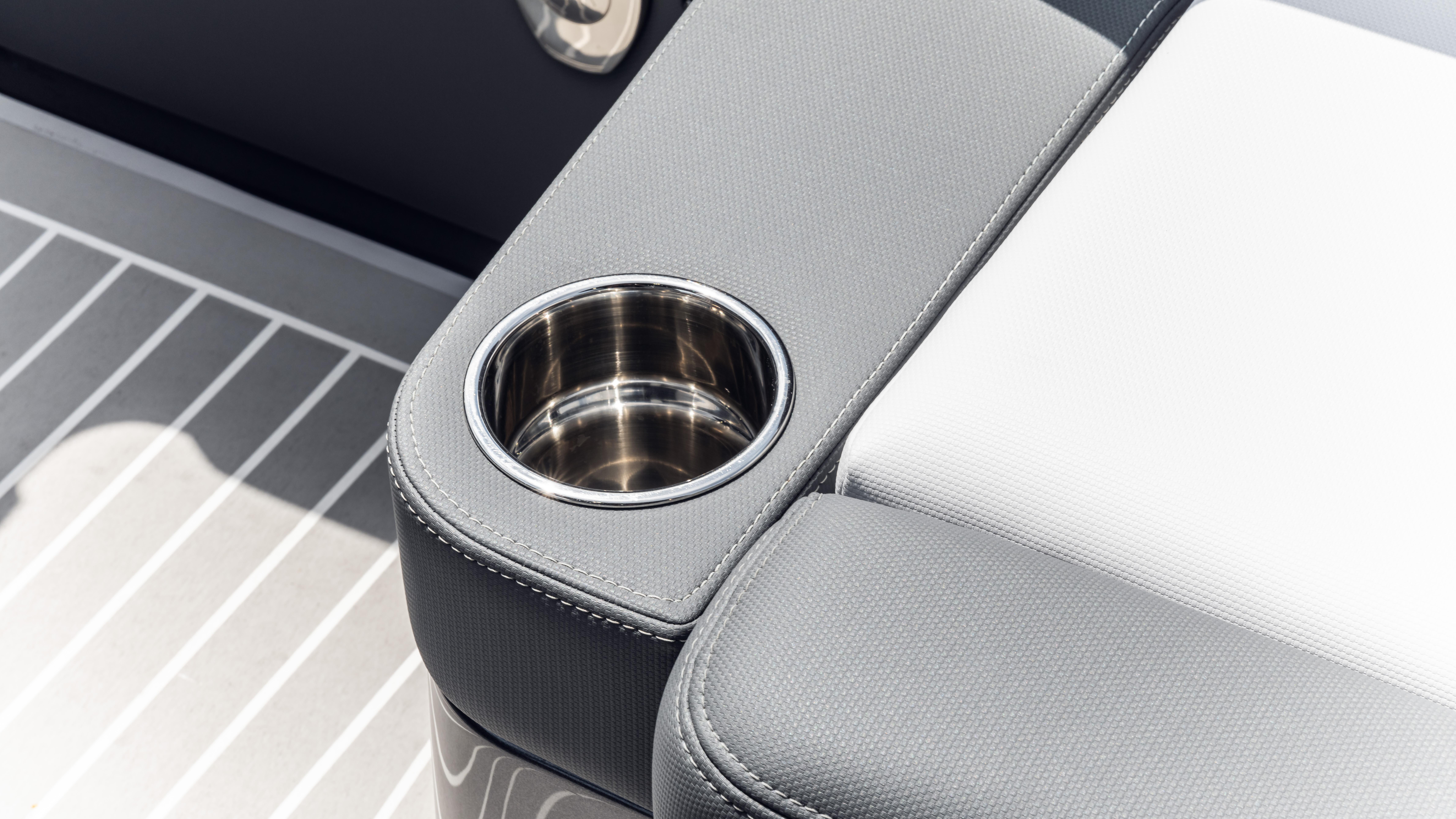 Helm DetailsThe helm features three Garmin 8617 chartplotters flush mounted to an instrument panel CNC cut from a solid block of aluminum. The nano-coated instrument panel face is resistant to heat, reflections and fingerprints, and the perimeter of the panel is lit by RGB LED accent lighting to provide a distinct glow, creating the illusion that the dash is floating. The helm integrates cup holders and two glove boxes. Passengers can feel secure with stainless steel grab bars, and be in total comfort with an ergonomic CNC machined footrest.