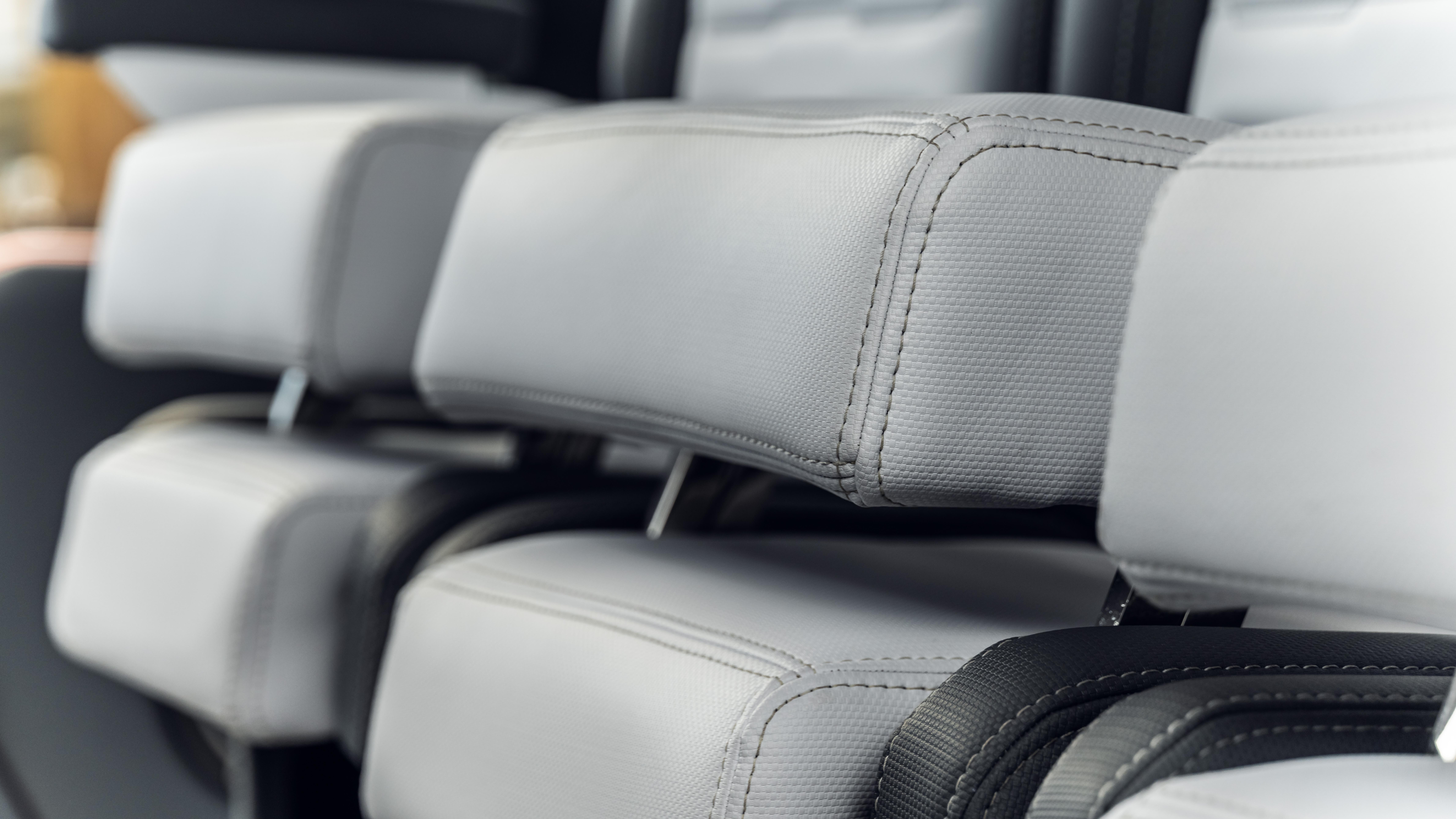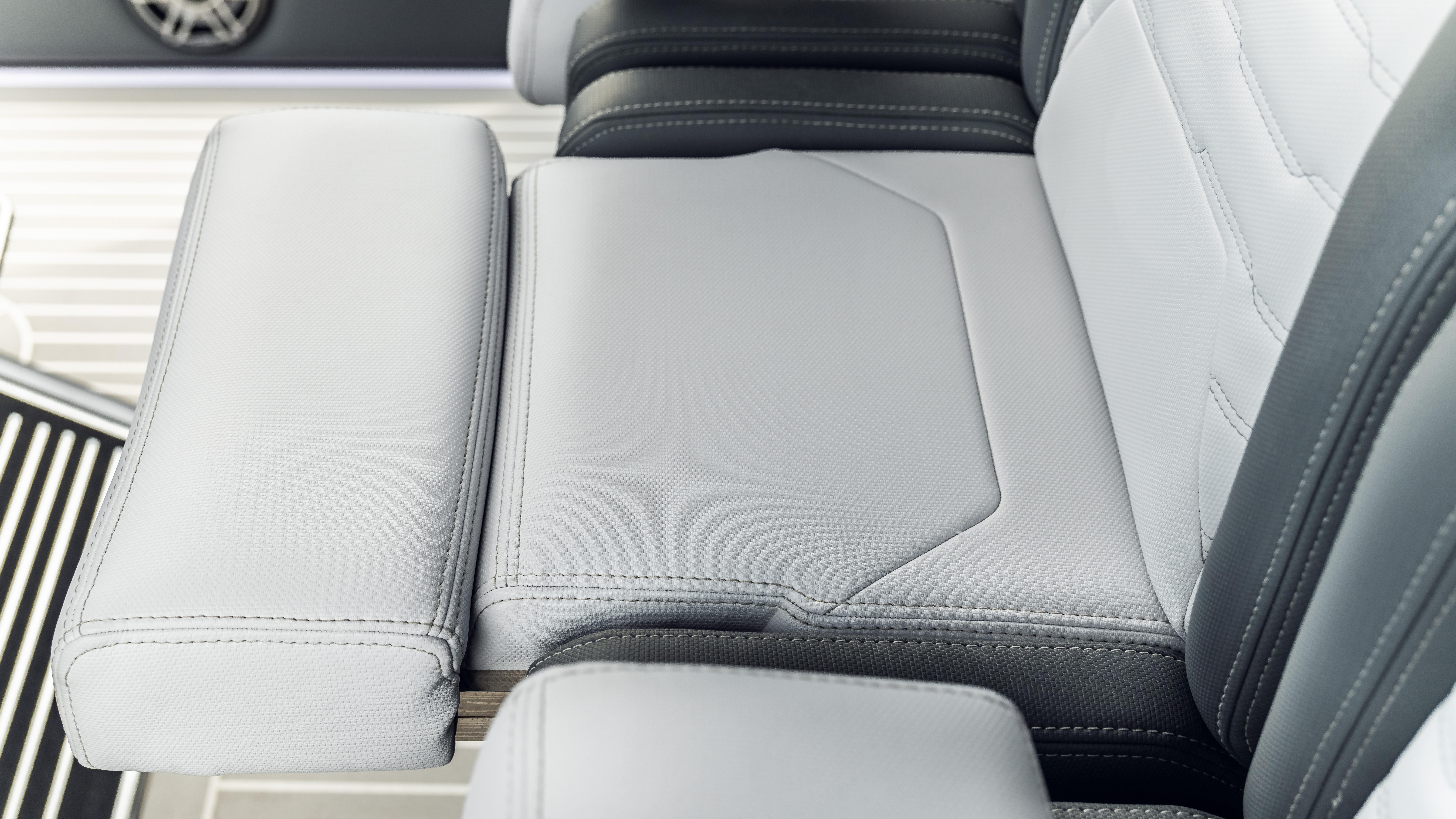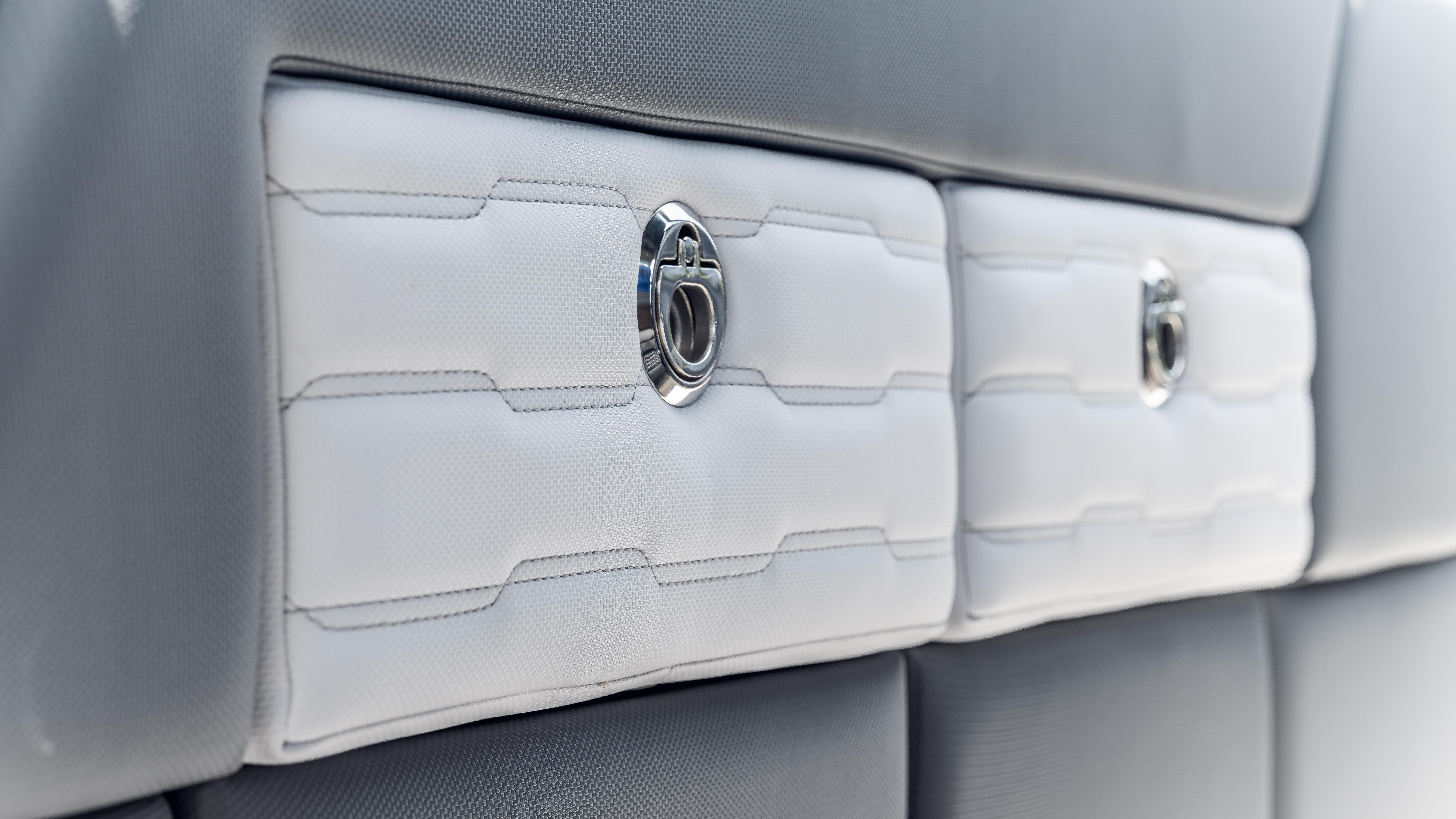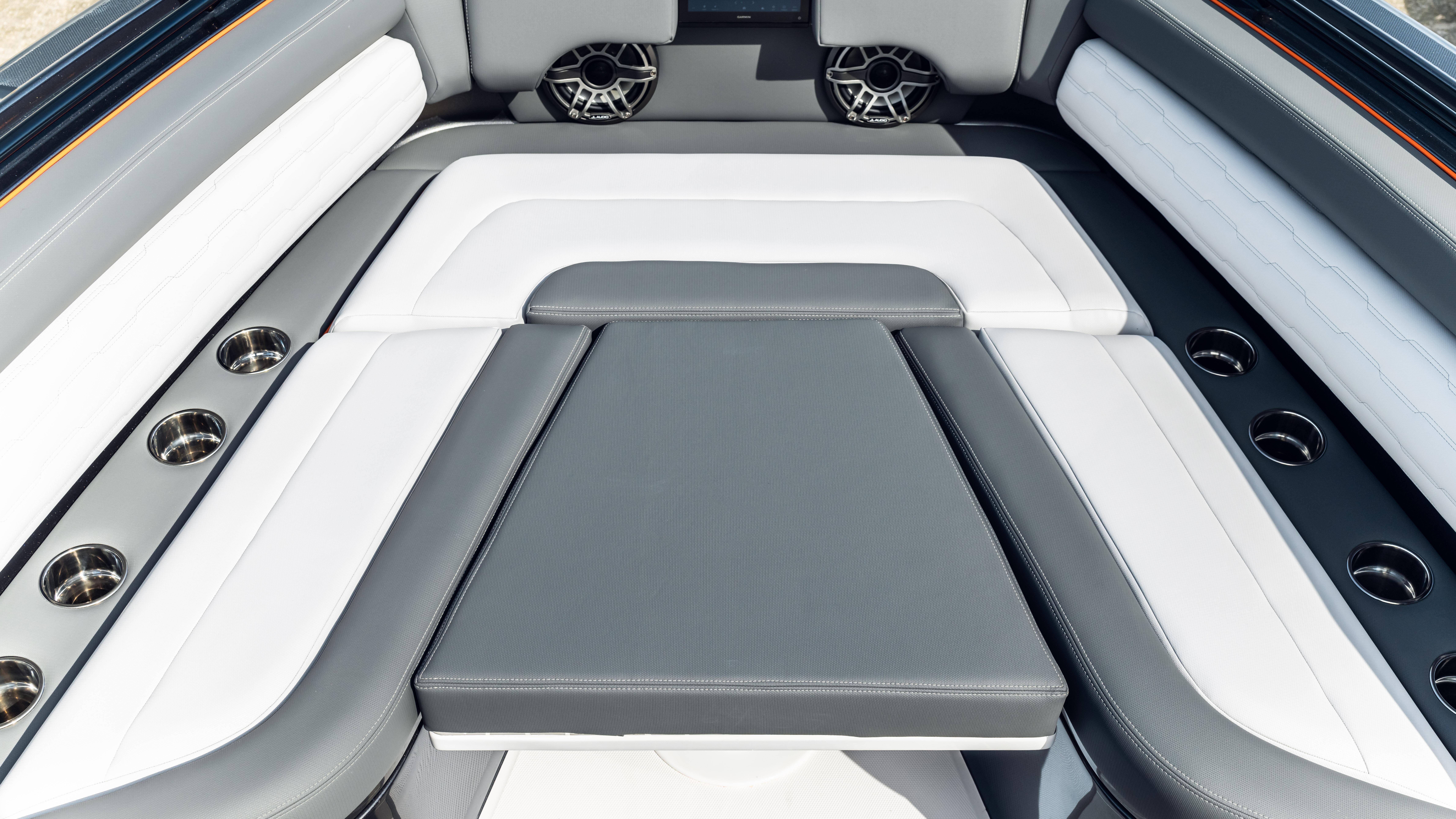 The ergonomic helm seating is constructed with multi-density foam for ultimate comfort. All of the three electric forward helm seats are independently adjustable, allowing comfort for numerous individuals. Additionally, the seat bottoms can be converted into bolsters.