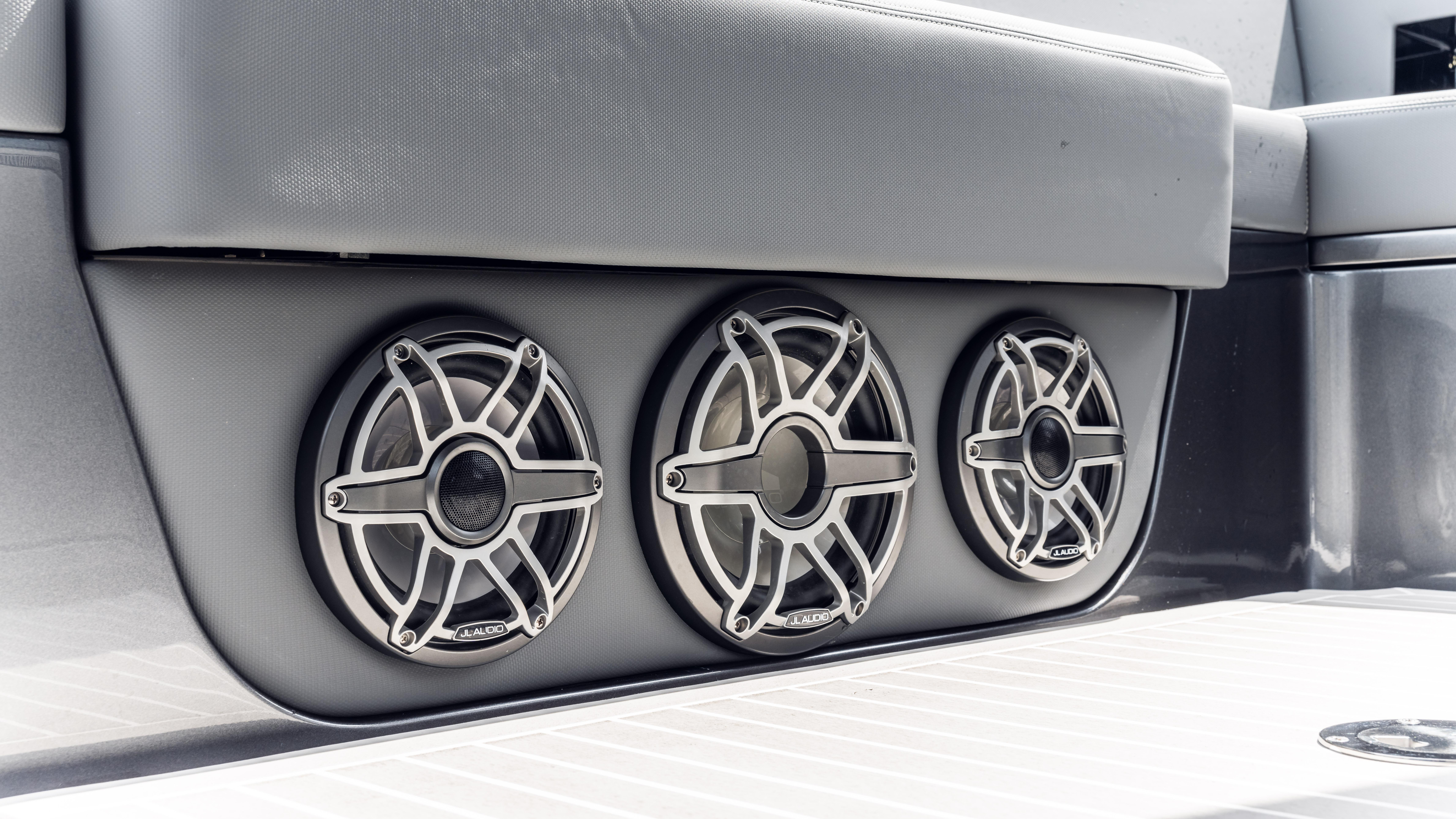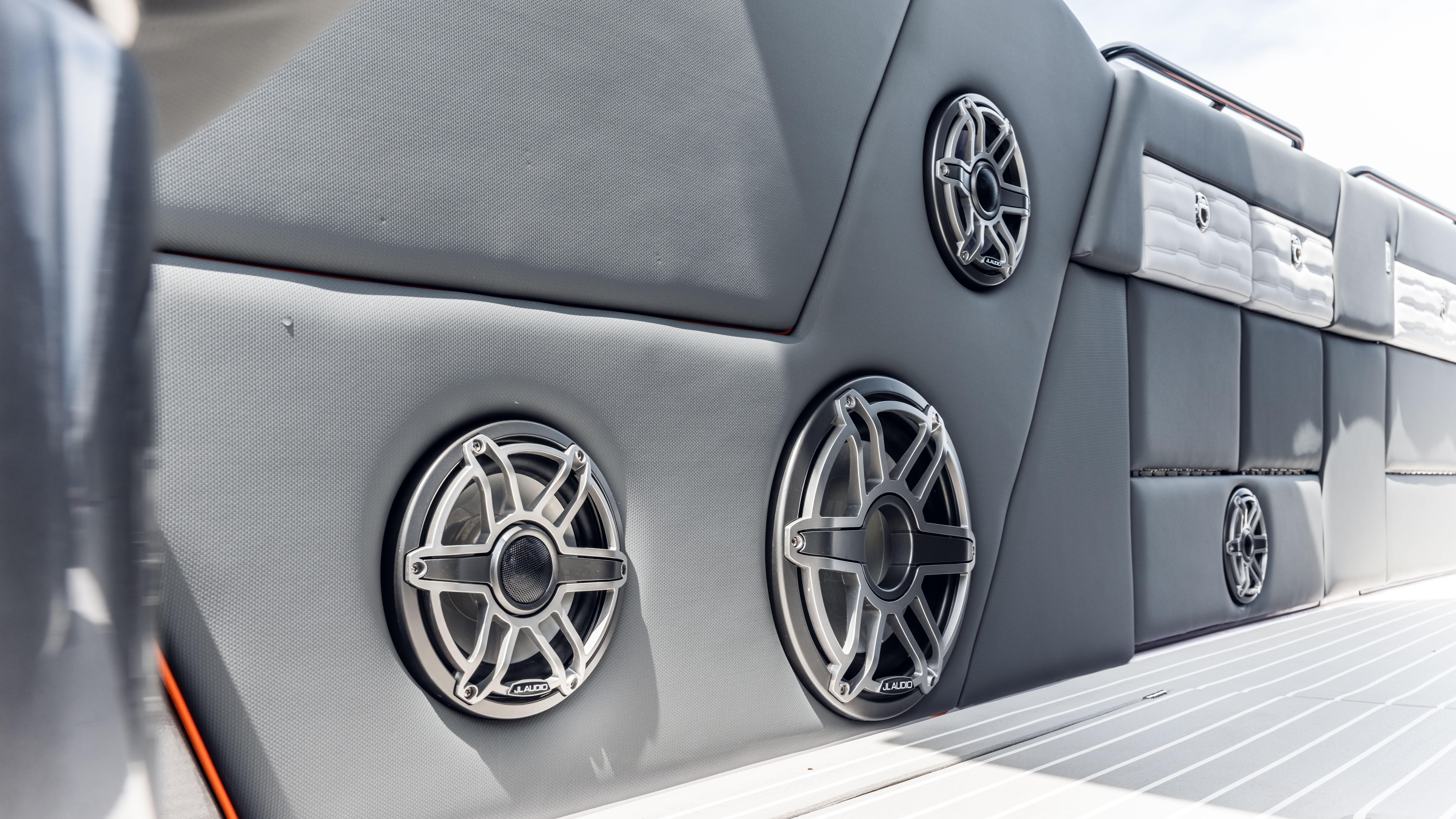 All RGB ambient lighting can be digitally controlled through the multifunctional Garmin displays. It powers LED lighting throughout the deck with infinite color variations. This technology extends seamlessly into an underwater RGB system to create the perfect ambiance for a night out on the water. Along with high powered LED down lights in the hardtop and red captain’s lighting.