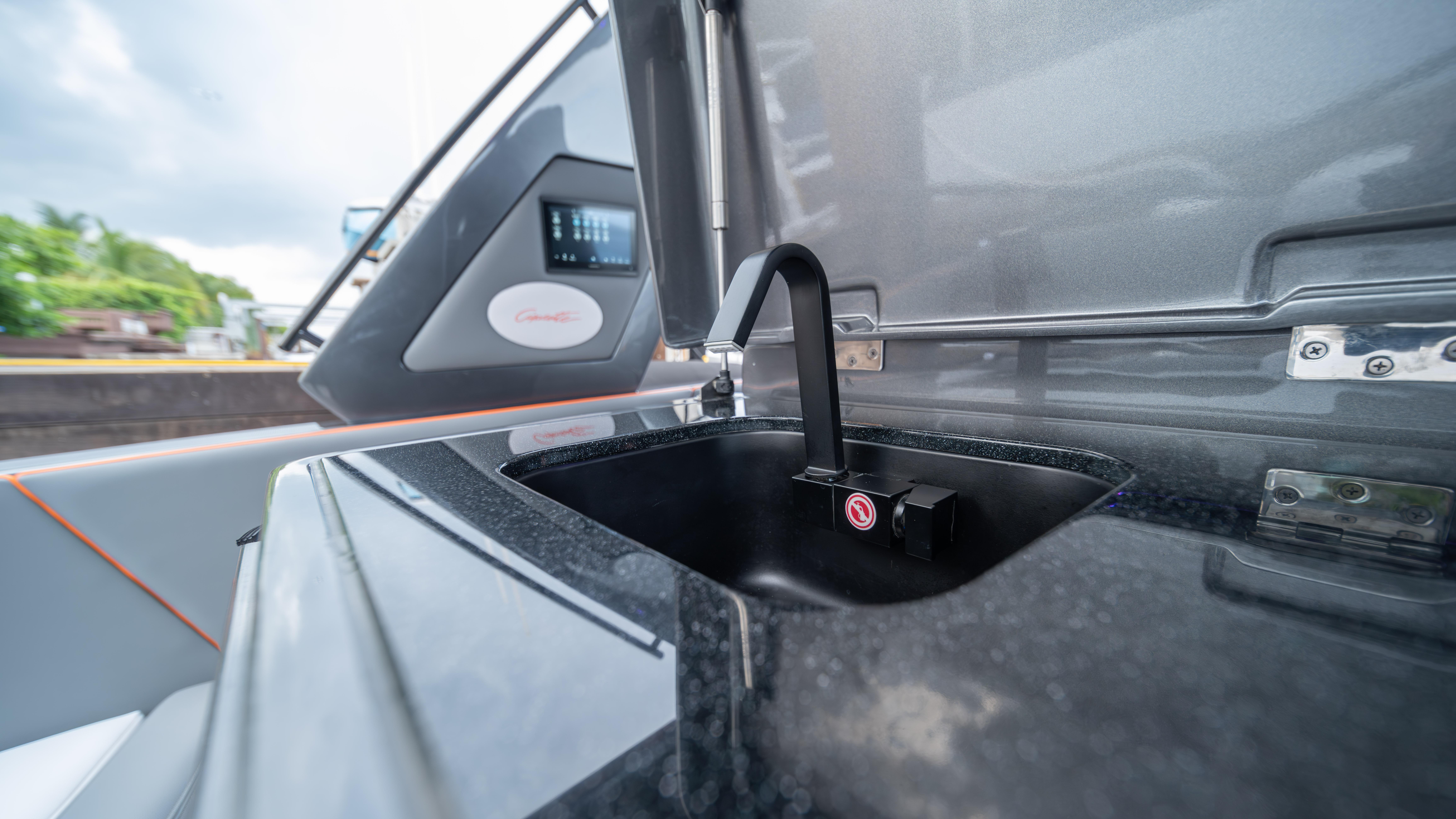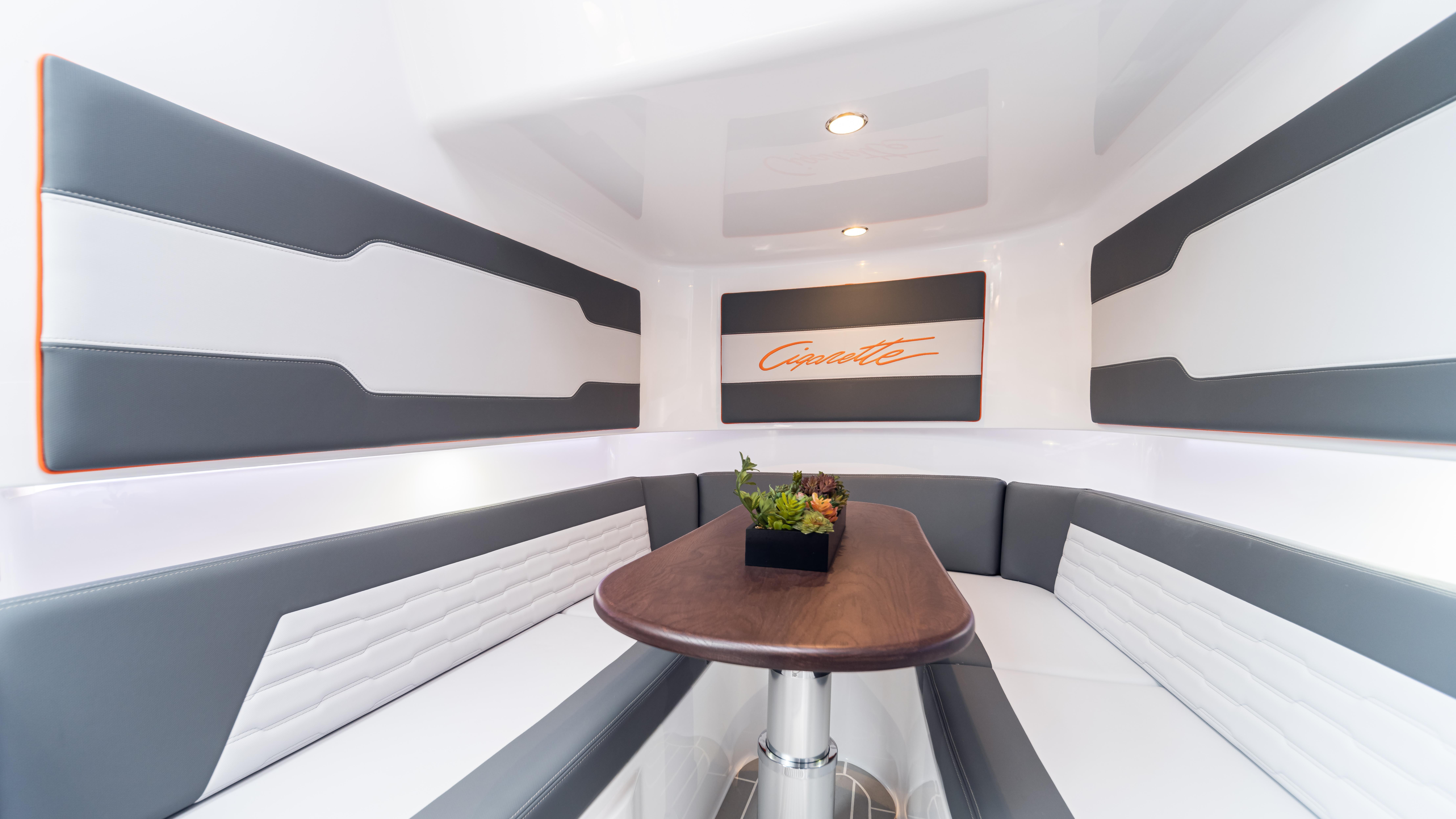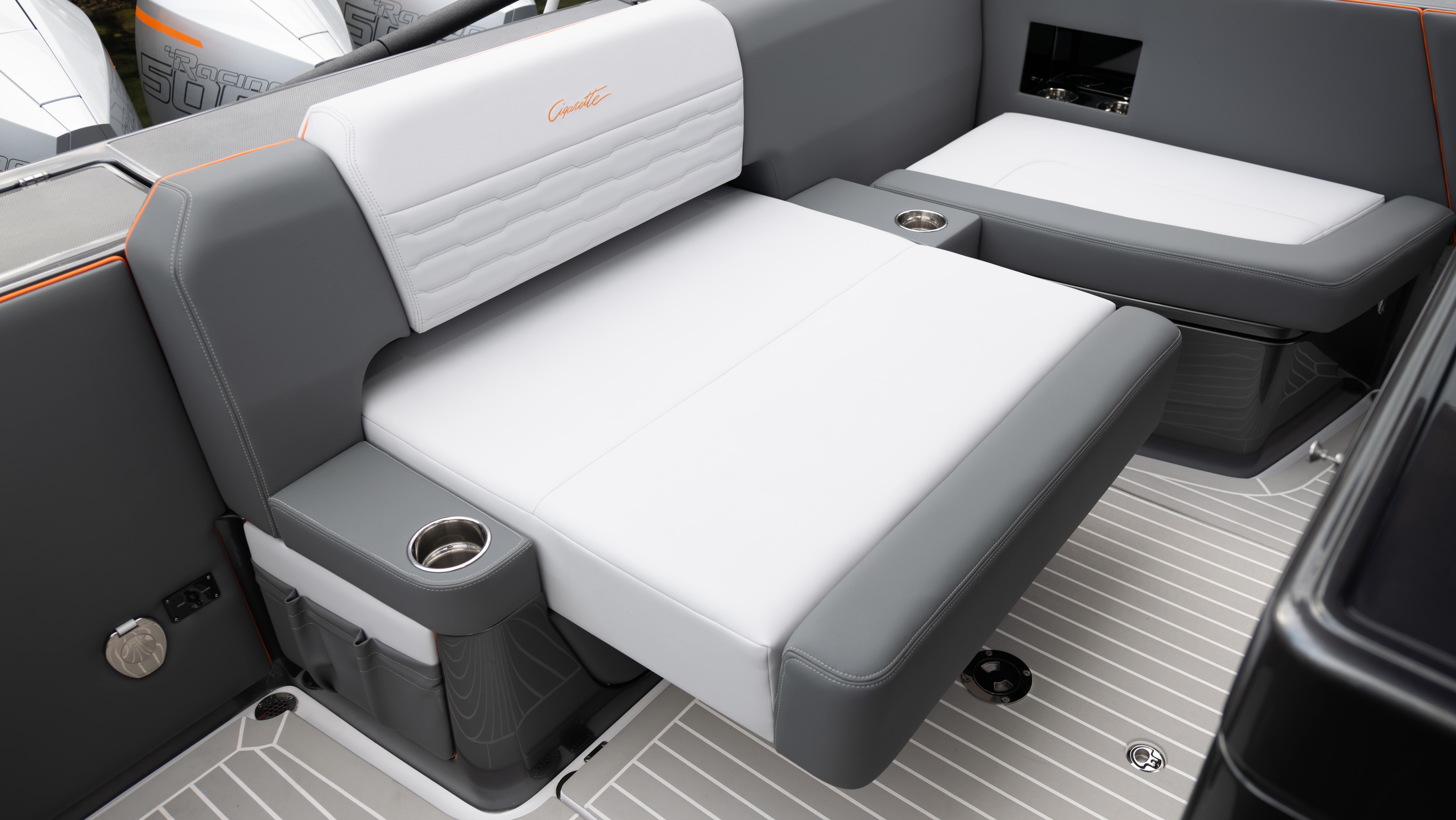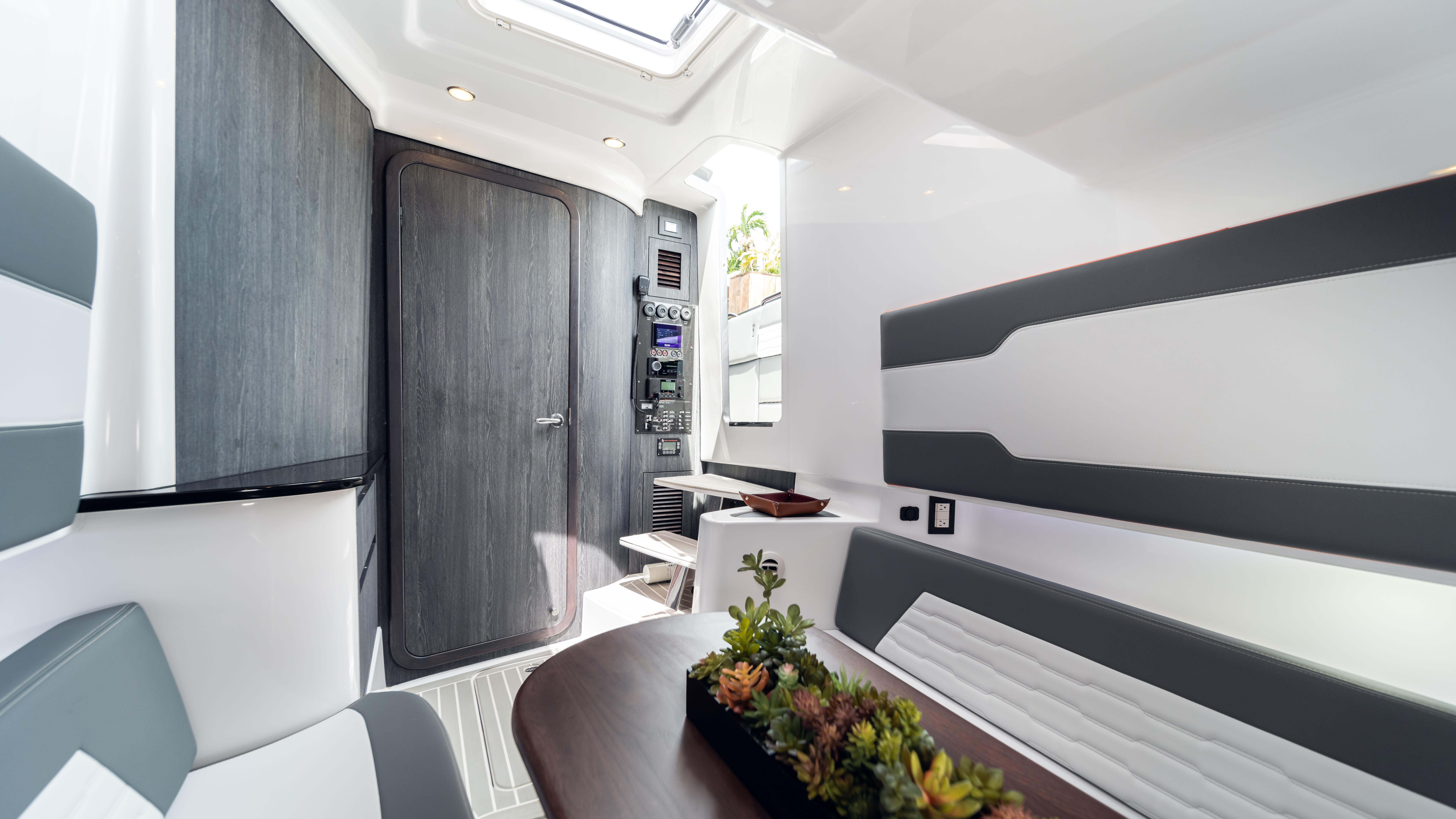 LayoutAll new upholstery introduces multi-layered foams coupled with highly detailed quilted patterns using Cigarette “Cool Touch” Fabric, a heat-resistant fabric that always feels comfortable. For convenience, the powered forward helm seats are independently adjustable and can quickly convert from standard seating to standing bolsters. Additionally, there are rear facing seats that electronically extend to form an oversized sun lounge for ultimate comfort and style. Below, the Auroris features a spacious cabin with an enclosed head, and an U-shape seating and table that can be converted into a day bed.