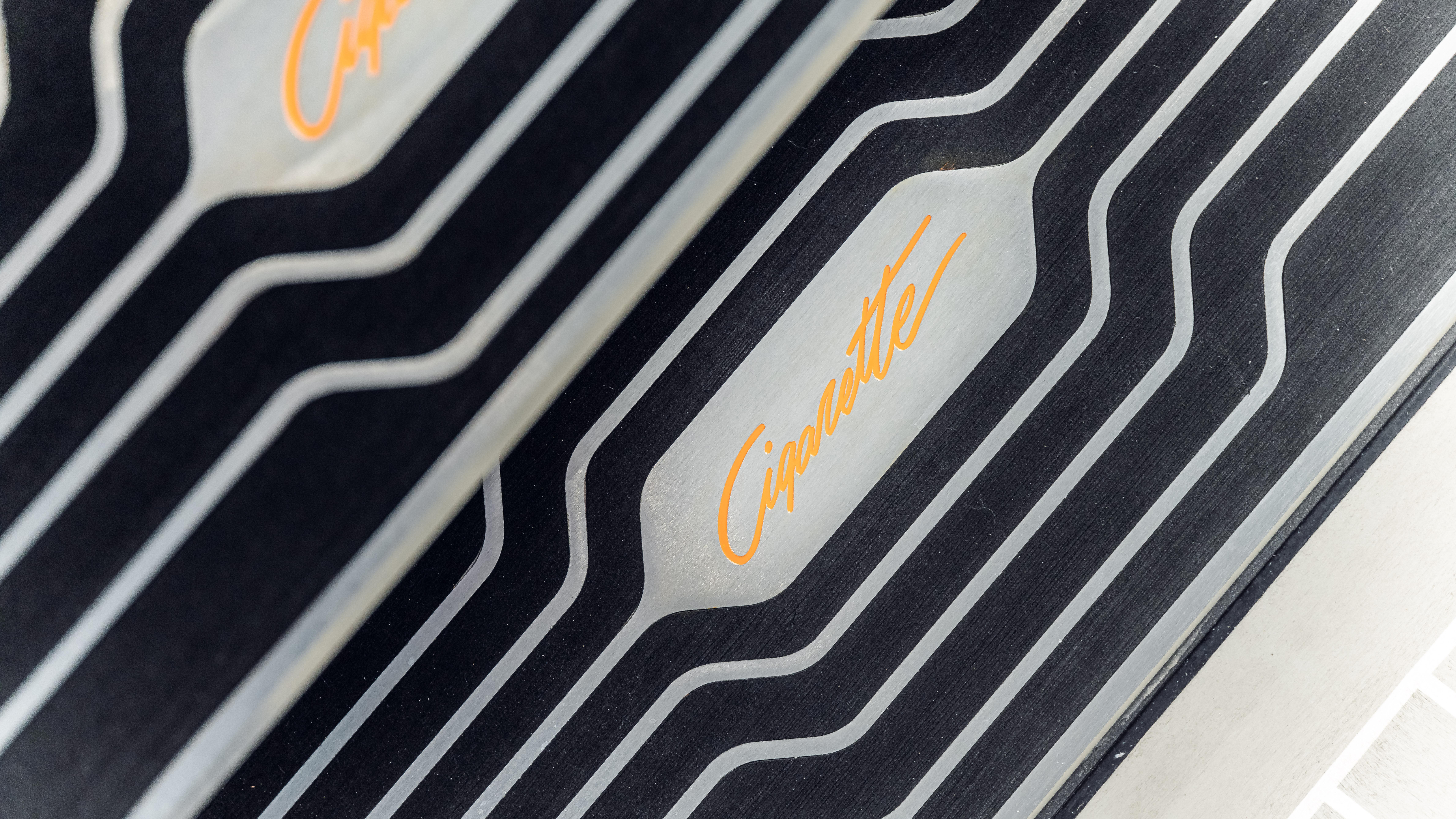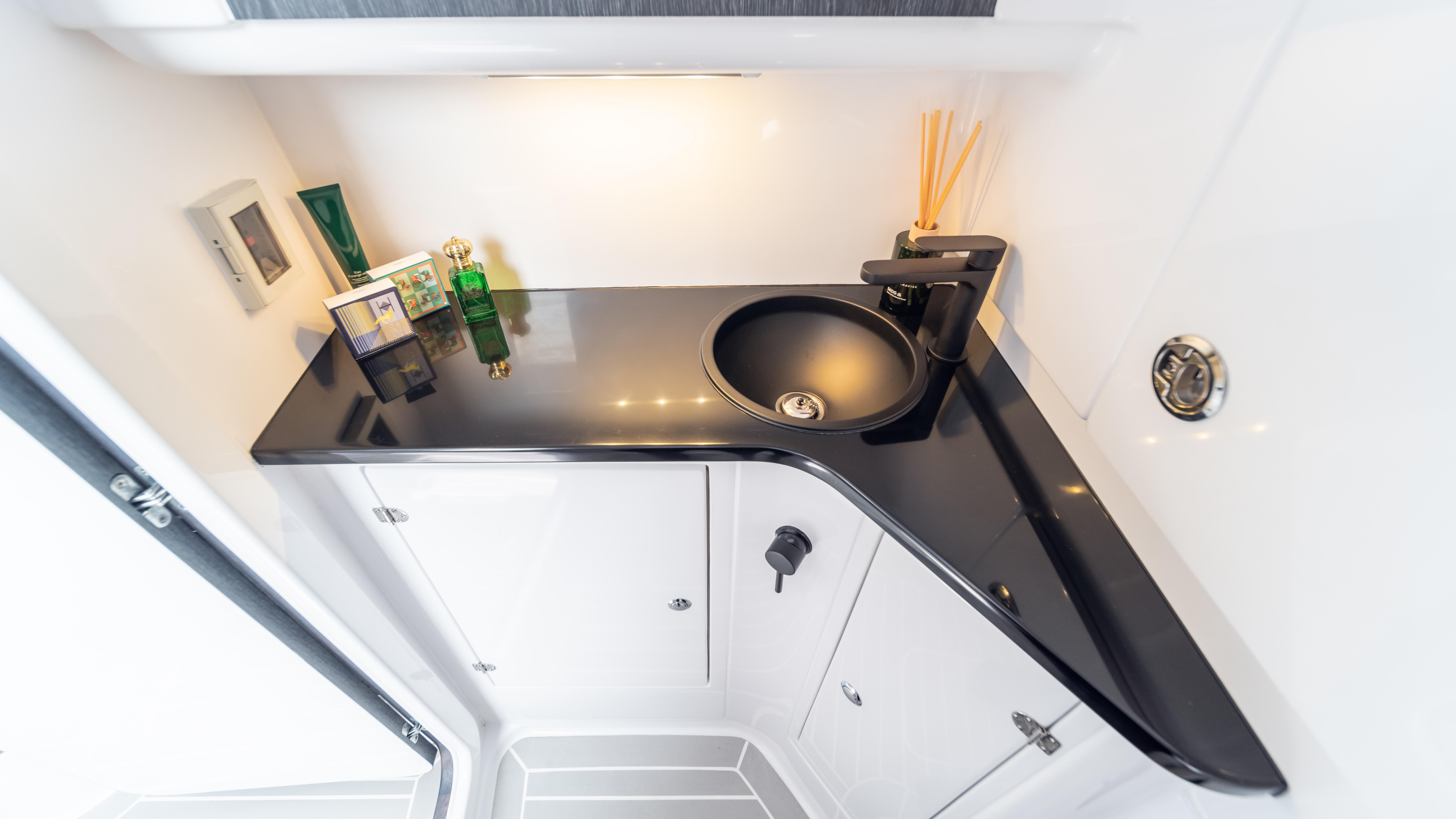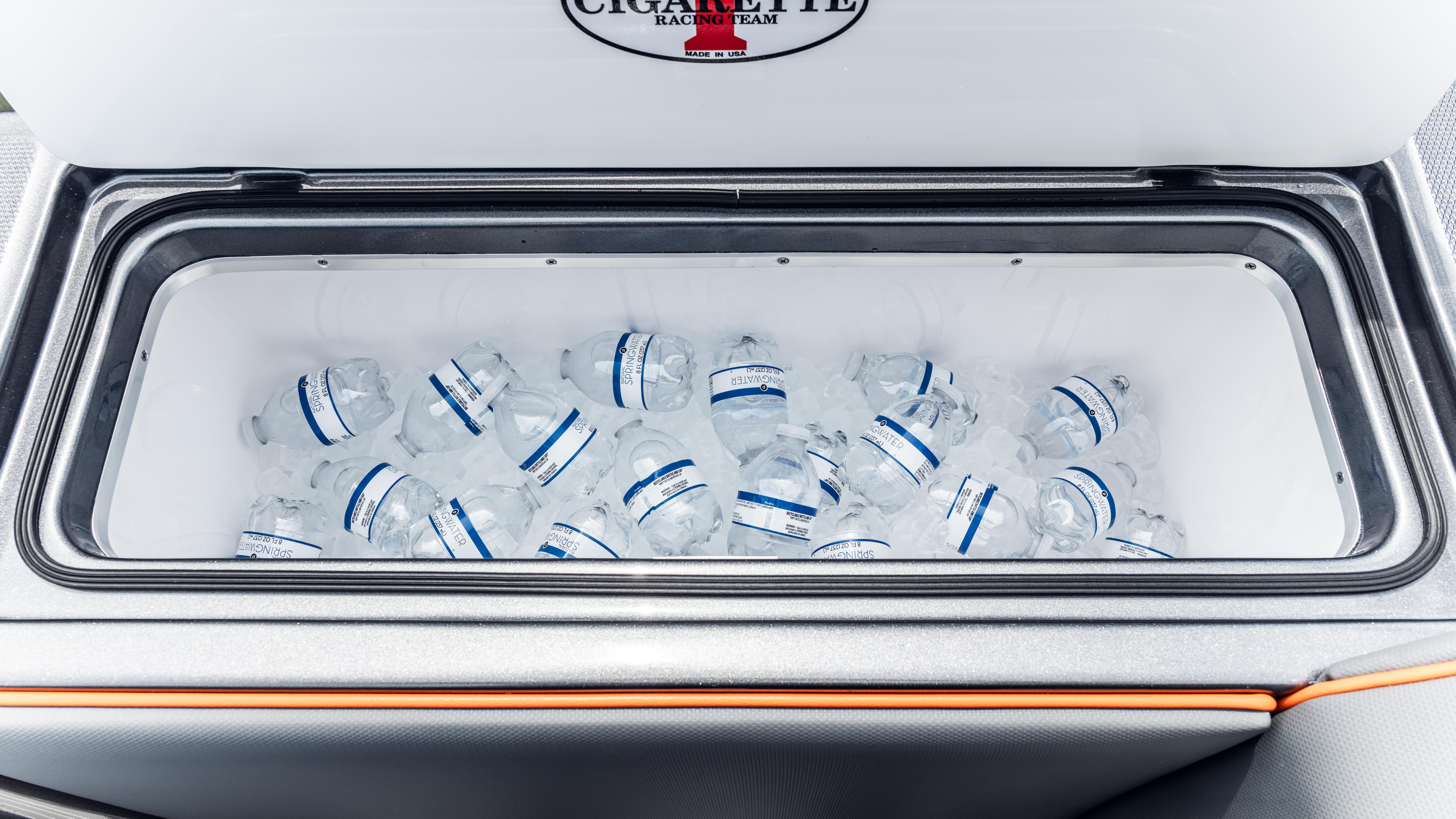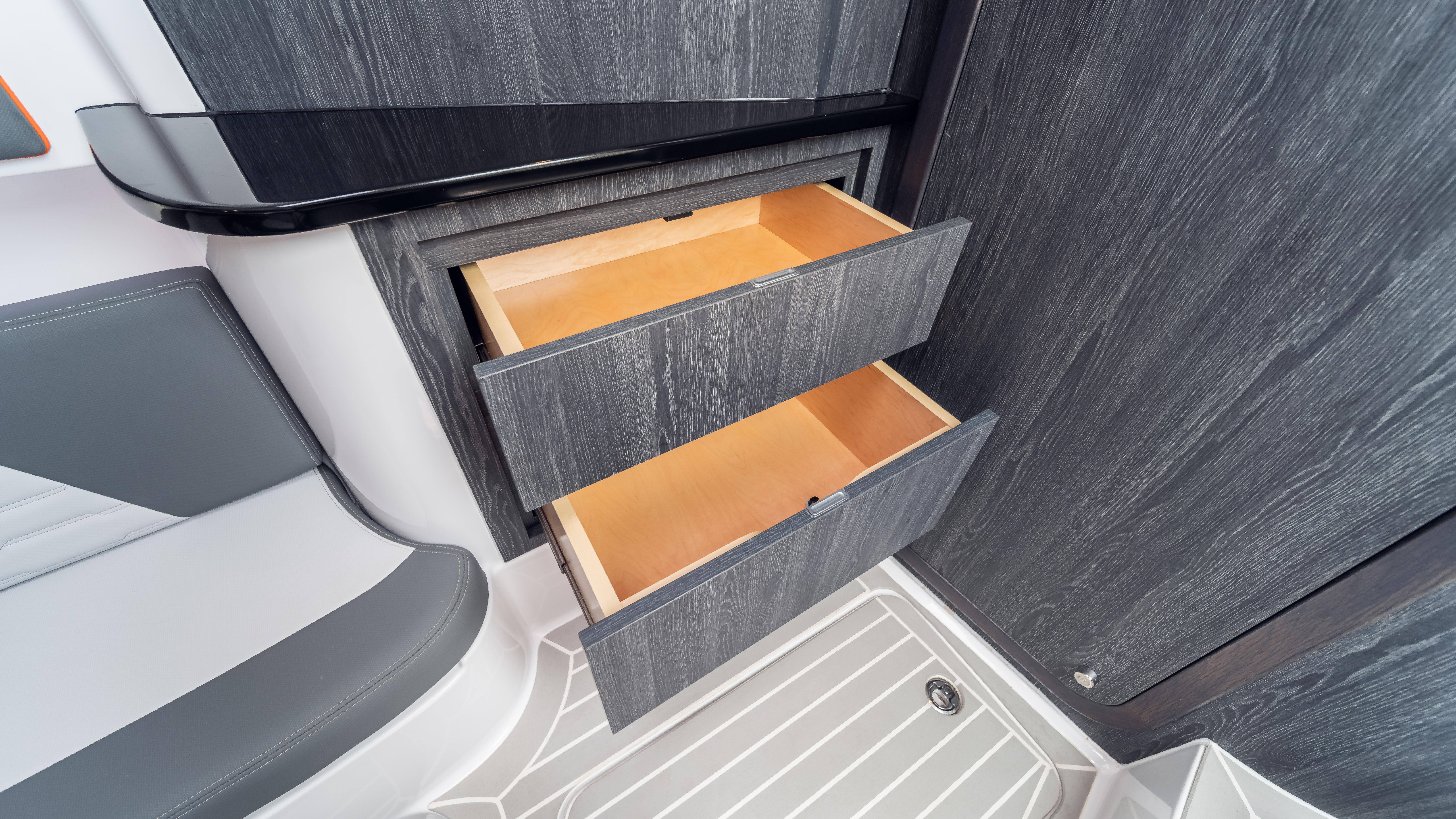 LayoutAll new upholstery introduces multi-layered foams coupled with highly detailed quilted patterns using Cigarette “Cool Touch” Fabric, a heat-resistant fabric that always feels comfortable. For convenience, the powered forward helm seats are independently adjustable and can quickly convert from standard seating to standing bolsters. Additionally, there are rear facing seats that electronically extend to form an oversized sun lounge for ultimate comfort and style. Below, the Auroris features a spacious cabin with an enclosed head, and an U-shape seating and table that can be converted into a day bed.