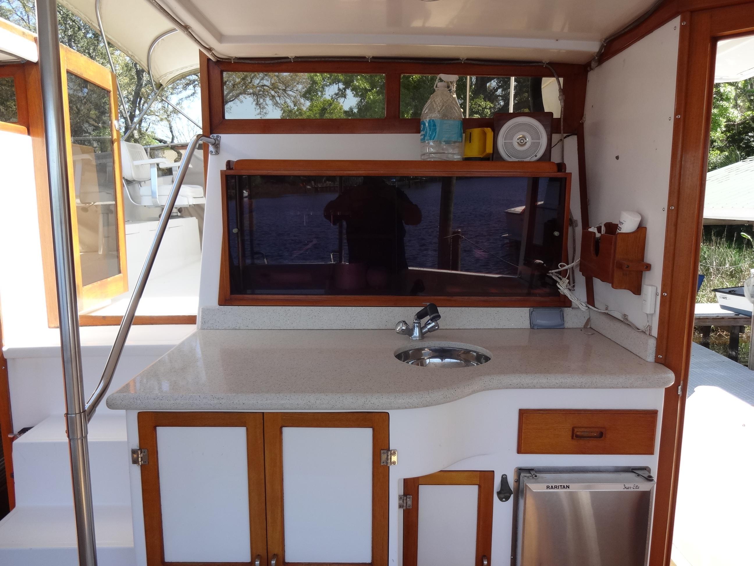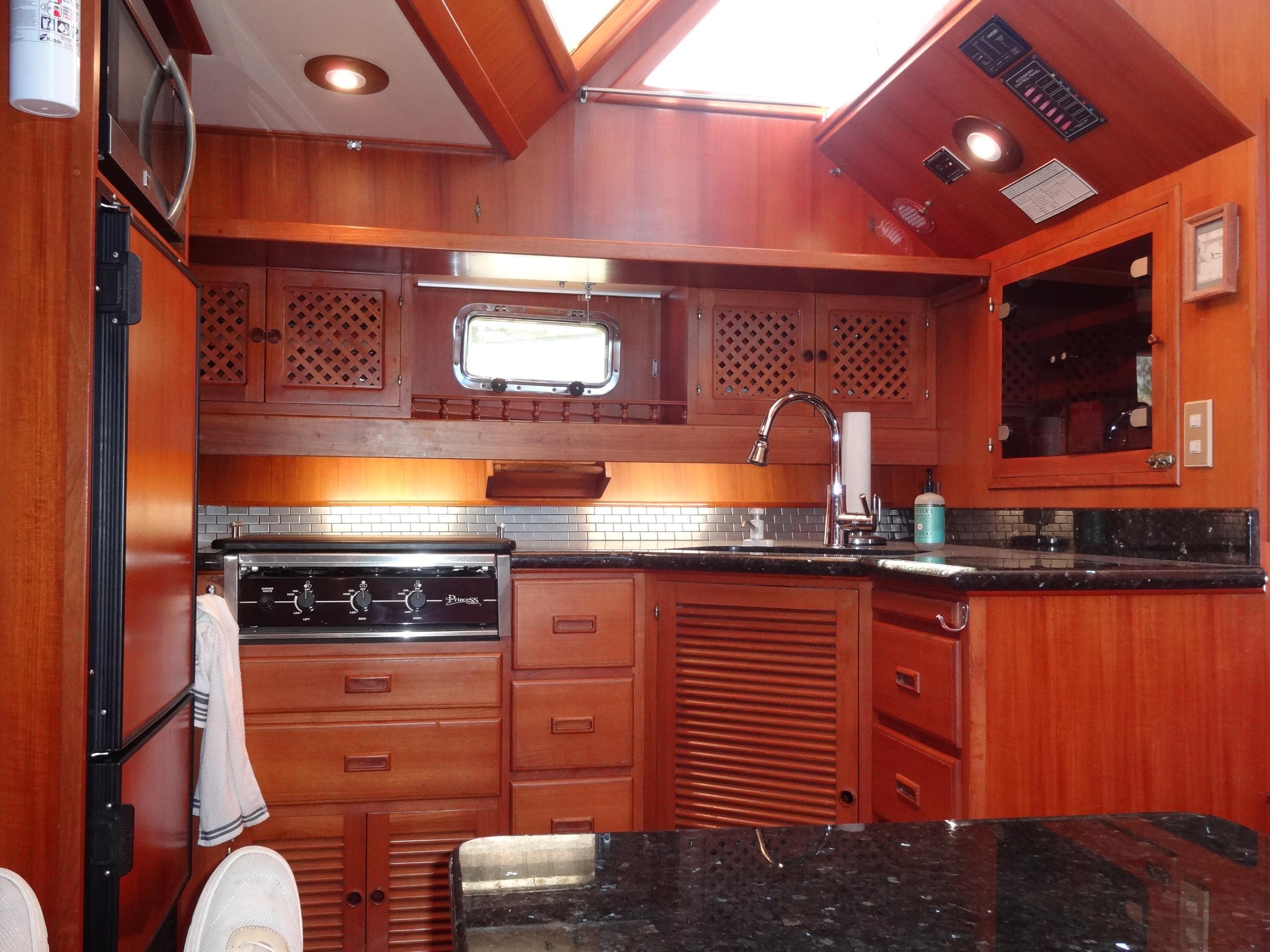 The salon of Bubbles Up is an inviting space featuring a lower helm station, an L-shaped couch, and ample storage cabinets along the lower walls. Above the counter area, there is a large LCD TV for entertainment while overlooking the dinette below. Adding to its charm is a magnificent built-in bar that showcases the vessel's exquisite woodwork and beauty, which can be admired from every corner.Galley