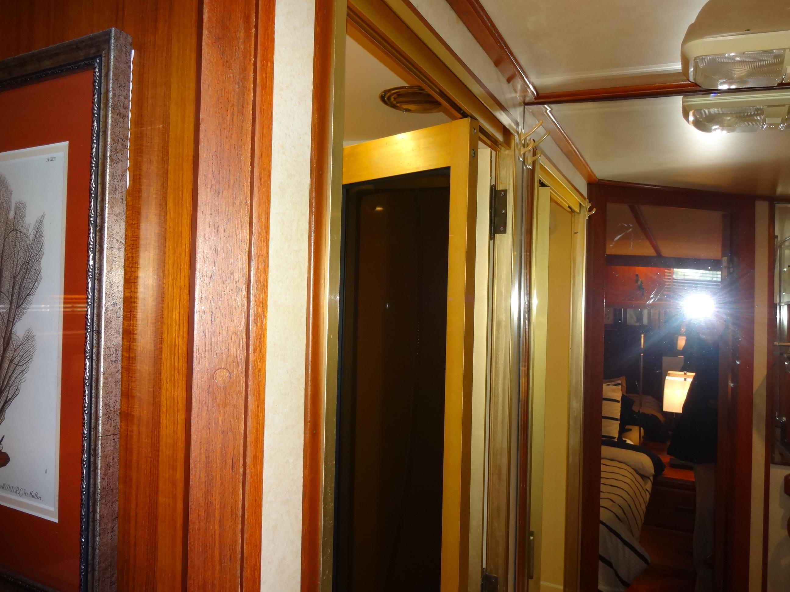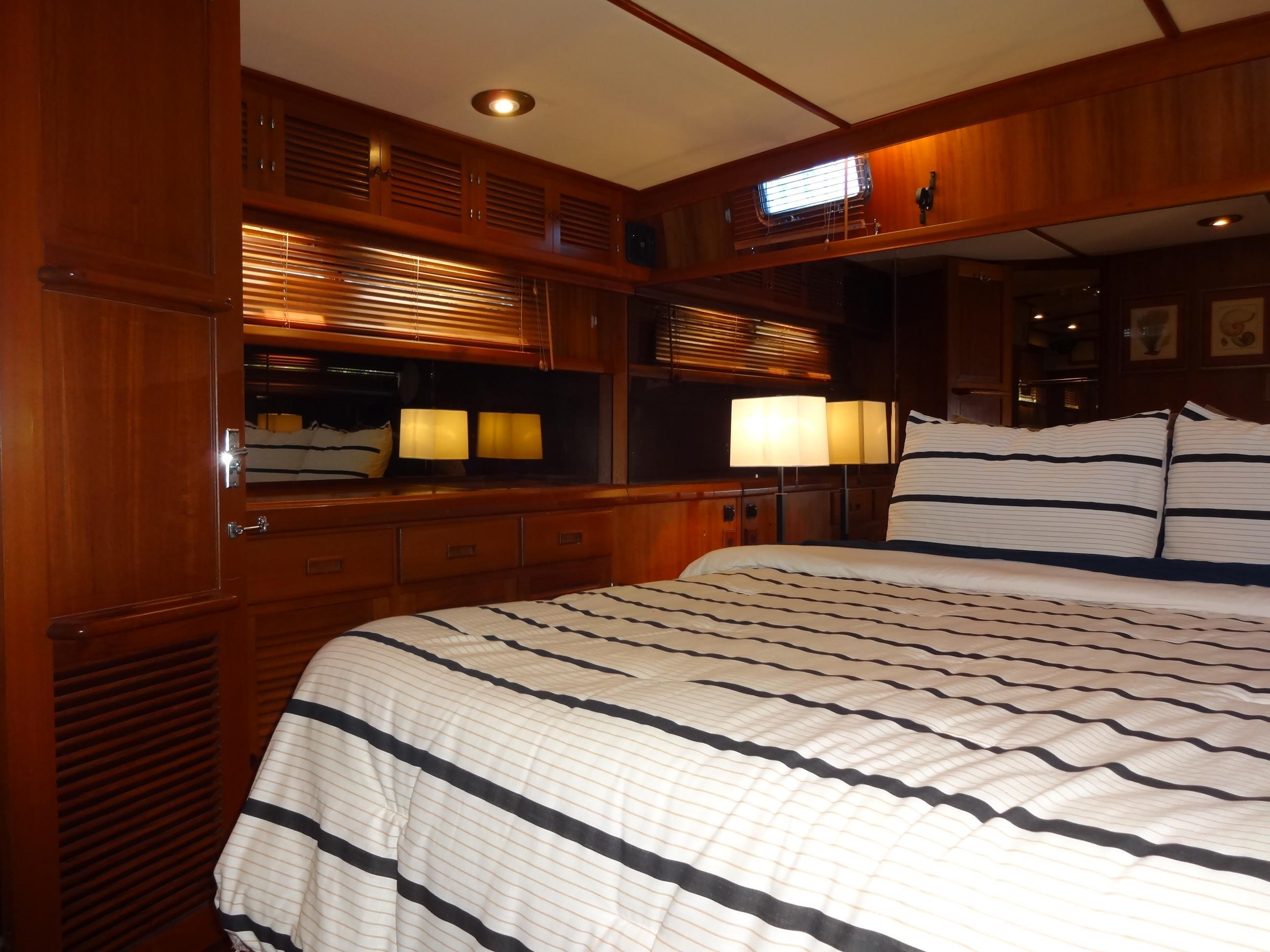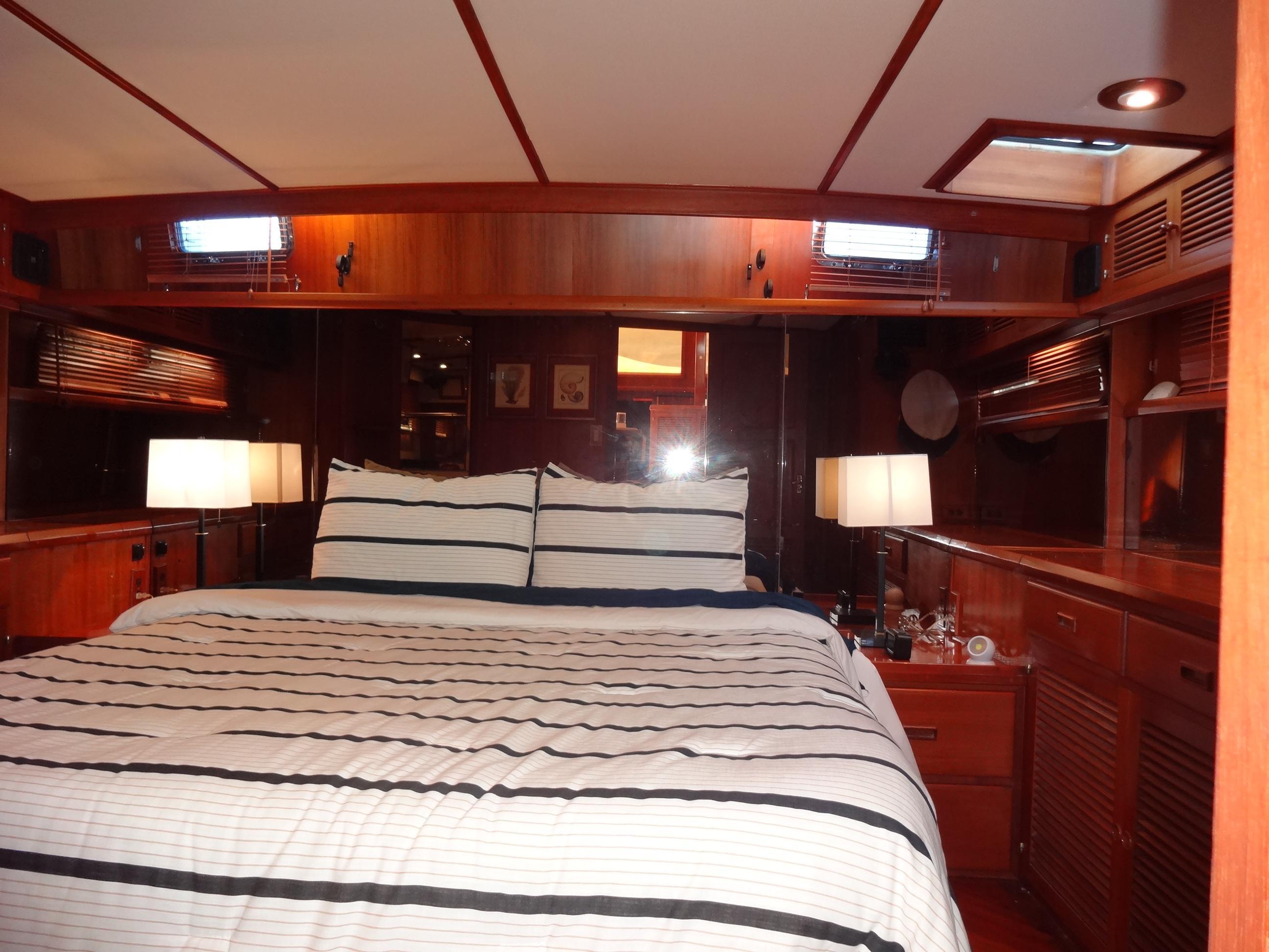 The salon welcomes you with a lower helm station, a cozy couch, and plentiful storage cabinets, creating an inviting atmosphere for relaxation and entertainment. Notably, the salon boasts a magnificent built-in bar, showcasing the exquisite woodwork and beauty that permeate every corner of this vessel.Accommodations