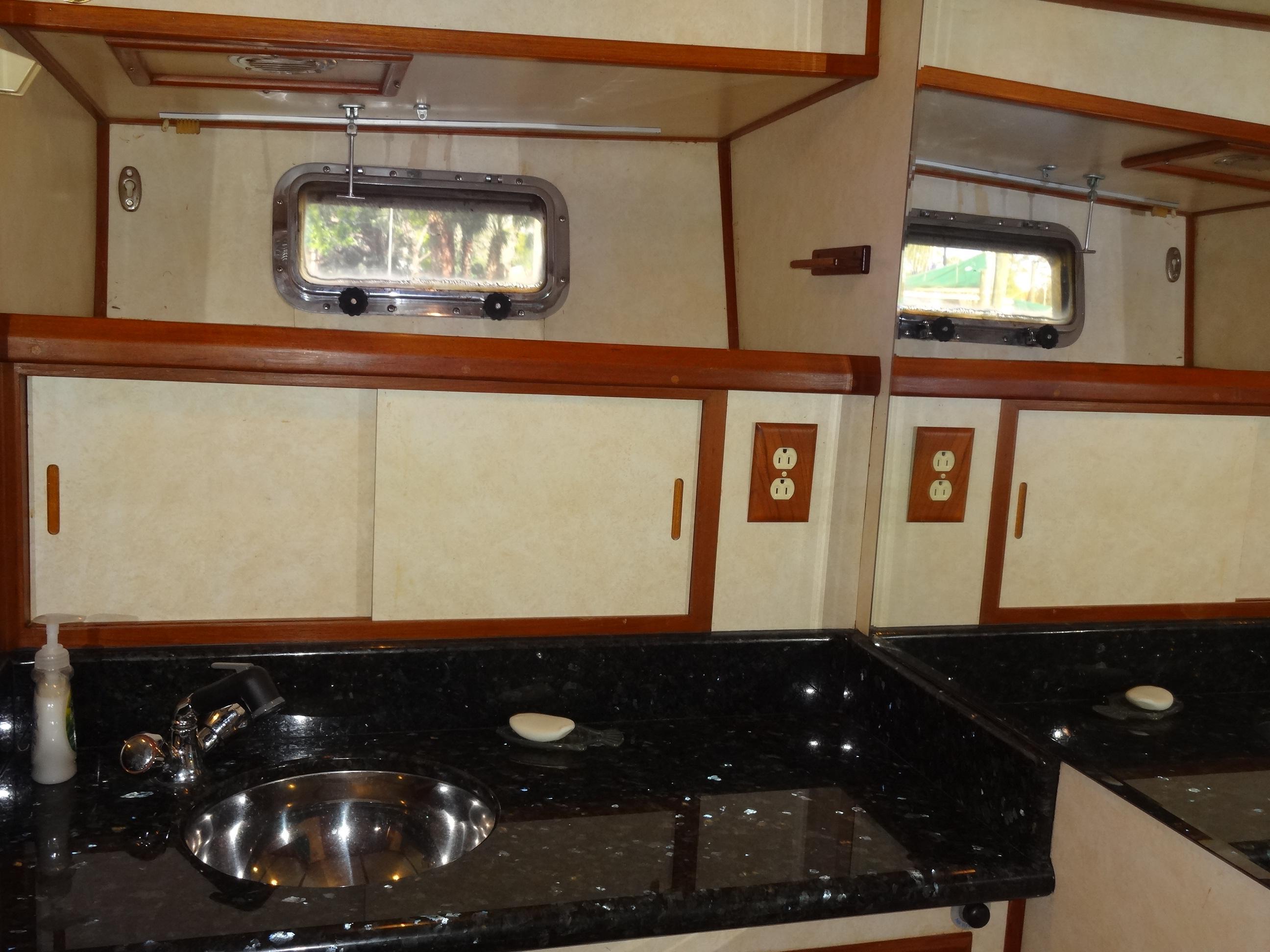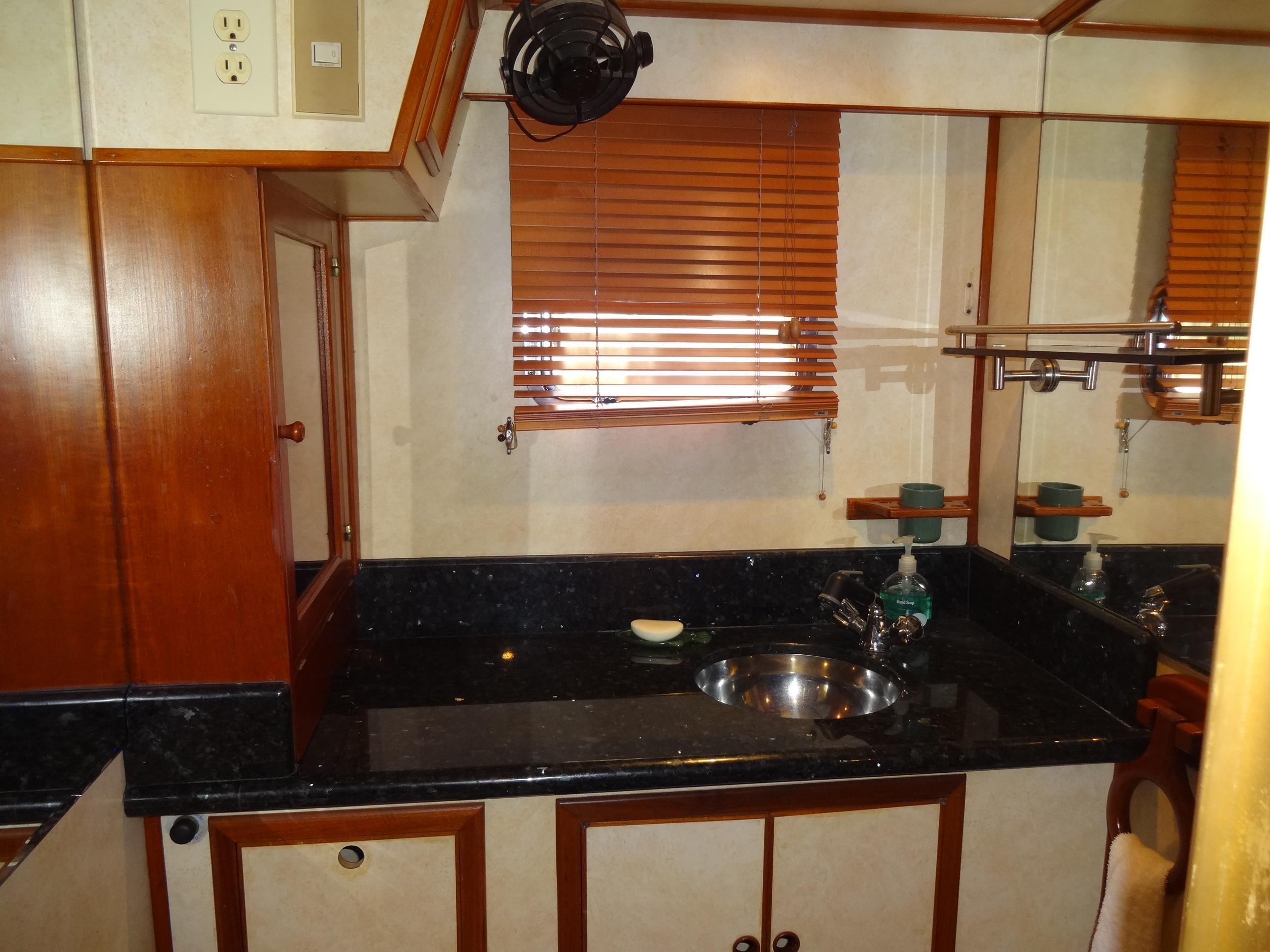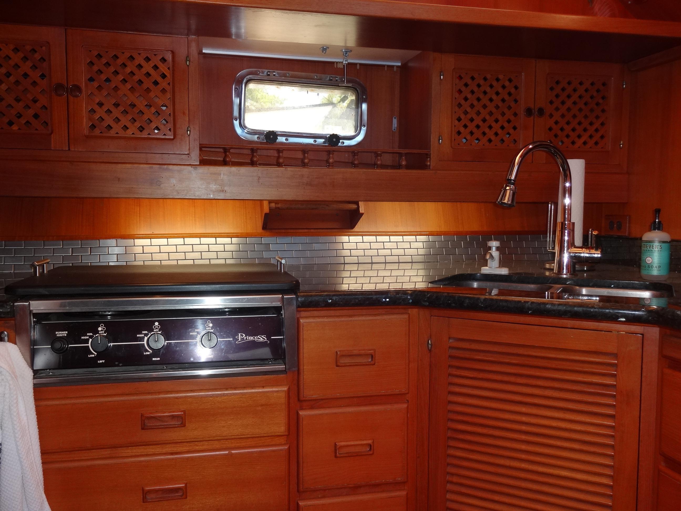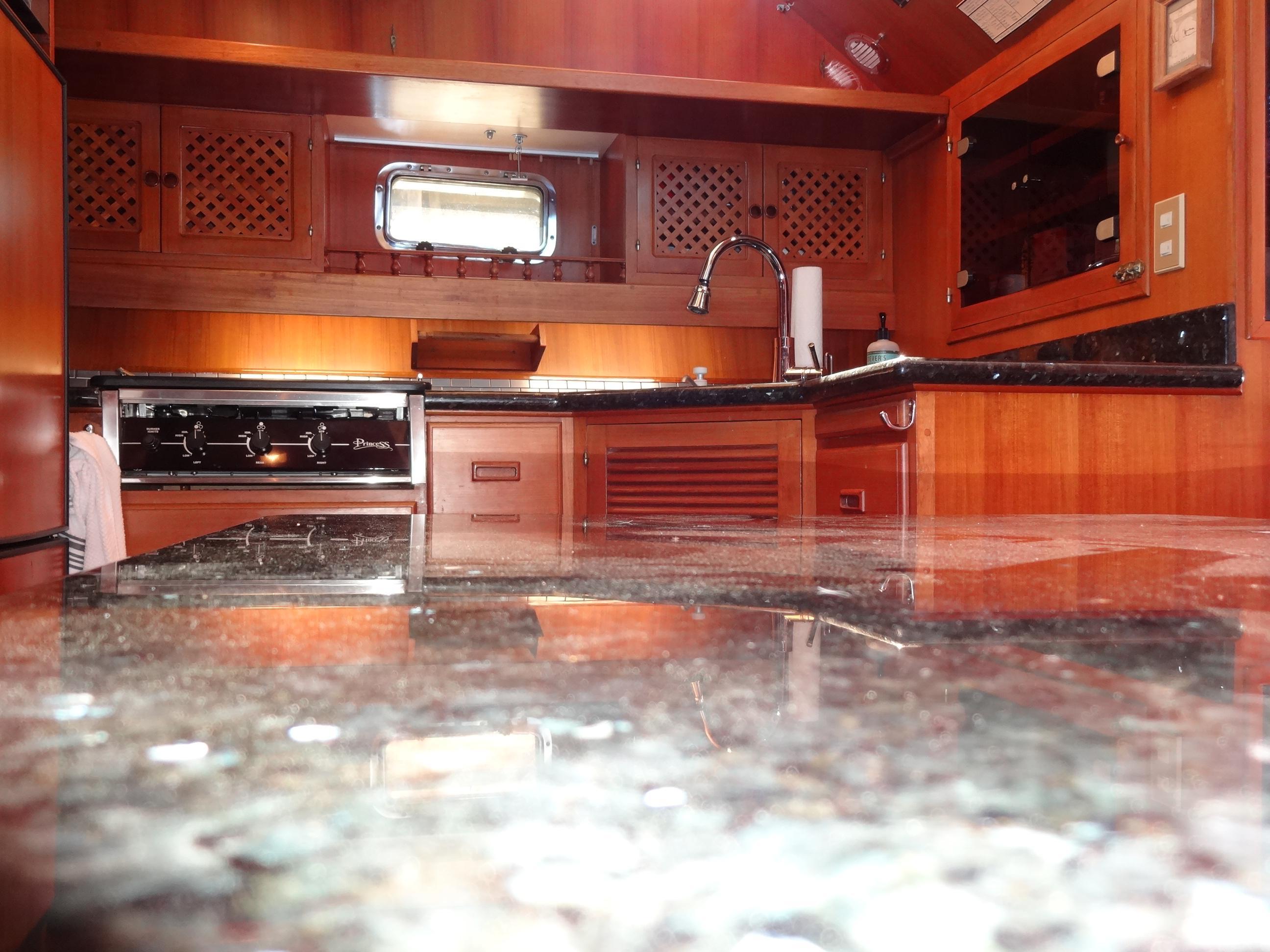 Notable features of the galley include Emerald Pearl granite countertops with a custom stainless-steel backsplash, deep dual stainless-steel sinks, and updated cushions and upholstery. The galley is equipped with a Princess three-burner propane stove, which is conveniently installed with a 20-pound tank on the dinghy deck, complete with a solenoid and safety switch. A large capacity 110V/12V refrigerator, a microwave/convection oven, and a Euro design mixer with a pull-out faucet head are also provided.