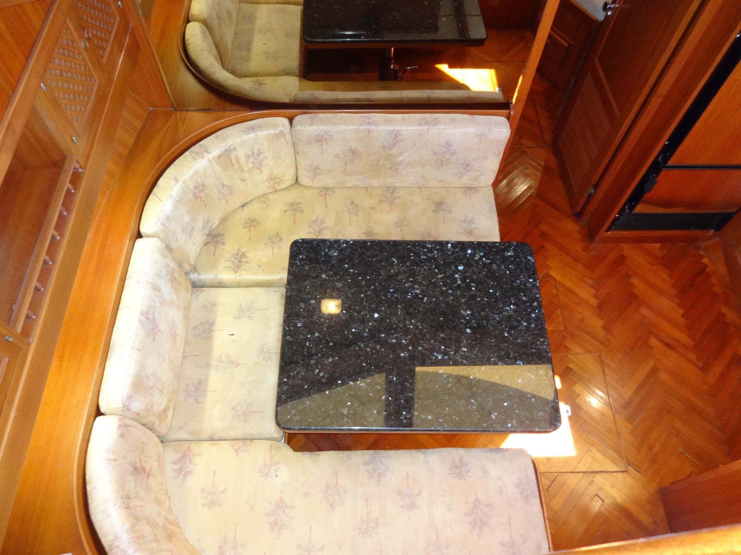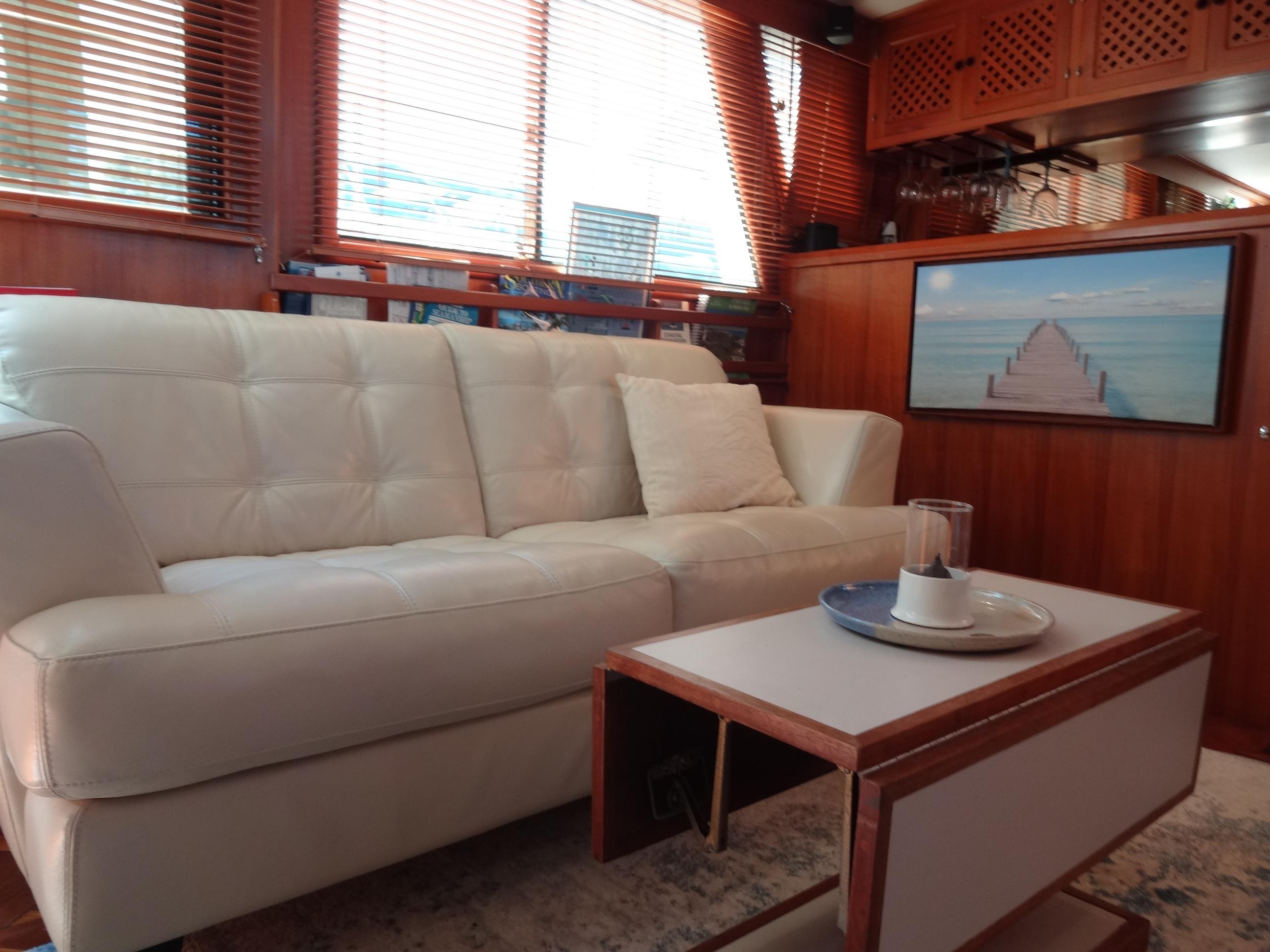 Experience the epitome of comfort aboard Bubbles Up. Accommodations include a centerline queen bed in the rear berth, over and under bunk beds in the forward stateroom, ample storage in beautiful teak cabinetry, custom hand-carved motives on teak doors, strategically placed cooling fans, and a dinette that converts to an additional double berth. Discover luxury and tranquility on the water.Salon