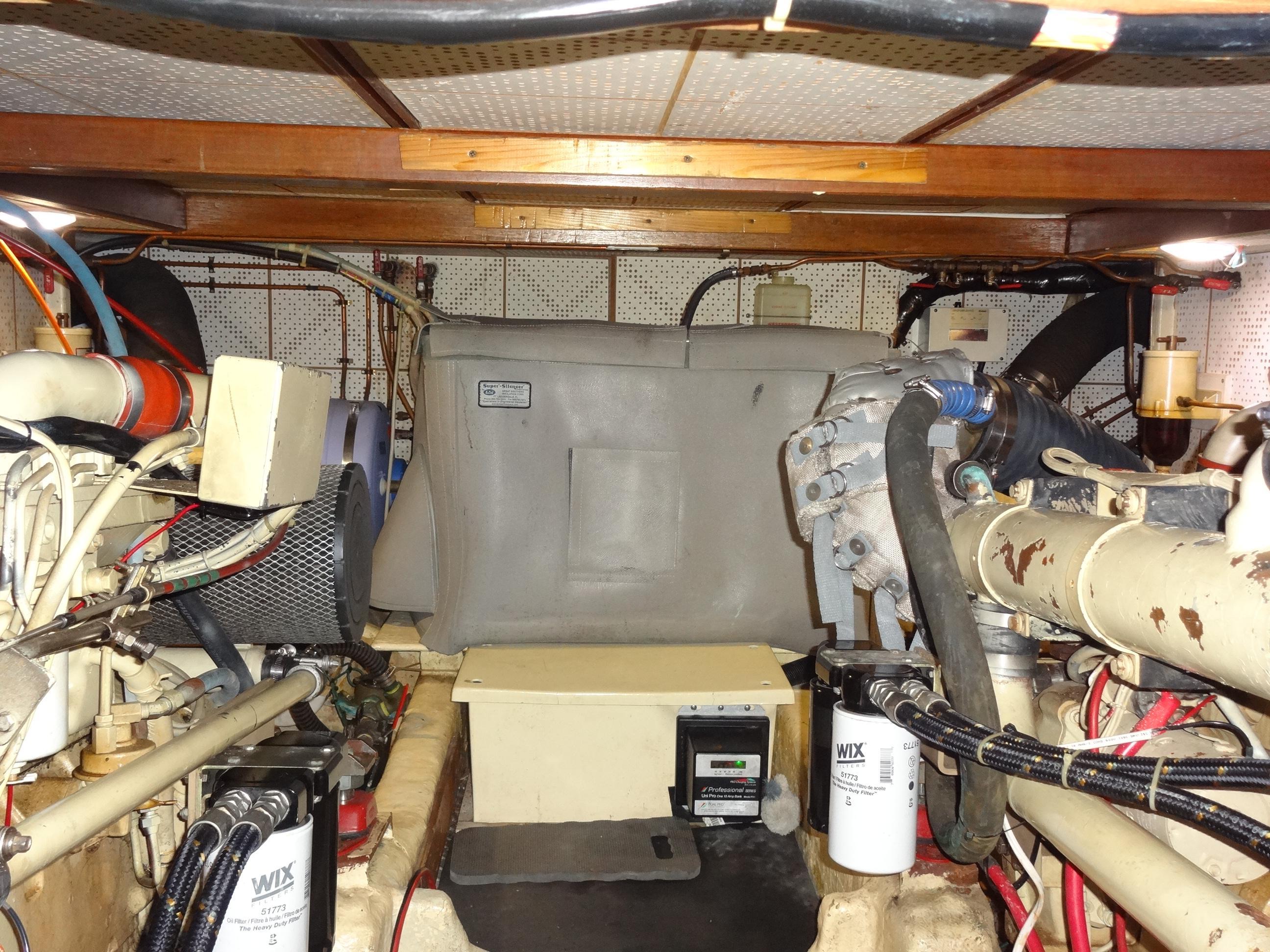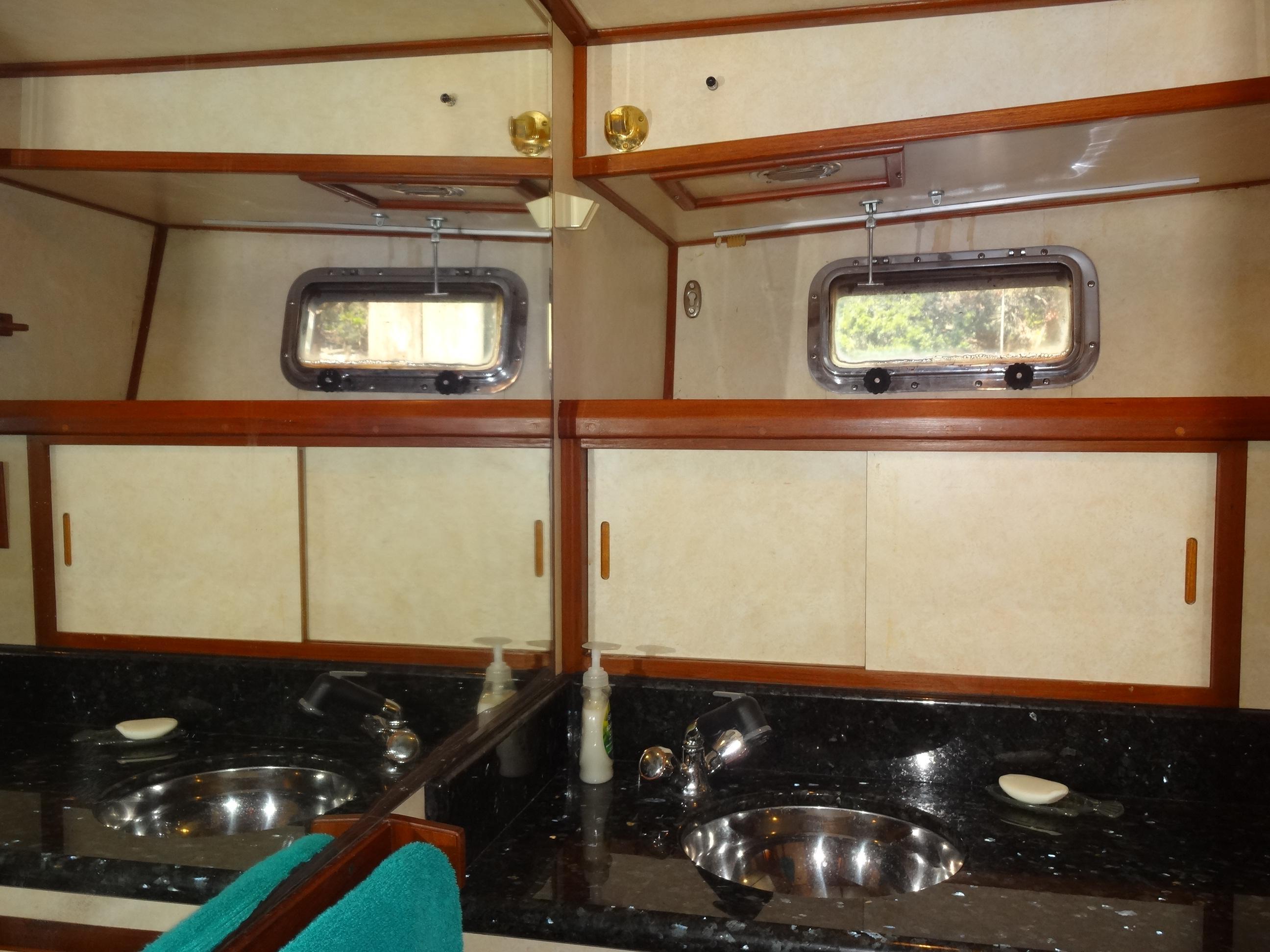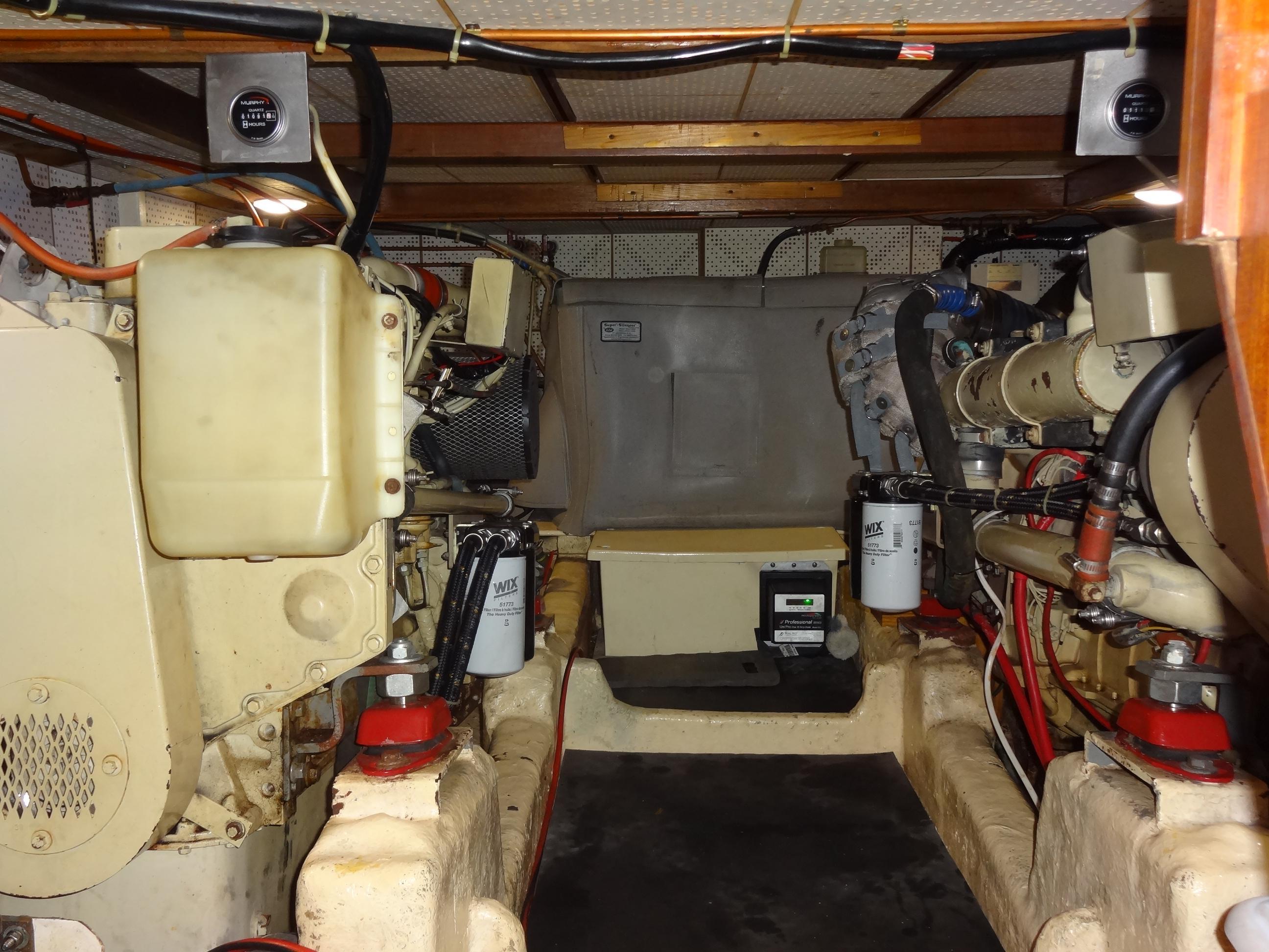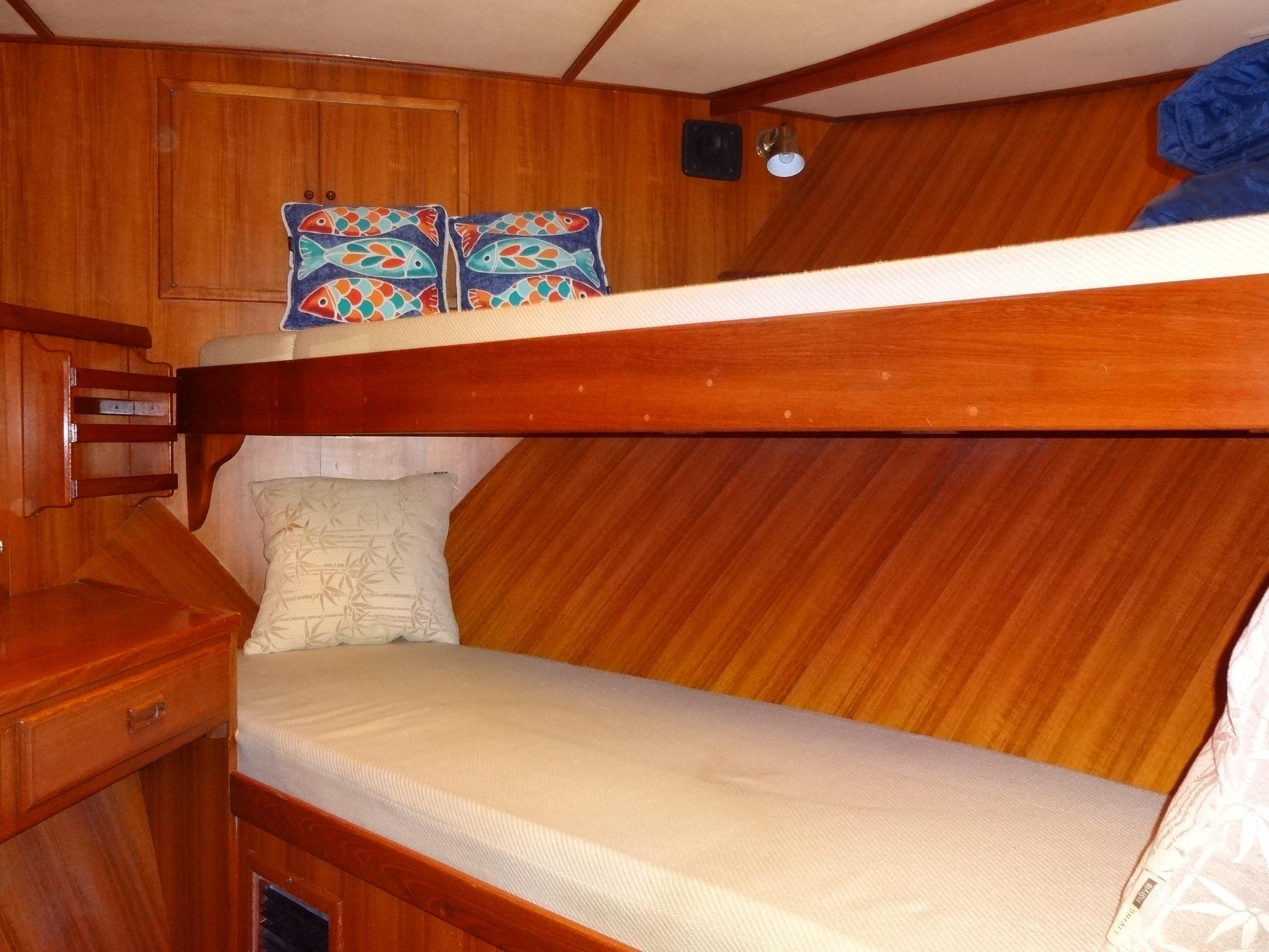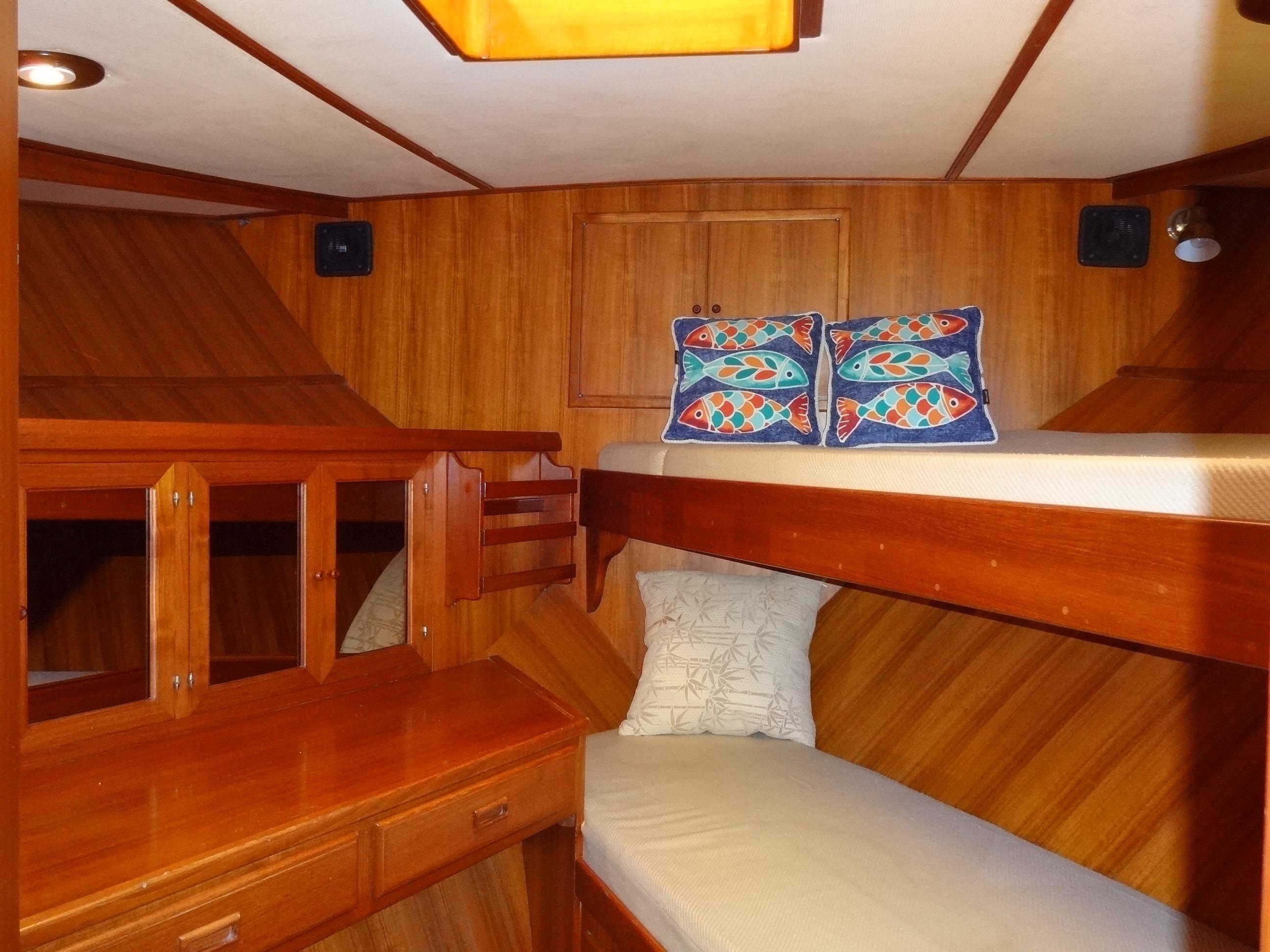 Powered by twin Cummins BT6 5.9-straight 6C diesel engines, each delivering 210 HP, this vessel ensures reliability, low maintenance costs, and ease of repair. The engines have been meticulously maintained at regular intervals and feature an Amsoil synthetic 15/40 conversion, dual oil filters for easy access, and a built-in electric oil change motor. The dual Graco pre-filtration fuel system and freshwater hot water bypass system enhance efficiency and convenience. Additional features include custom shaft collars, whale bilge pumps, and an automatic halon engine room fire extinguisher.Accommodations