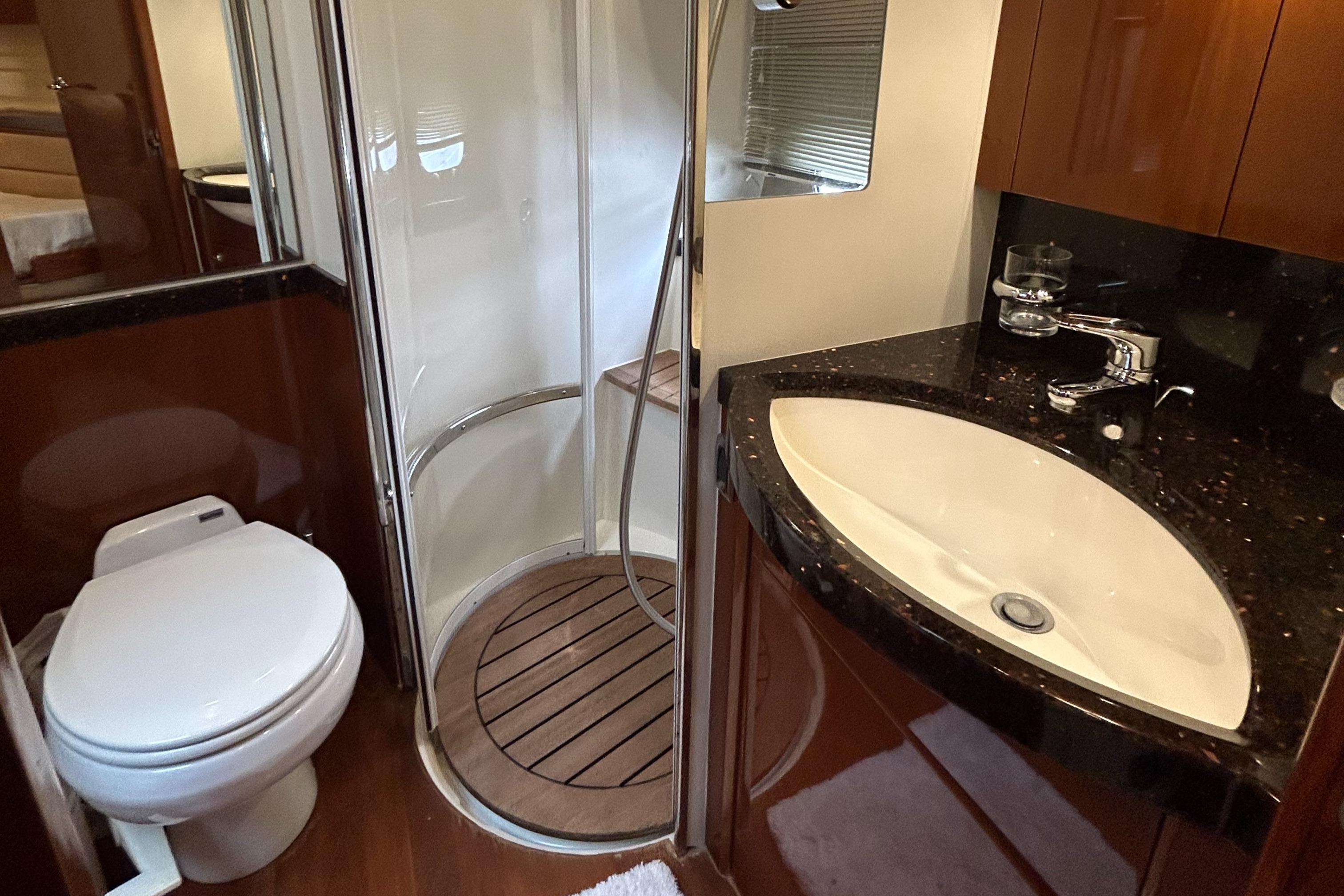 The staircase down to the accommodations deck is centerline, and steps lead down to three ensuite staterooms. Worth noting, this Princess is a three-stateroom yacht with a crew quarter aft, meaning the three interior staterooms are uncommonly large. The Master and VIP are roomy luxury style suites. The guest cabin is a side-by-side twin stateroom. There are no over/under style bunk rooms on UNIQ. Even the crew quarter is a side-by-side twin bed arrangement. Each stateroom has its own ensuite head with a stand-up stall shower.